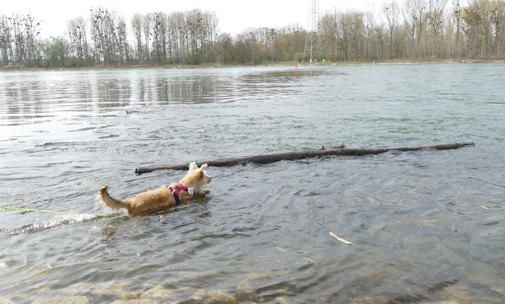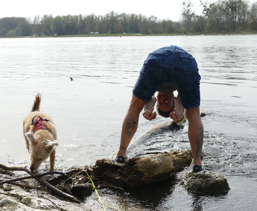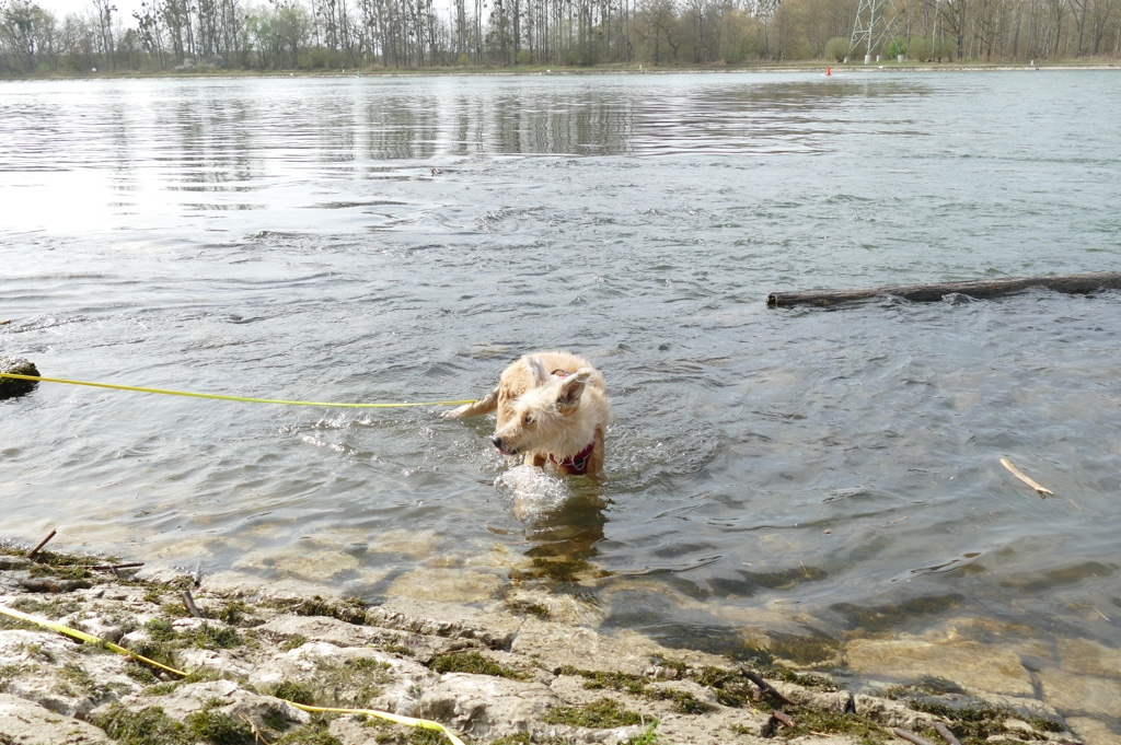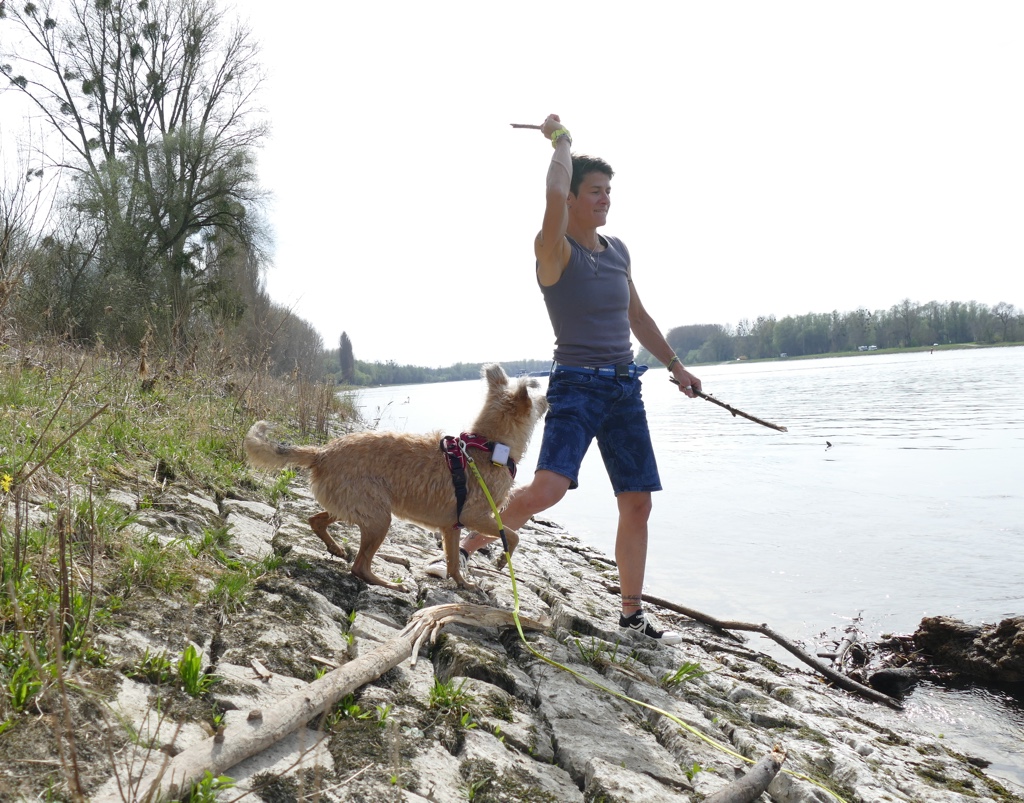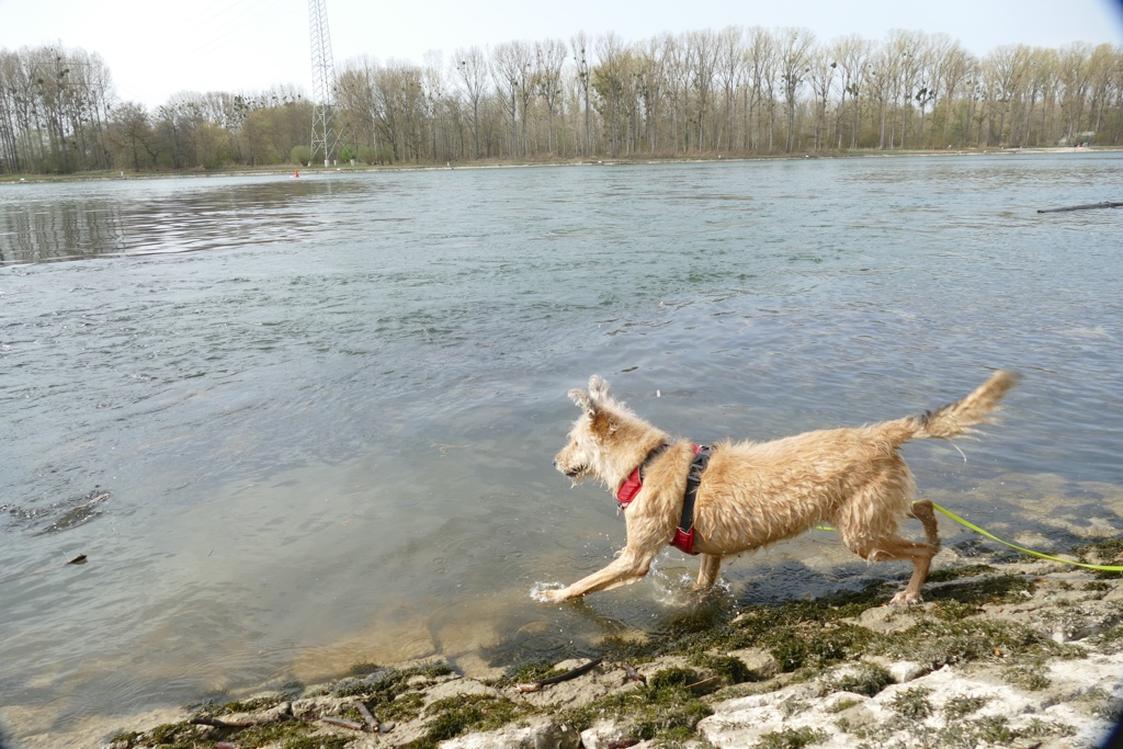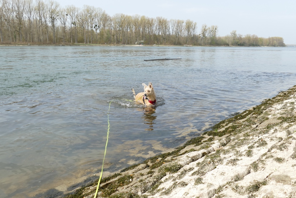 Am Donnerstag vormittag sind wir losgefahren und ich hatte schon schnell Gewissheit, dass wir zu Nici fahren. Hab ich schon erwähnt, dass sie ganz fantastisch wirft? Außerdem hat sie immer viele lustige Ideen, was wir so anstellen können. Frauli, Nici und ich sind schon gleich nach der Ankunft losgefahren, an den Rhein. Ich war vor Jahren mal am Rhein und da war es auch schon so toll. Diesmal hatten wir auch wieder total viel Spaß und ich konnte wunderbar im Wasser rumplantschen und auch schwimmen. Aber Frauli hat darauf bestanden, dass ich immer an der langen Leine bleibe. Sie meinte, dass die Strömung so stark ist, dass ich nicht dagegen ankomme. Orrr… wie langweilig!
