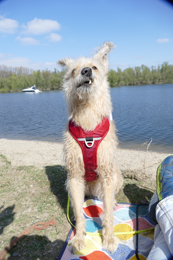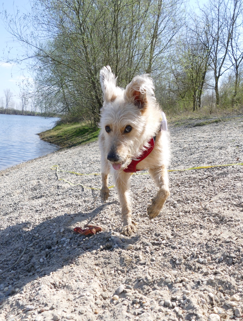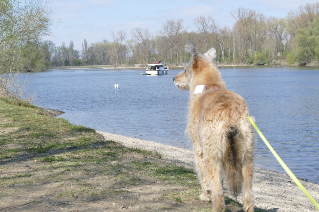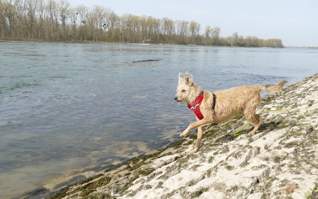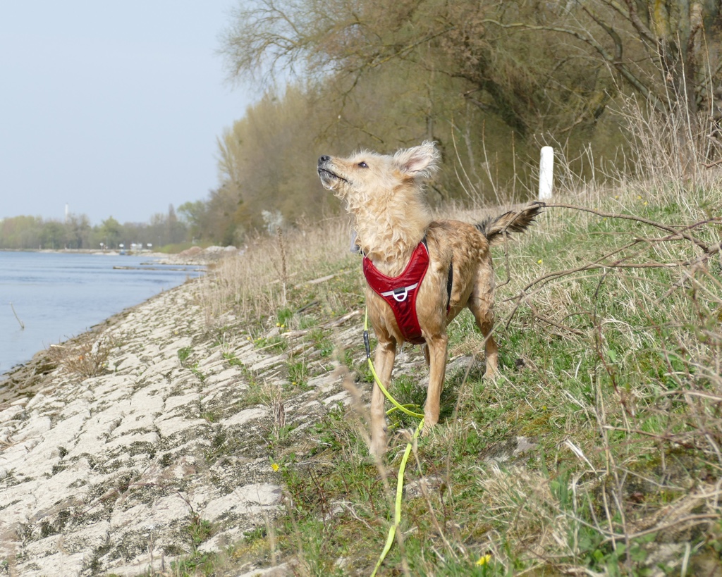 Der Rhein ist aber auch an der Leine sehr spannend. Habt ihr das schonmal beobachtet? Da hat es genauso tolle Wellen, wie am Meer. Da fahren dann große Schiffe vorbei und ganz lange nach denen kommen ganz große Wellen. Die sind bestimmt immer hinter den Schiffen her und kriegen sie nicht. Ich war total begeistert und bin immer in die Wellen gerannt, weil ich das am Meer auch so mache. Aber das Wasser schmeckt viel besser. Am Meer verzieht es einem ja das Gesicht, weil das Wasser so schrecklich schmeckt. Das müssen die mal ändern.