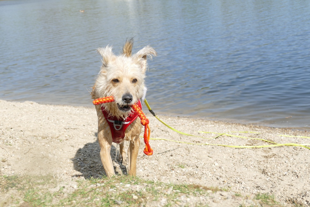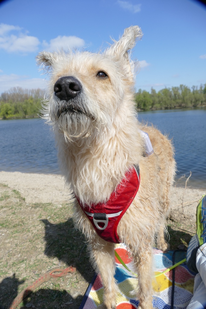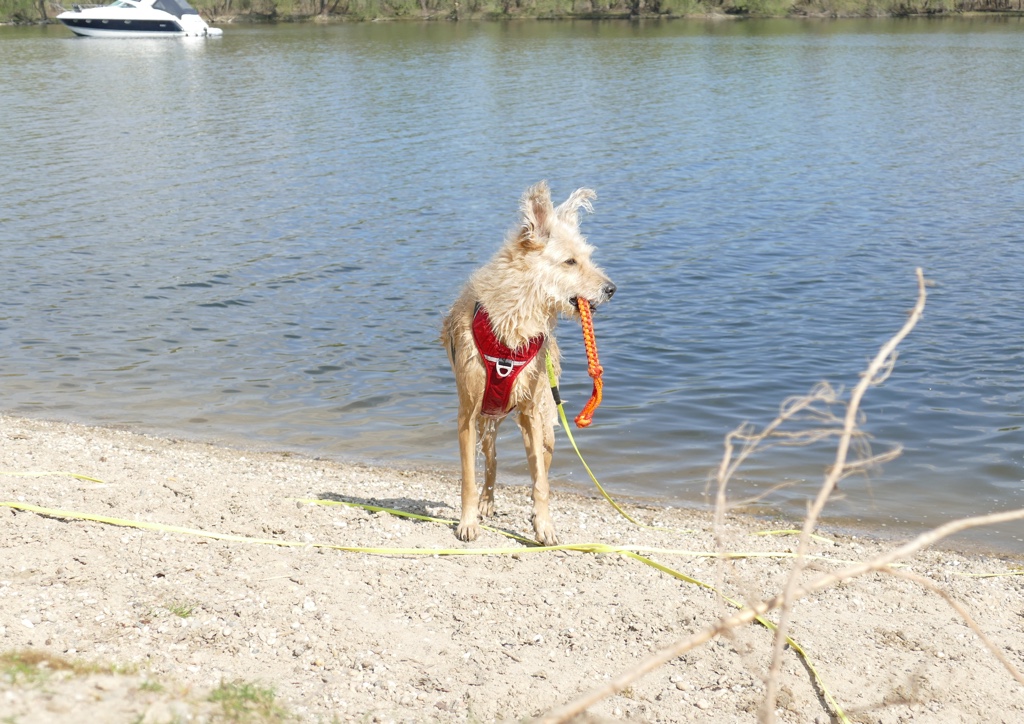 Am nächsten Tag sind wir auf die Insel Korsika gefahren. Ja, das war etwas weiter, aber sooooo schön. Wir haben eine schöne friedliche Bucht nur für uns alleine gefunden und ich bin im Sand rumgesaust und hab mich gewälzt und viele Stöckchen und mein Spielie geholt. Als dann der Wind nachgelassen hat, bin ich auch immer wieder ins Wasser. Da war die Strömung auch nicht so stark, weil wir am Altrhein waren und dort habe ich natürlich kaum ein Ende gefunden.