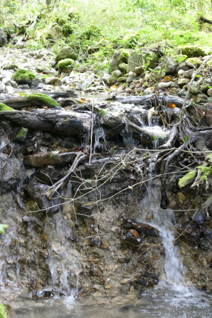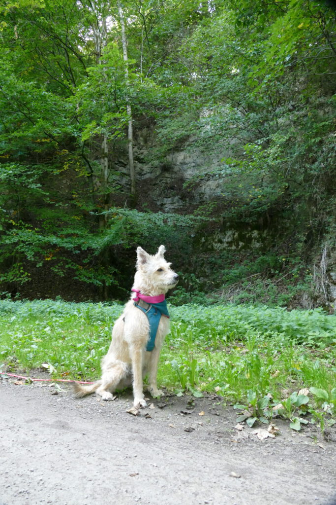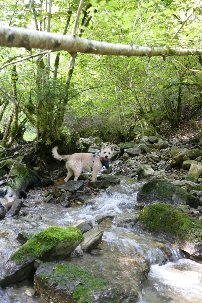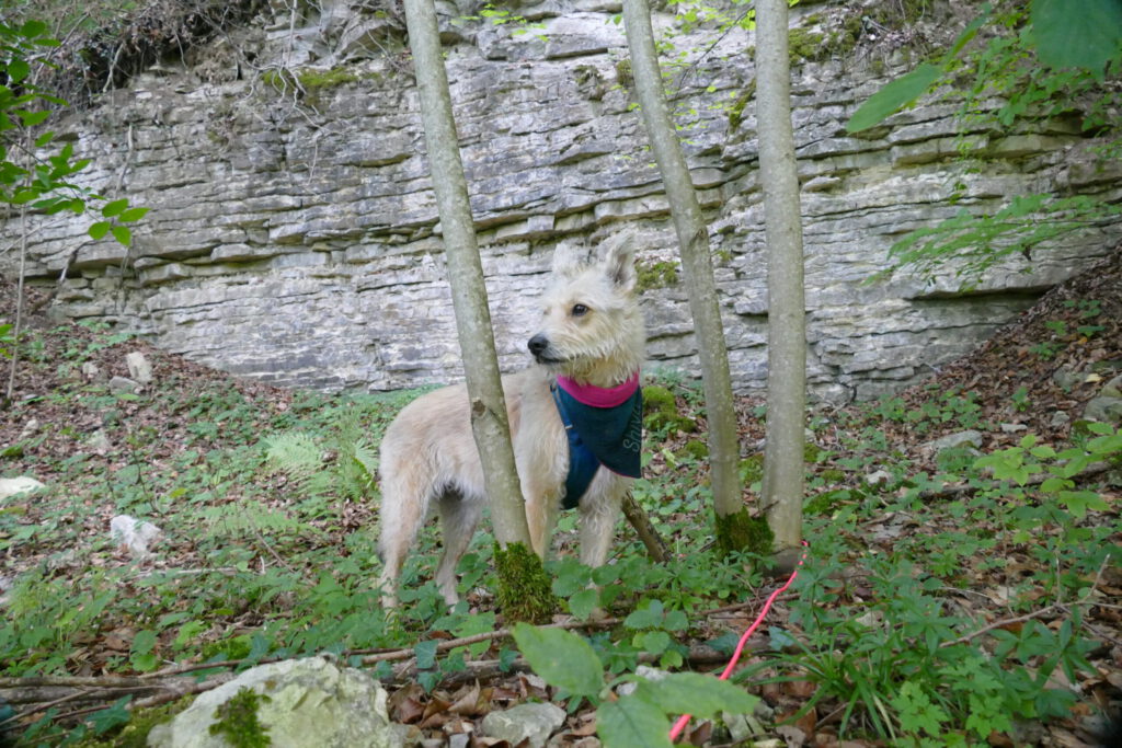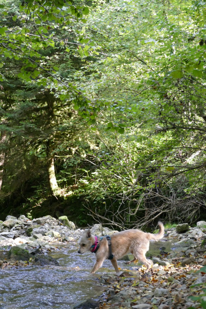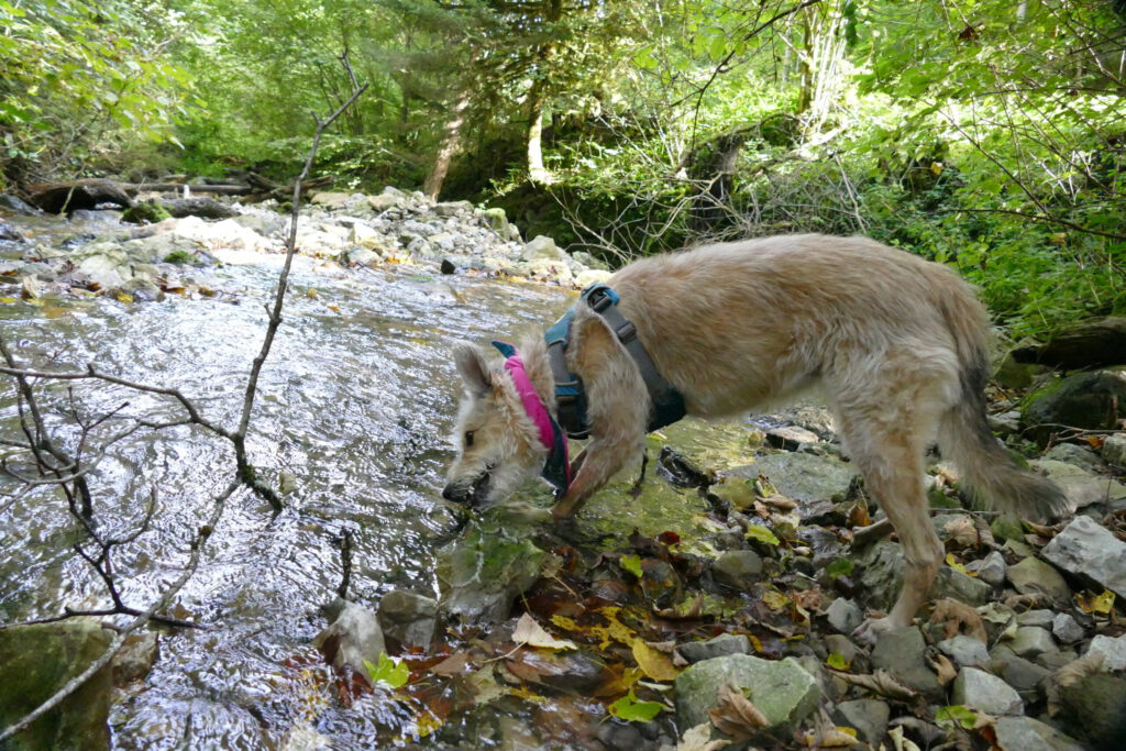 Also ging es für uns beide auf unserer geplanten Route weiter. Unser Weg führte uns nun recht steil nach unten in die Schlucht. Frauli brauchte ewig! Ich war schon 3x unten und wieder bei ihr, bis sie endlich unten angekommen ist. Unten war ein kleiner Bach mit Ministromschnellchen und sogar einem kleinen Wasserfällchen. Ich hatte unglaublich viel Spaß und bin im Wasser hin und her geflitzt und habe ordentlich Wasser getankt.