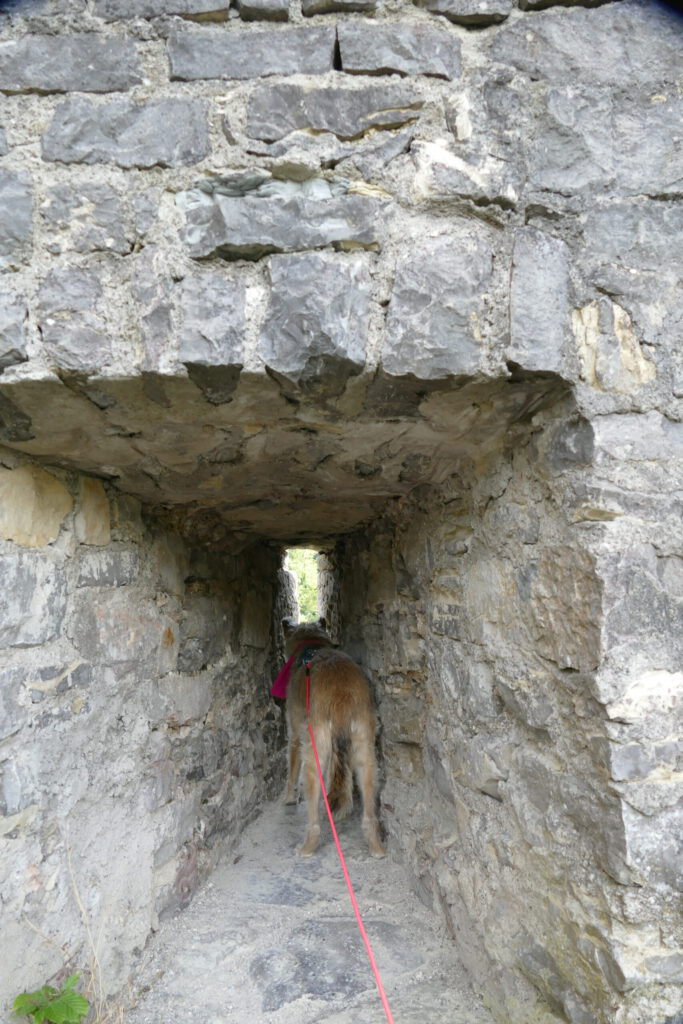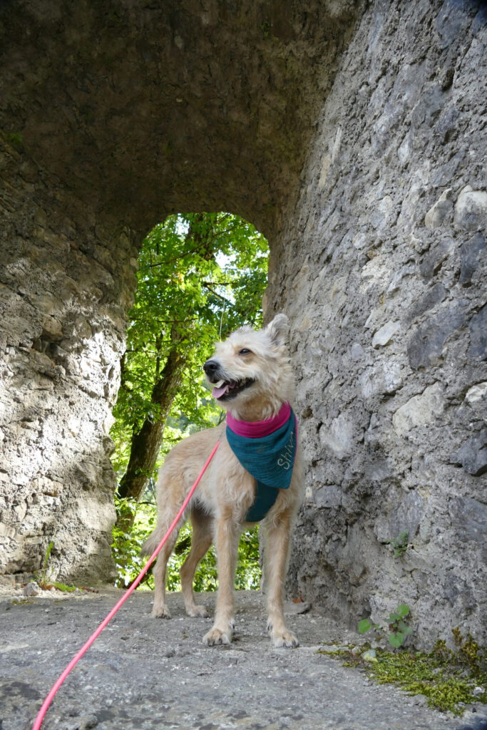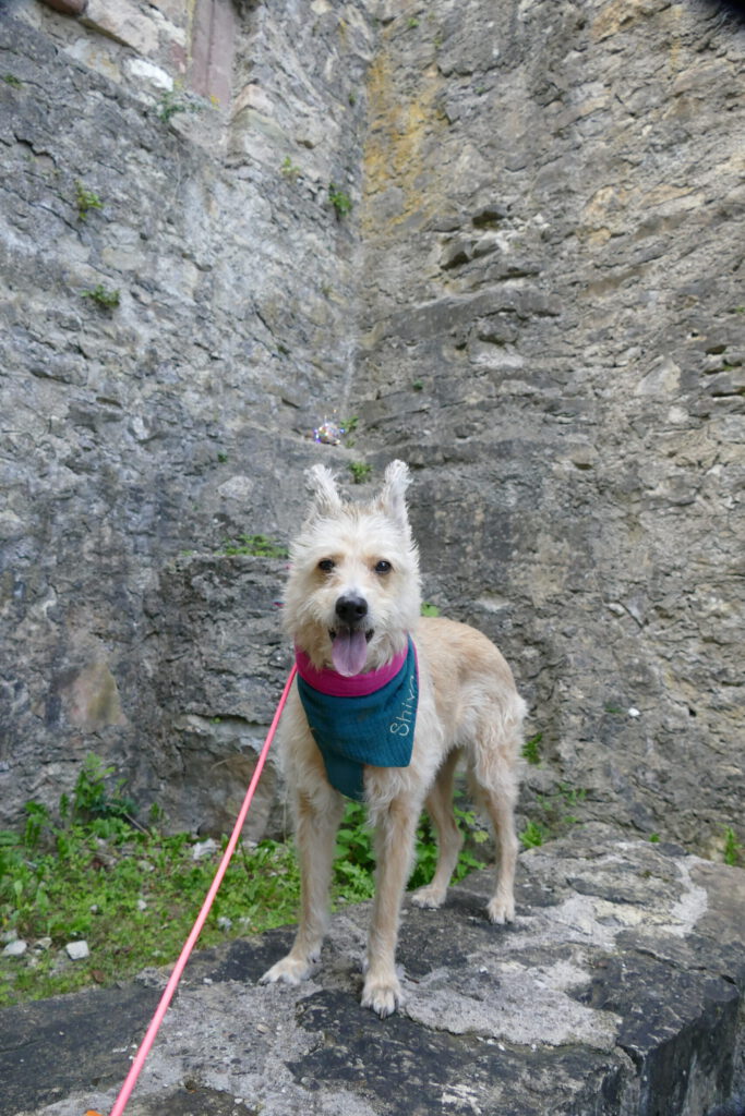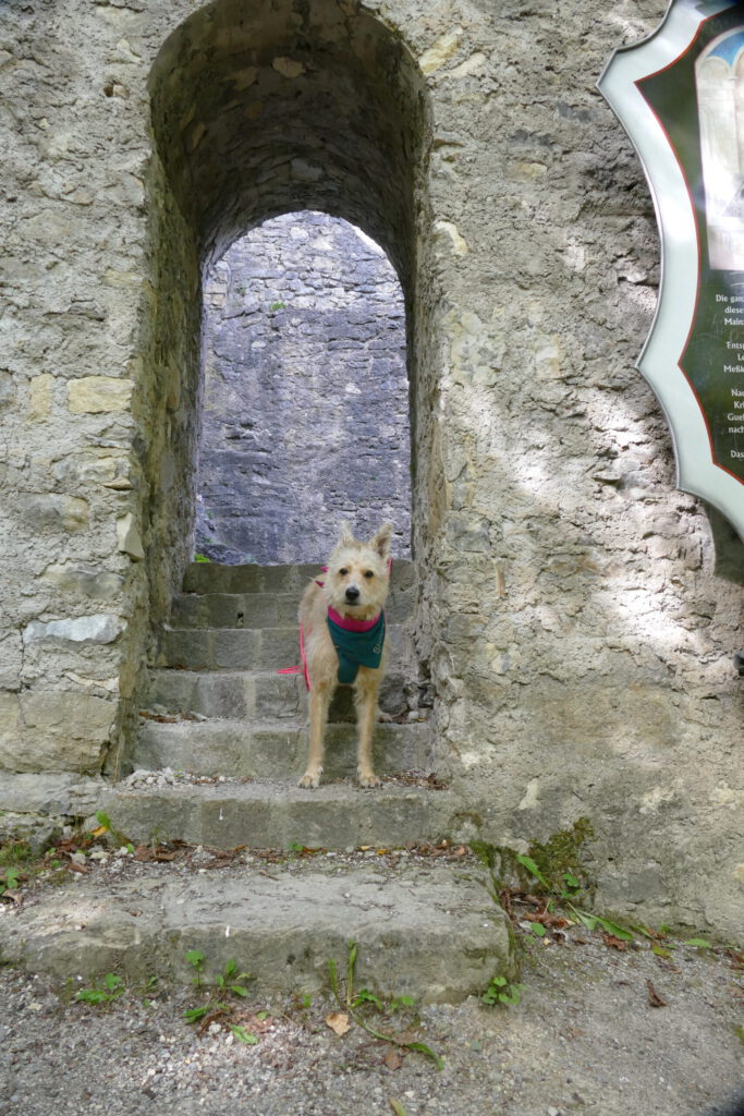 Der Mann wurde schnell instruiert, dass ich Angst habe und die Kinder einen Bogen laufen sollen. Das hat wundervoll funktioniert und so konnte ich aus einiger Entfernung beobachten, wie die Kinder sich gesammelt haben und unter viel Gekicher den nächsten Punkt einer Schnitzeljagt gefunden haben. Wir sind dann – ohne die Kinder – auf die Burg gestiegen und ich bin total tapfer und ganz alleine die Gittertreppe raufgekraxelt. Oben angekommen, konnte ich ausgiebig schnüffeln und mich umgucken. Ich habe auch die nächsten beiden Hinweise gefunden.