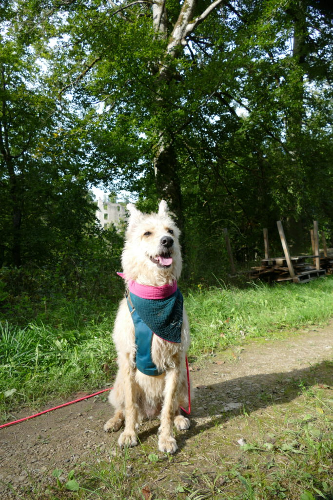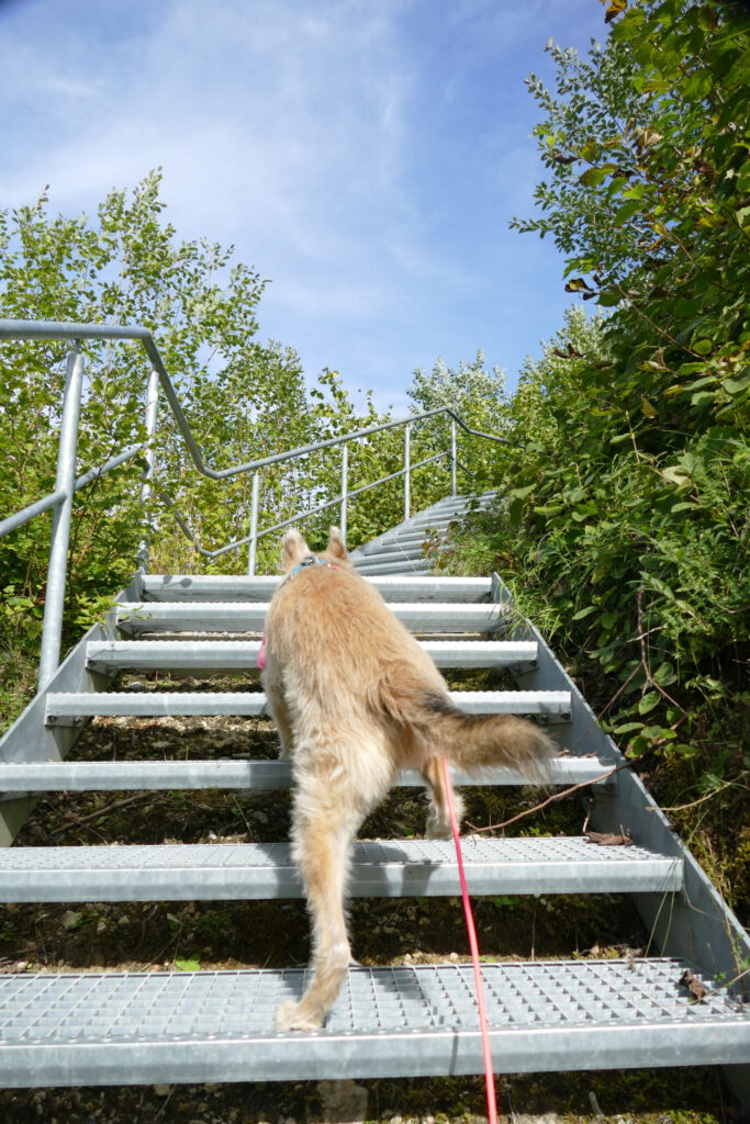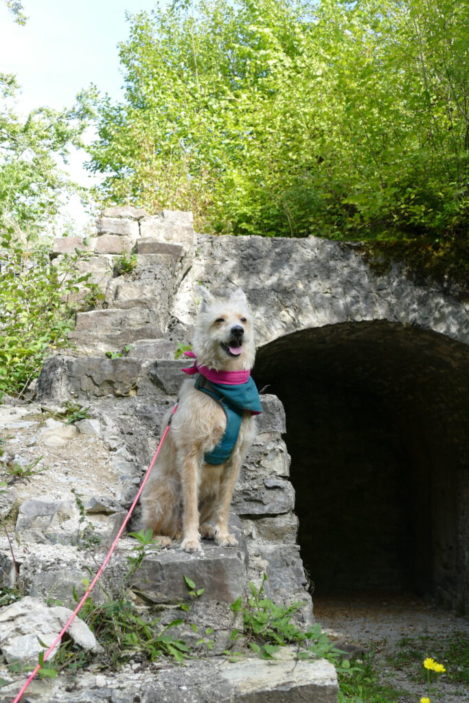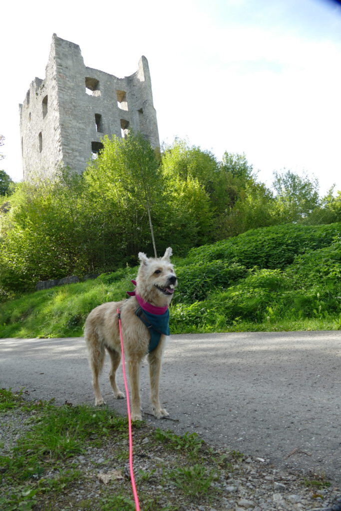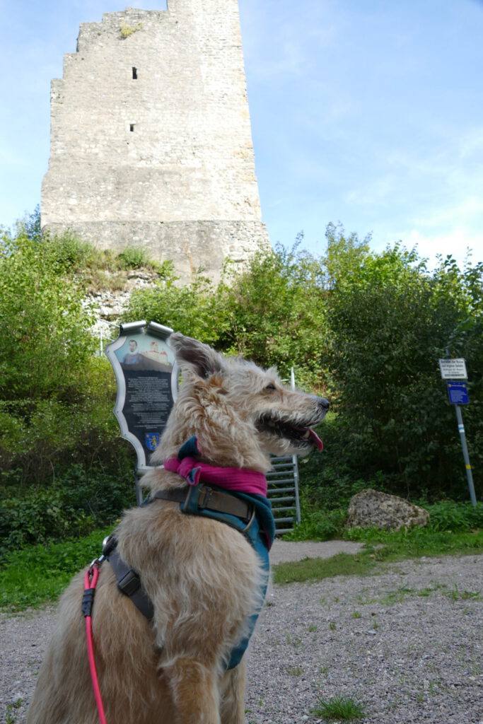 Der Mann wurde schnell instruiert, dass ich Angst habe und die Kinder einen Bogen laufen sollen. Das hat wundervoll funktioniert und so konnte ich aus einiger Entfernung beobachten, wie die Kinder sich gesammelt haben und unter viel Gekicher den nächsten Punkt einer Schnitzeljagt gefunden haben. Wir sind dann – ohne die Kinder – auf die Burg gestiegen und ich bin total tapfer und ganz alleine die Gittertreppe raufgekraxelt. Oben angekommen, konnte ich ausgiebig schnüffeln und mich umgucken. Ich habe auch die nächsten beiden Hinweise gefunden.