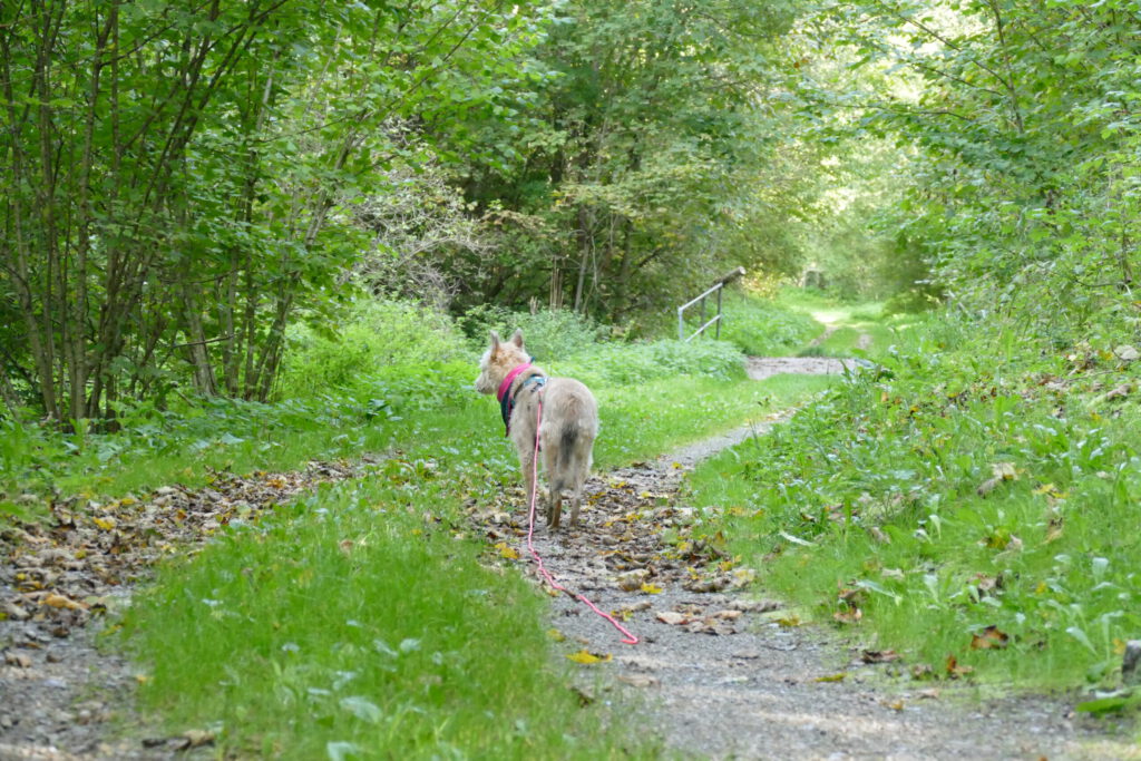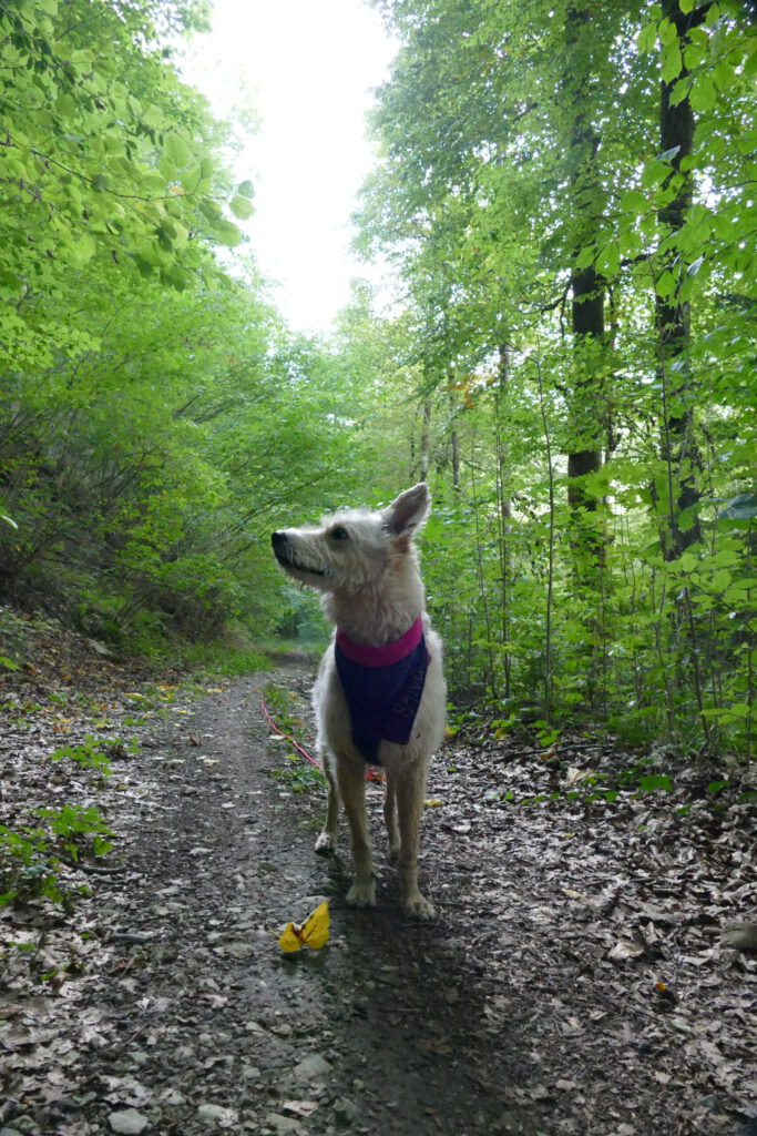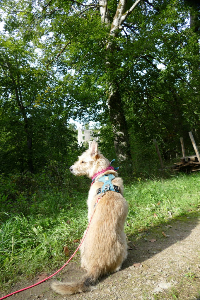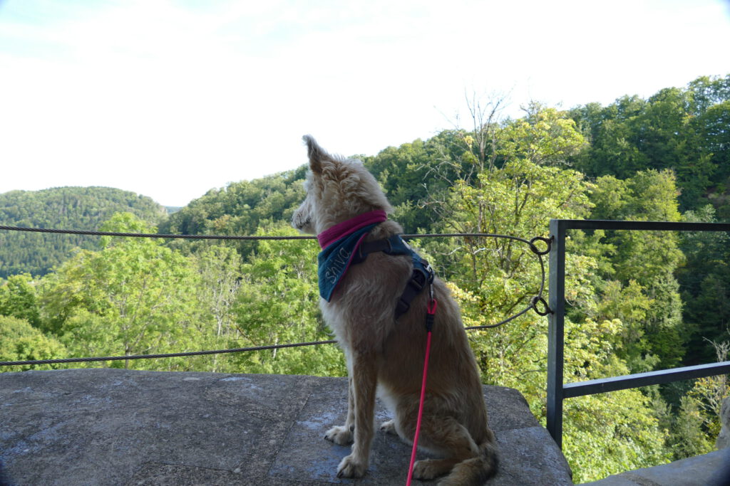 Nun kamen wir an eine Weggabelung. Rechts ging es geradeaus in den Wald und nach links ein bisschen bergab und in der Mitte begann recht unvermittelt eine tiefe Schlucht. Wir haben uns für links entschieden, weil die Burg wohl auf der linken Seite war. Erst war ich schon ein bisschen skeptisch. Aber nach kurzer Zeit waren wir im Wald und direkt neben uns plätscherte ein Bach – sehr weit unten – und wir waren total nur wir und es war soooo toll und gab soooo viel zu schnüffeln. Nach einer Weile hörten wir viele Kinder quasseln und quietschen. Aber Kinderlachen hört man ja immer sehr weit.