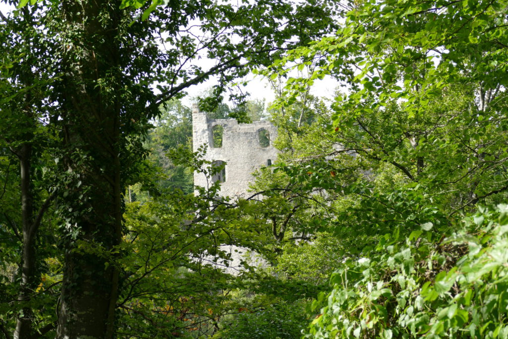 Der ursprünglich steile Weg wurde auch nach einer Weile wieder flacher und insgesamt war er wunderschön und wir konnten durch die Bäume immer wieder einen Blick auf die Burgruine auf der anderen Seite erhaschen. Dann kamen wir an eine größere Lichtung und dort lagen sehr viele Bäume und auch Baumaterialien aufgestapelt. Was das hier wohl war? Frauli nutzte die Gelegenheit für ein paar unvermeidliche Selfies zur Burg rüber und dann stiefelten wir weiter.