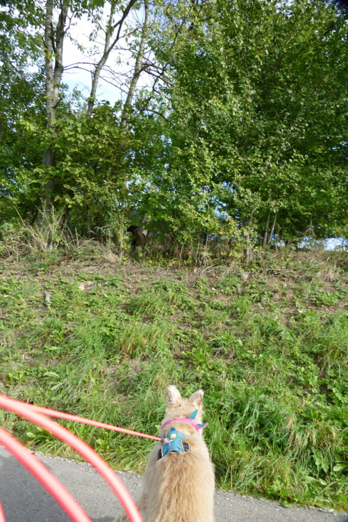 Zunächst konnte ich Fraulis Aufregung gar nicht verstehen. Was quietscht sie denn so rum, wenn es einfach auf einer Asphaltstraße den Berg runter geht? Direkt am Weg war etwas höher gelegen ein eingezäuntes Stück Wiese hinter Büschen und Bäumen verborgen. Ich habe sie gleich gehört und gerochen, aber Frauli ist ja so dusselig. Erst nachdem wir schon fast vorbei waren, quietscht sie plötzlich los und freut sich nen Ast, weil da Kamerunschafe weiden. *kopfschüttel*