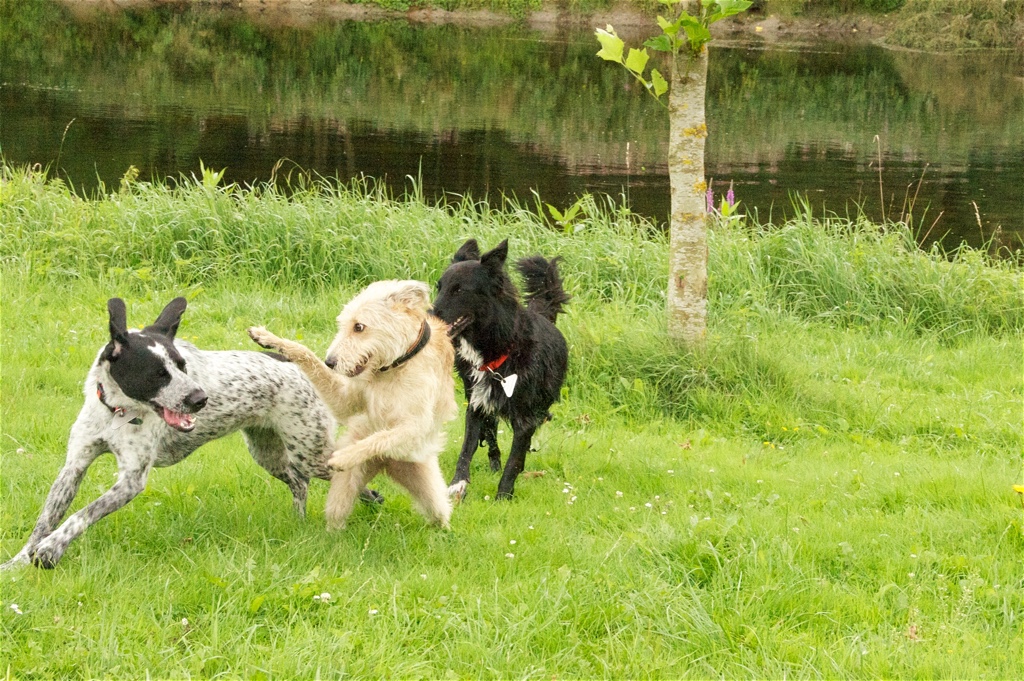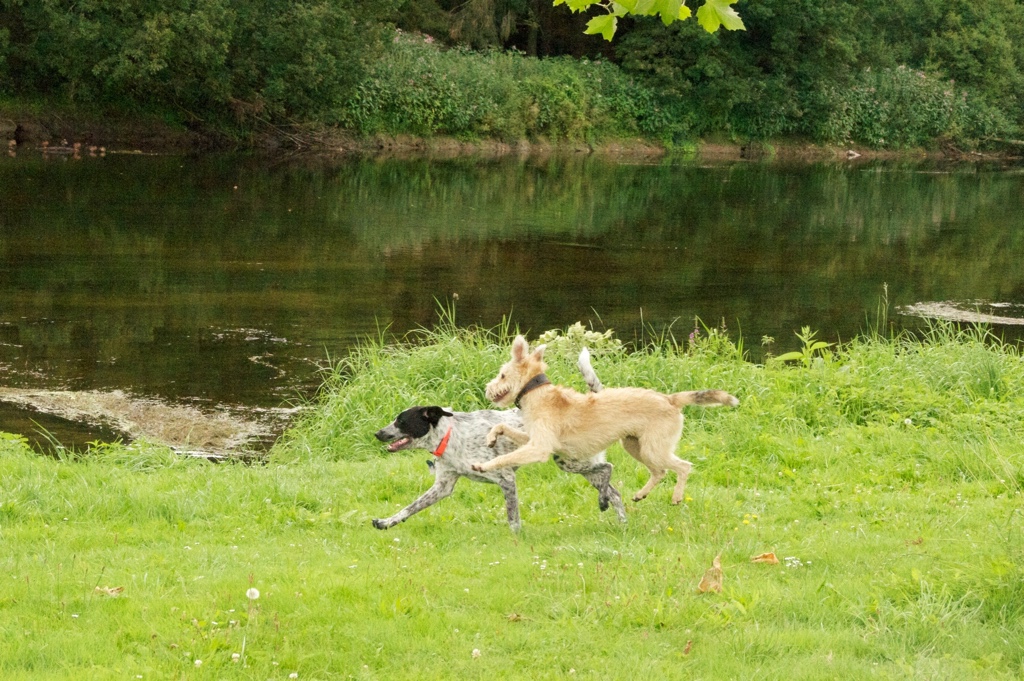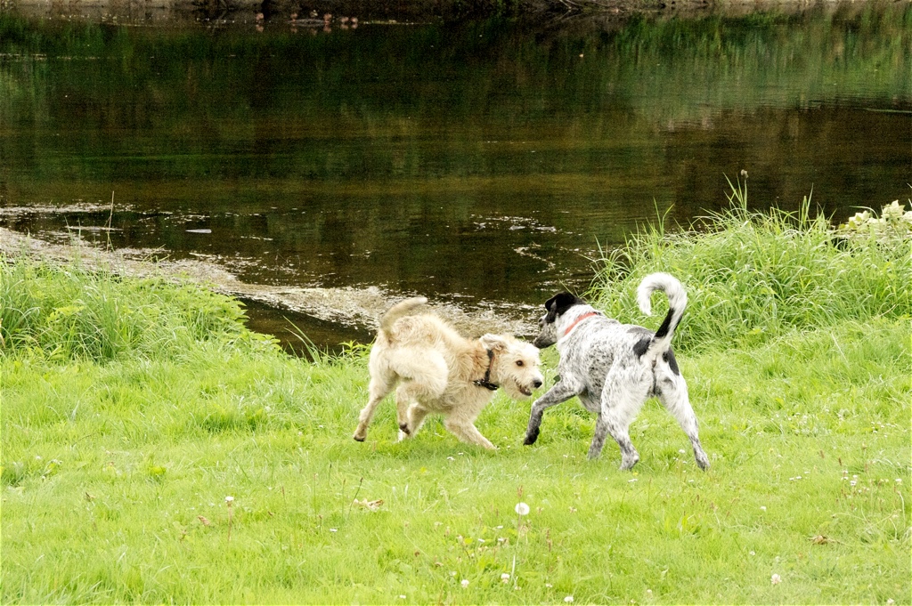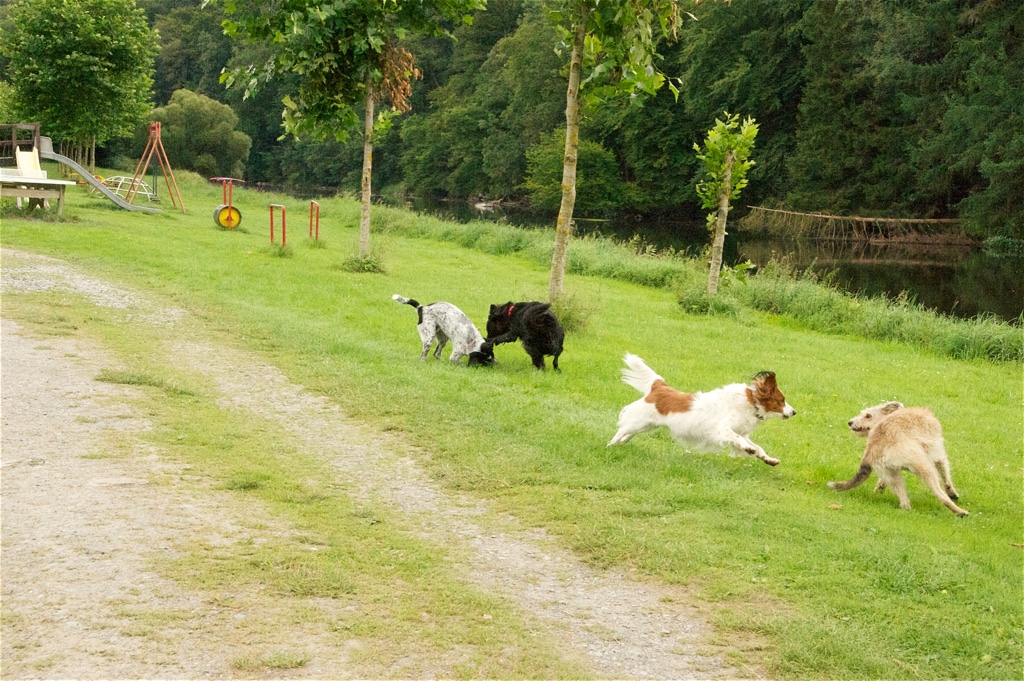 Dort angekommen, gleiches Spiel wie am Rhein. Ich im Auto – ich will raus!!! und Frauli checkt ein. Kurze Zeit später haben wir ausgeladen. Diesmal sah es aus, als würden wir eine längere Zeit dort bleiben, weil Frauli viel mehr ins Zelt gepackt hat. Dann haben wir uns an die Erkundung der Gegend gemacht. Ein toller Fluss (ich war gleich mal schwimmen), ein Wald und viel viel Wiese. Die Menschen sprechen ja alle ziemlich unverständlich, aber hier war es der Hammer, die hat nicht mal Frauli verstanden.