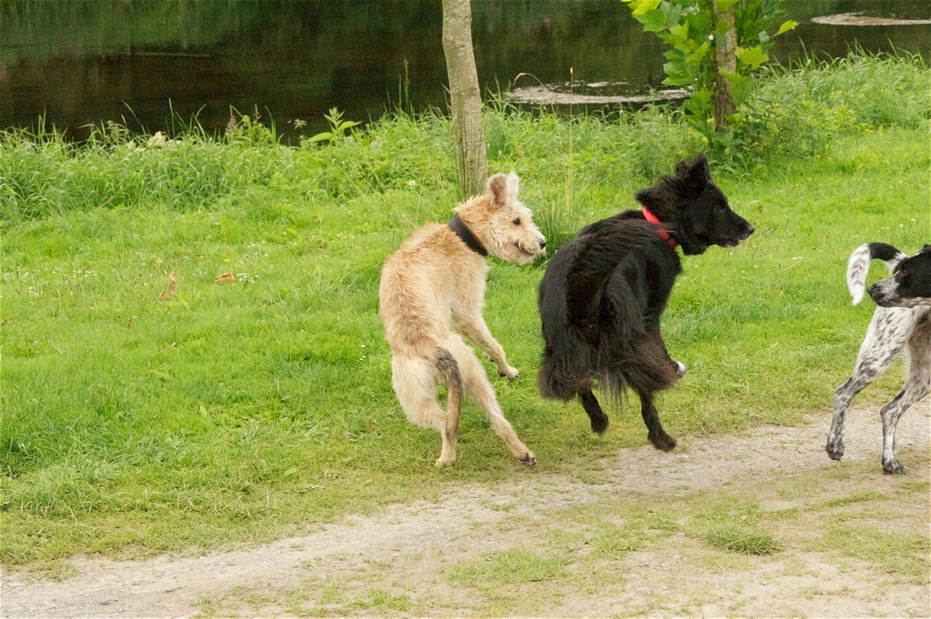 Frauli hat dann Kontakt mit Freunden aufgenommen, die in der Nähe wohnen. Dort ging es dann hin und ich habe Leya, Letho und Naiko kennen gelernt. Mit Leya konnte man so richtig toll toben. Naiko war der Boss und Letho ist noch ängstlicher als ich. Abends sind wir noch auf ein Fest und lecker was Essen gewesen und dann war ich sooooo müde und bin nur noch in meine Box gekrabbelt, um zu schlafen.