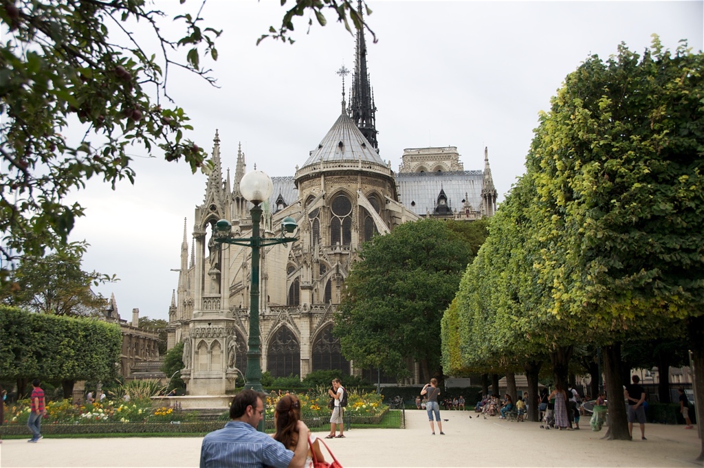Dann ging es auf Erkundungstour. Ausgerüstet mit der Kamera, einem Rucksack und einer Straßenkarte haben wir uns auf den Weg gemacht. Frauli wollte unbedingt ein paar Sehenswürdigkeiten sehen. Äh… ja, so ähnlich hat sie es gesagt. Mein lieber Schieber… ich sag euch, wir sind was über Asphaltwege gelatscht, dass die Pfoten gequalmt haben. Frauli war hinterher fix und foxy. Aber der Reihe nach. Nach einer ewiglangen Wanderung hat Frauli den Platz erreicht, den sie gesucht hat. Notre Dame.