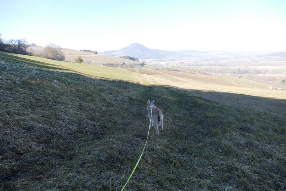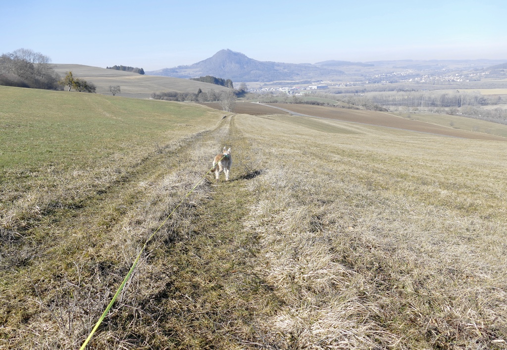 Wir sind also bestens gelaunt und hochmotiviert loggegondelt. Schließlich besteigen wir nicht jeden Tag einen Berg. Nur zwei Autos auf dem Wanderparkplatz. Na, das lässt sich sehen. Also Schleppleine rangerödelt und losgelaufen. Aber sobald wir um die nächste Ecke waren, haben wir das Grauen gesehen. Fast bei der Burg oben gibt es einen weiteren Parkplatz und der war über und über voll mit Autos und auch auf der Straße haben sie schon geparkt. Die Burg war quasi schwarz vor Menschen und auf jedem noch so kleinen Zipfel Berg stand jemand. Äh… okay, ohne uns! Wir haben dann einen Rundweg gewählt, der uns im weiteren Verlauf entweder um den Mägdeberg herum geführt hätte oder bis zum Hohenstoffeln. So weit sind wir aber nicht gekommen.