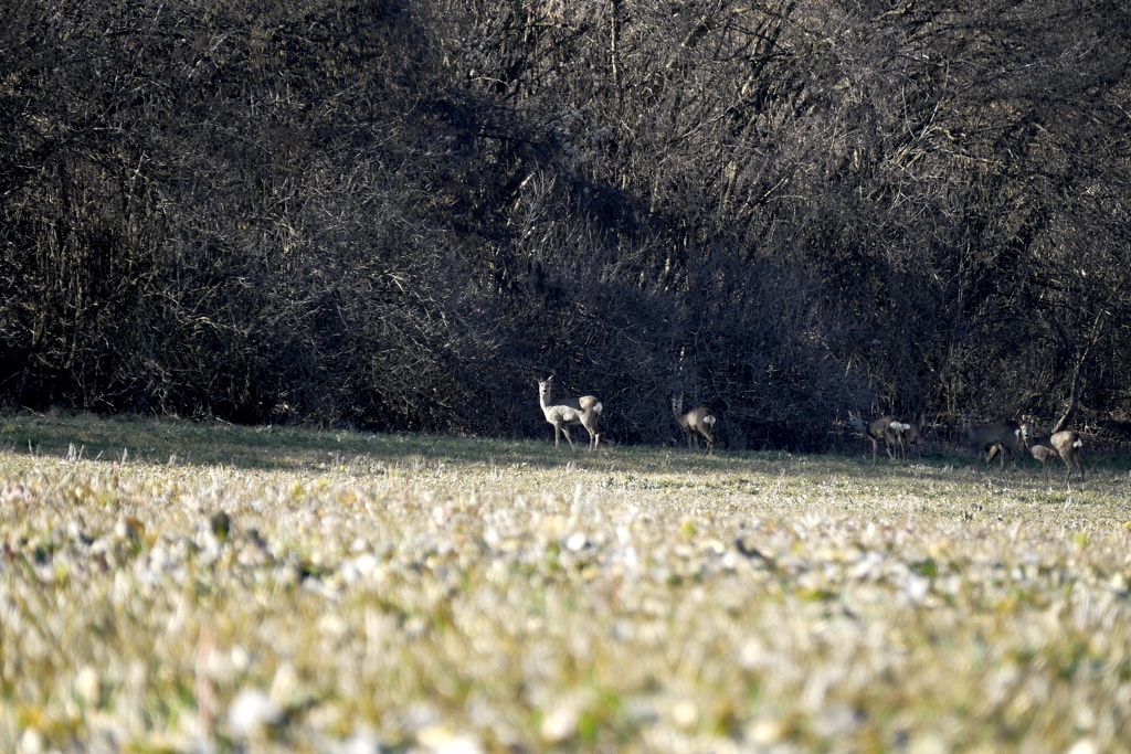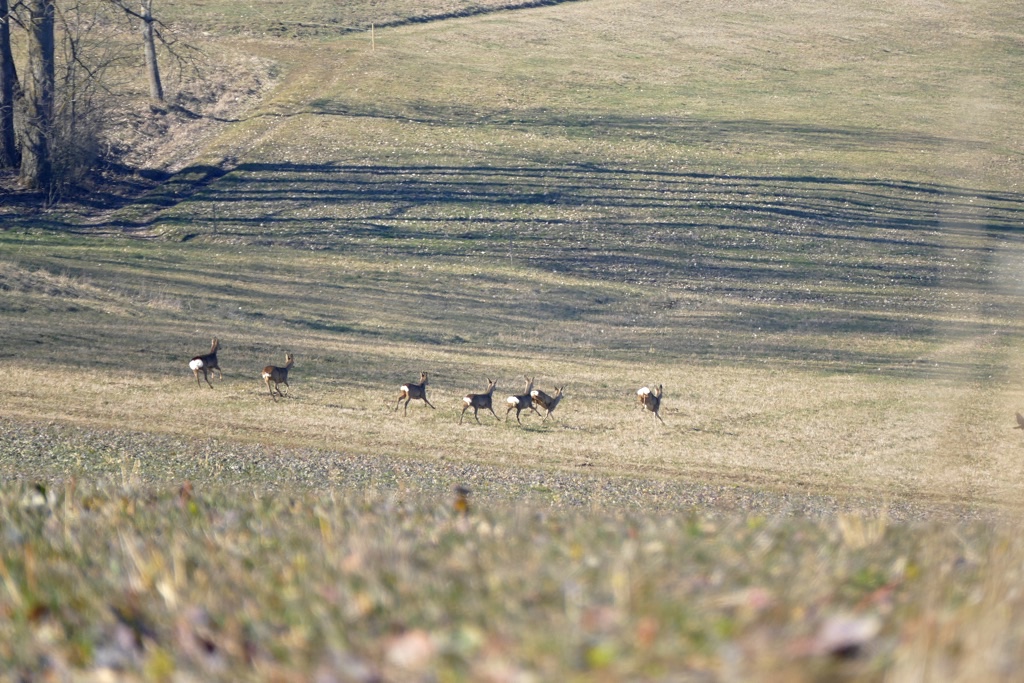 Da waren sie! 5, 6, 7 Rehe! Direkt an der Baumreihe. Keine 100m entfernt. Hach, ich hätte so einen tollen Rehbraten besorgen können. Aber was ist??? Frauli hat mich am Strick des Verderbens. Als ich durchstarten wollte, hab ich es schon gemerkt, da hängt was schweres dran. Grade eben hatte sie die Leine noch schleifen lassen. Entweder hat sie die Rehe auch gesehen oder die Leine aus irgendwelchen Gründen, die nur sie kennt in die Hand genommen. Aber sie hat sie gehalten. Menno! Ich war so gut drauf. Naja, kann ich nichts machen. Leider. Außer sehnsüchtigen Blicken war nichts drin und die Rehe sind aufreizend langsam mit auf- und abhoppelndem weißen Hinterteil die Wiese langgezockelt. Wegen den Rehen haben wir auch unsere Route geändert und sind nur den Höhenweg hin- und wieder zurückgelaufen. Wir wollten sie ja nicht in Richtung Autobahn scheuchen. Gesehen haben wir sie noch mehrfach und auch einmal welche auf der anderen Seite, die den Berg runterkamen.