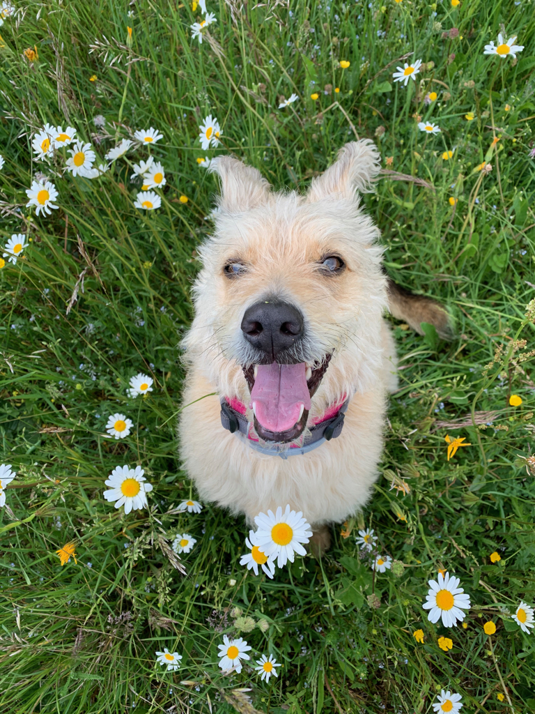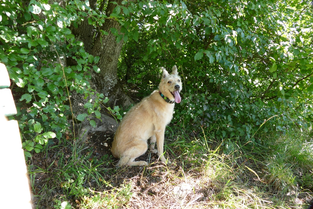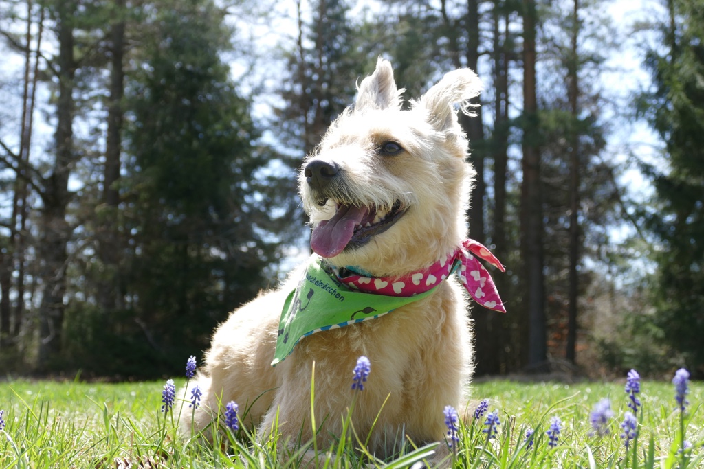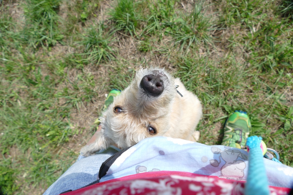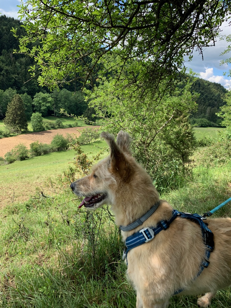 Hier sind wir am Liebsten, aber im Sommer ist es oft zu warm, da eigentlich Sonne pur ist. Es gibt aber auch ein paar nette Graswege am Waldrand und dort kann ich wunderbar flitzen und mich im immer feuchten Gras wälzen. Frauli verbringt dort oben sehr viel Zeit mit mir, weil die Aussicht toll ist und wir einfach so richtig unter uns sind. Was sie manchmal ein bisschen nervt ist die Tatsache, dass ich gerne ins Glotzen komm… Wenn auf unserer Wiese ein anderer Hund auftaucht, dann muss ich ich doch schließlich gucken. Sie findet das blöd, weil sie meint, dass der ja schließlich weit weg ist, aber ich bin der Meinung, dass gucken nicht schadet.