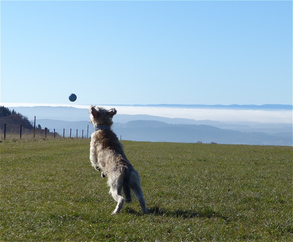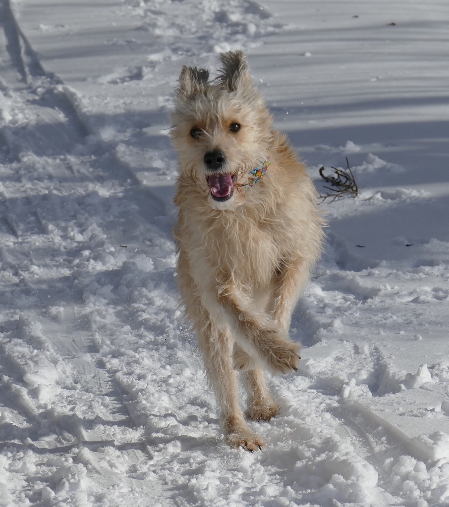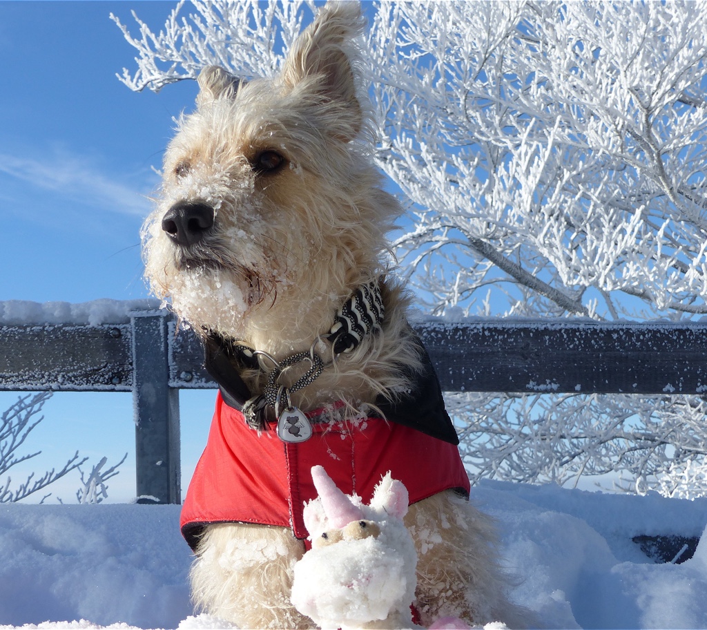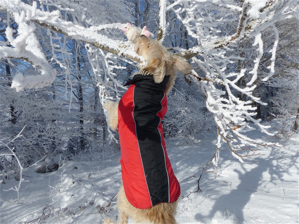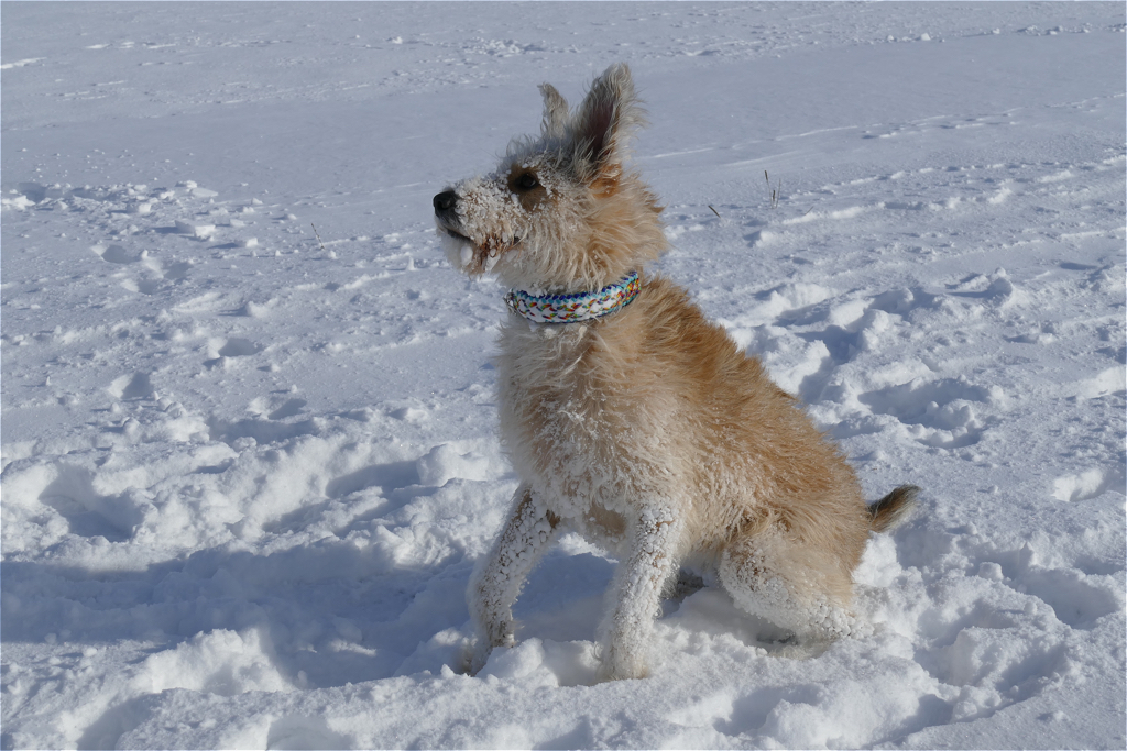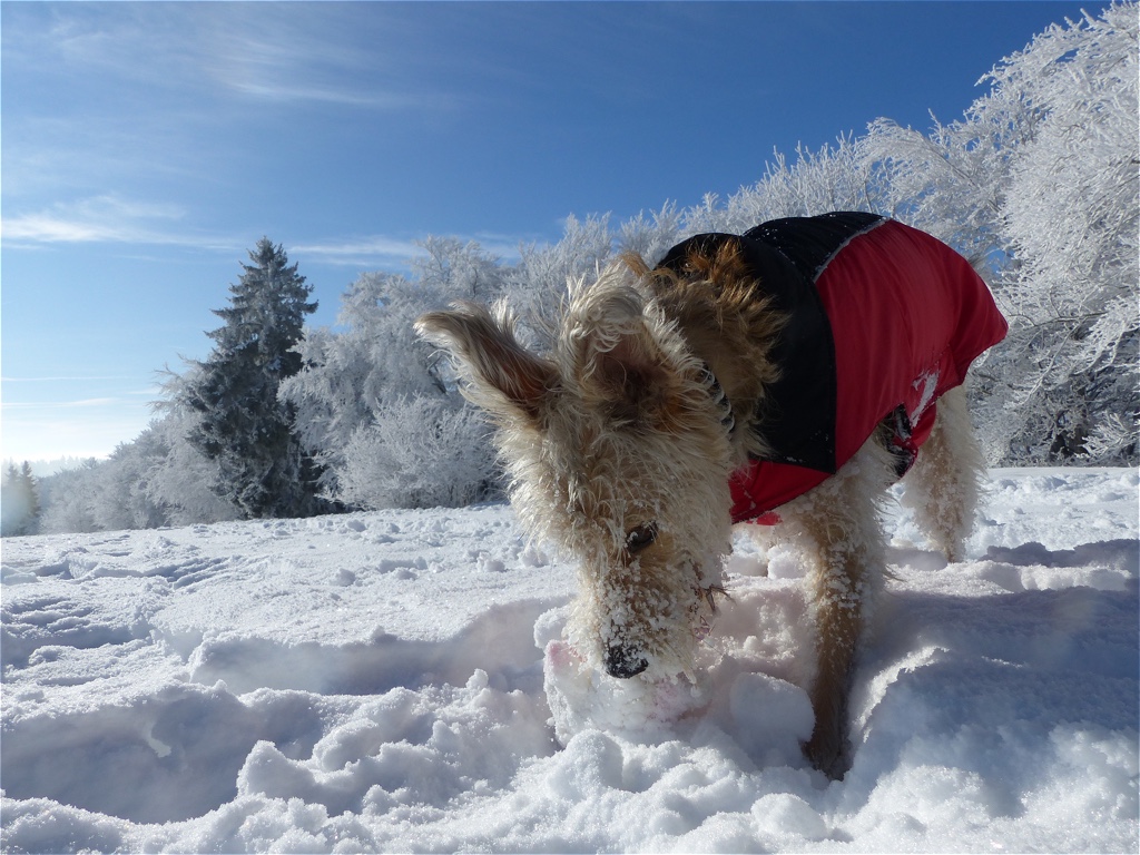 Der Januar zeigte sich sehr kalt und schneereich. Wir waren viel auf den Hochebenen unterwegs. Teilweise kam man sich vor, als würde man auf dem Mond spazieren gehen. Wir waren mutterseelenallein. Nur Frauli und ich – zumindest in der ersten Woche als sie Urlaub hatte. Aber wir hatten jede Menge Spaß und ich konnte nach Herzenslust toben. Gleich in der ersten Januarwoche kam Frauli auf die Idee, dass mein Fell gestutzt werden muss und hat mich zum Frisör geschleift. Na toll! Es war saukalt! Naja, mit Mantel ging es und ich möchte mich ja nicht beklagen. Mein 5. Geburtstag kam und ich wurde reich beschenkt. Besonders schön fand ich, dass Frauli frei hatte und wir viel gemeinsame Zeit verbracht haben. Leider starb Opaherrli Ende Januar und so war auch mein Geburtstag leider eine sehr ruhige Veranstaltung.