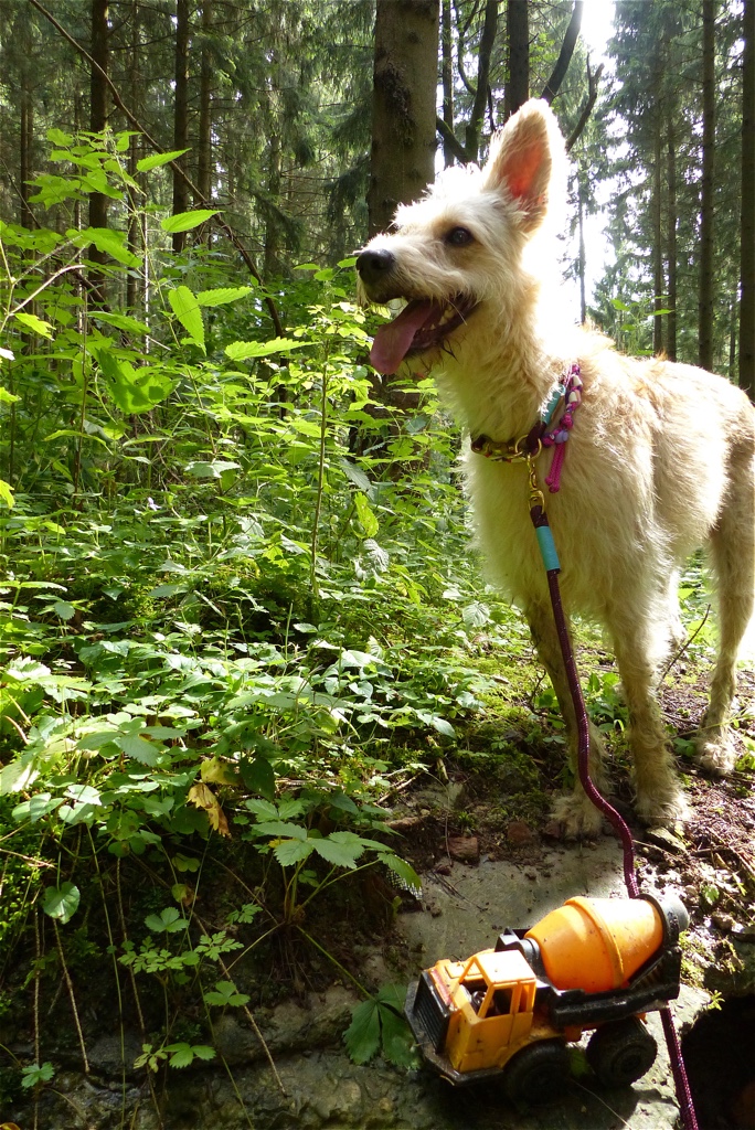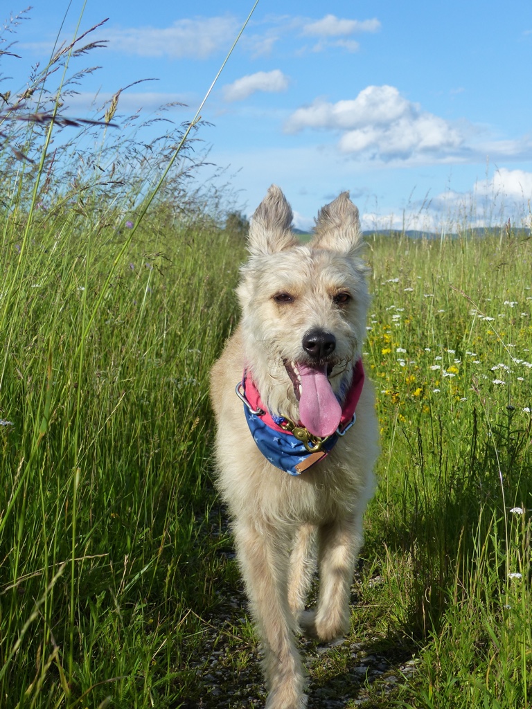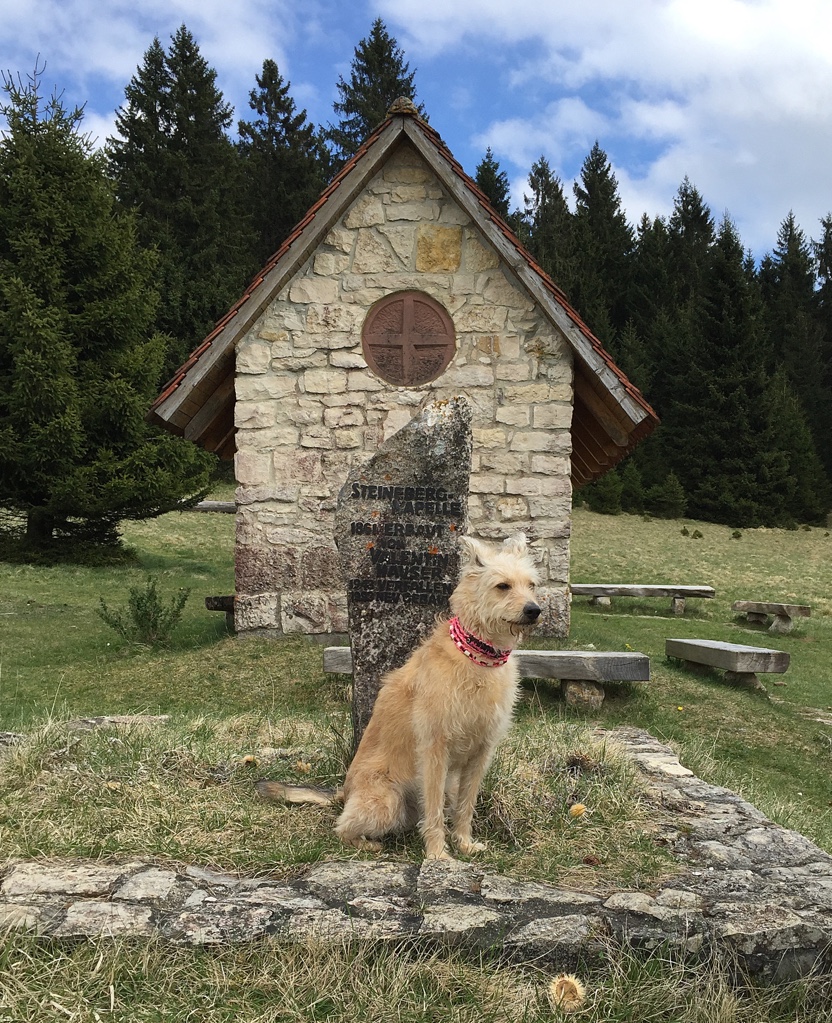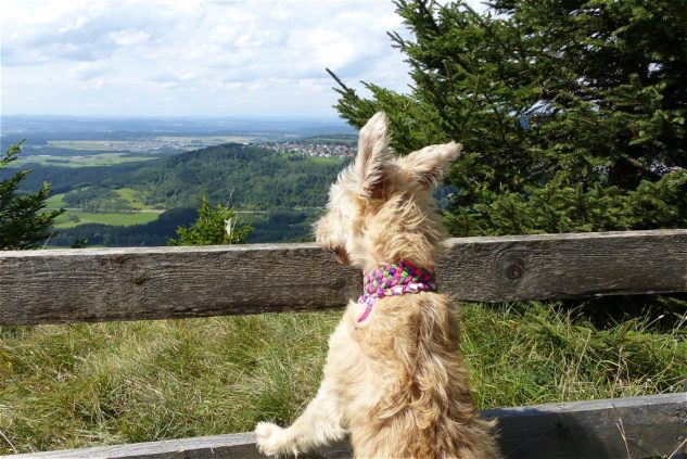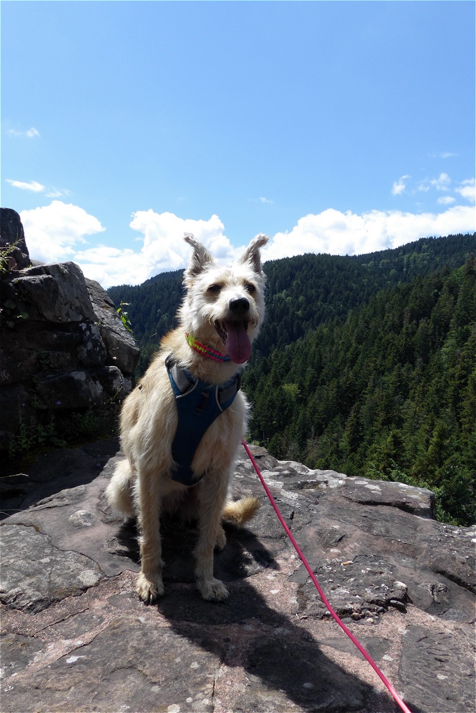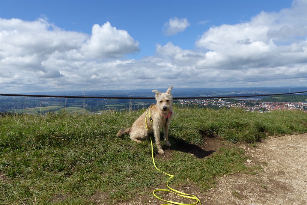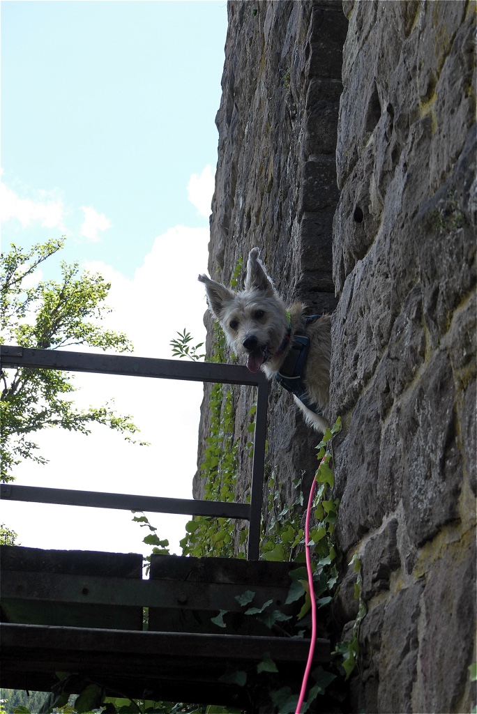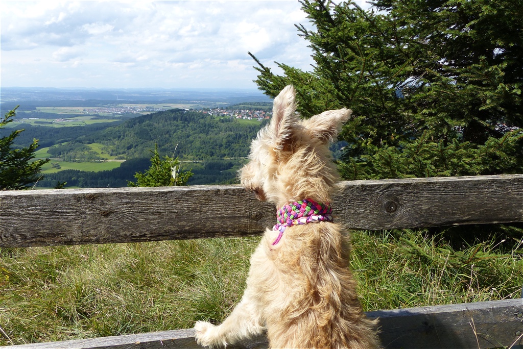 Der Juli brachte wunderbares Wetter, viel Sonne und vor allem hatte Frauli da Urlaub. Wir waren sehr viel beim Geocaching unterwegs und haben riesengroße Wanderungen gemacht. Ich selbst wurde das Burgfräulein von und zu Falkenstein. Dann haben wir die 10 1000er in Angriff genommen. Das sind 10 Gipfel in der näheren Umgebung, die alle auf über 1000 Meter liegen. Wir sind an einigen Steilklippen entlang gelaufen und Frauli hat festgestellt, dass sie mich lieber an einer kurzen Leine hat… anscheinend bin ich ihr zu wagemutig. Außerdem hat Vasey sich wieder zu Wort gewufft und aus dem Leben des britischen Landadels erzählt.