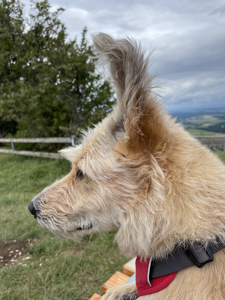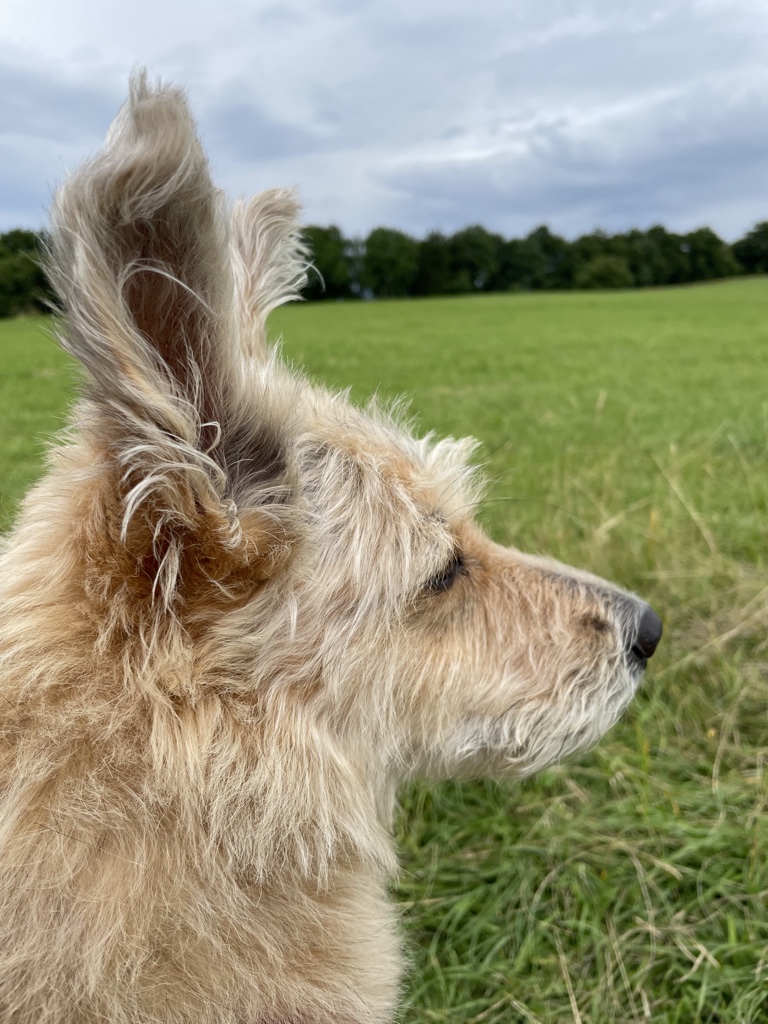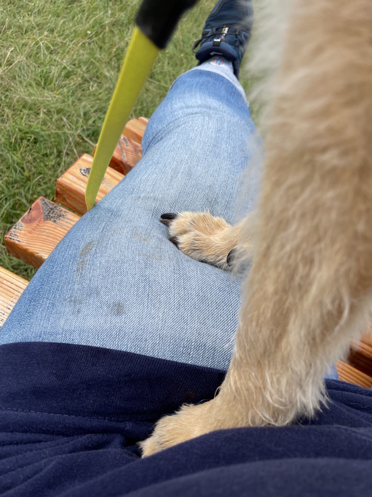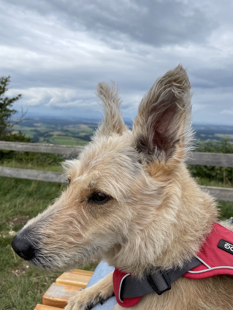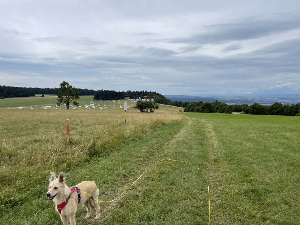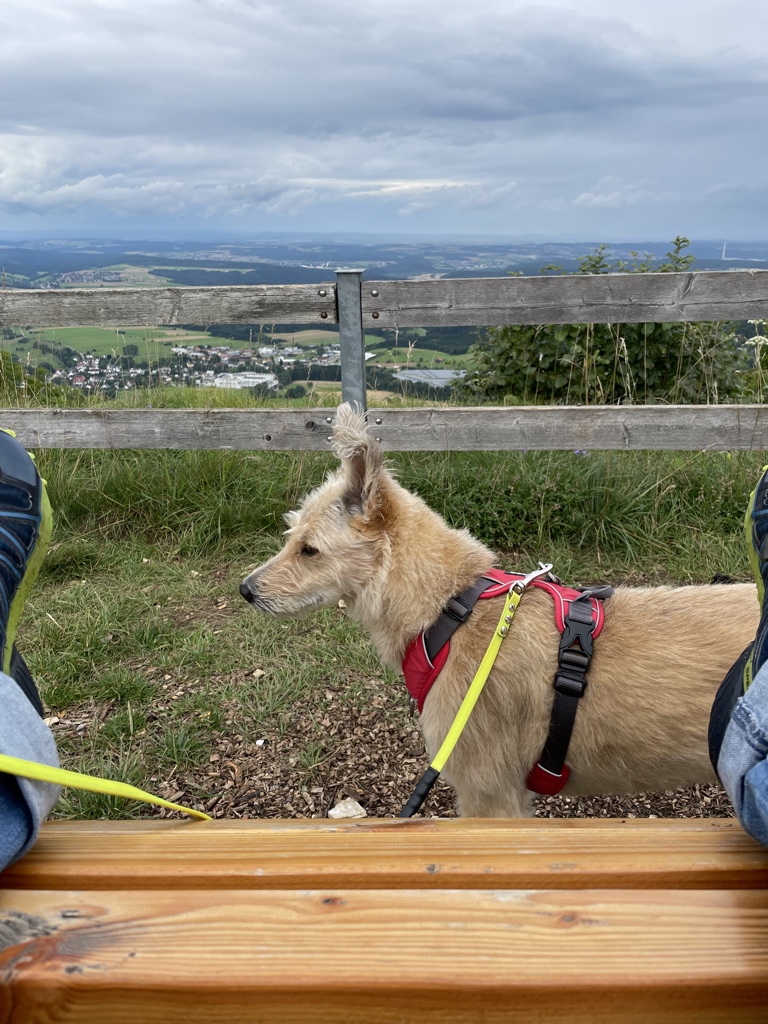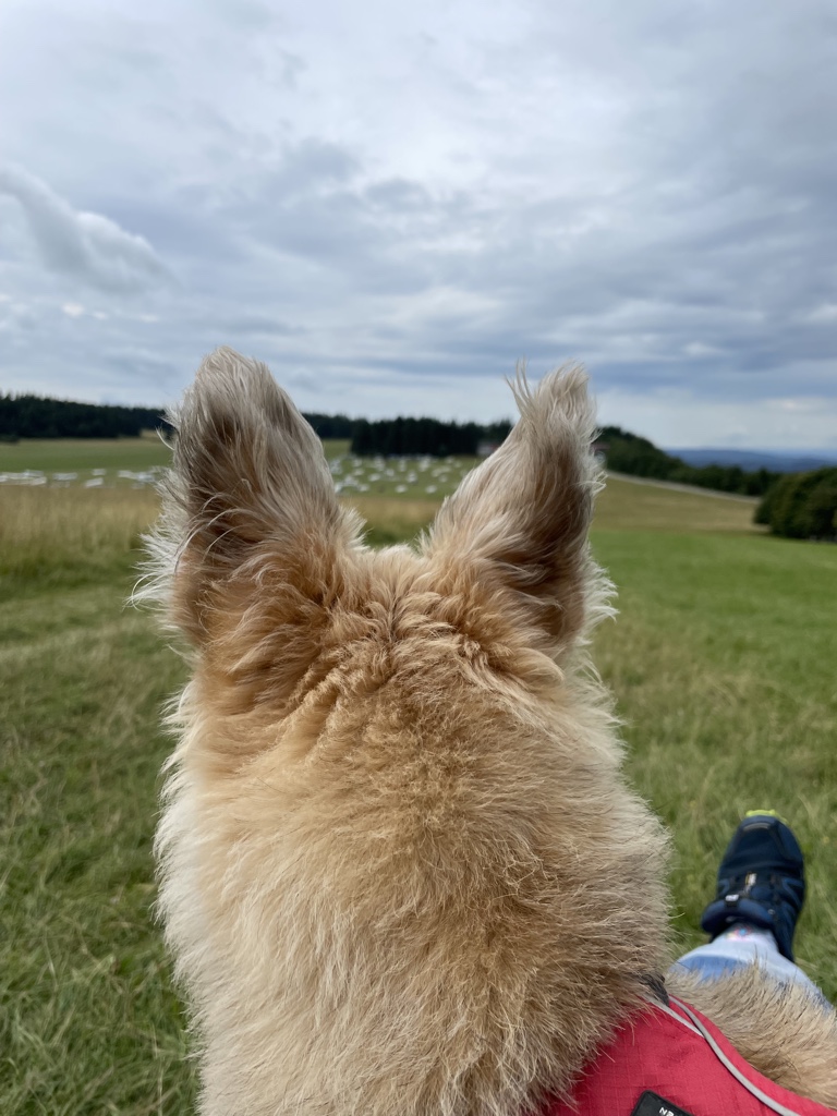 Aber heute waren wir schon eine größere Runde. Wir sind auf dem Klippeneck gelaufen. Das ist eine sehr schöne Wiesenrunde und da konnte man auch immer wieder auf die neuen Bänke sitzen. Frauli war total begeistert, vor allem, weil unsere sonstige Lieblingsstrecke derzeit schwer zu erreichen ist. Wir müssen einen großen Umweg fahren, weil auf der eigentlichen Straße gebaut wird. Und dann hat nun auch noch der Bauer gemeint, dass es großartig ist, die ganze Wiese einmal komplett mit Gülle zu bestreichen… *seufz* Da werden wir jetzt mehrere Wochen nicht hin können. Das ist der Vorteil beim Klippeneck dort sind meistens Schafe unterwegs und da wird nicht gegüllt.