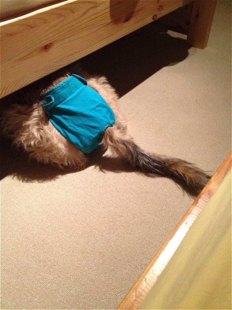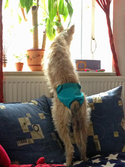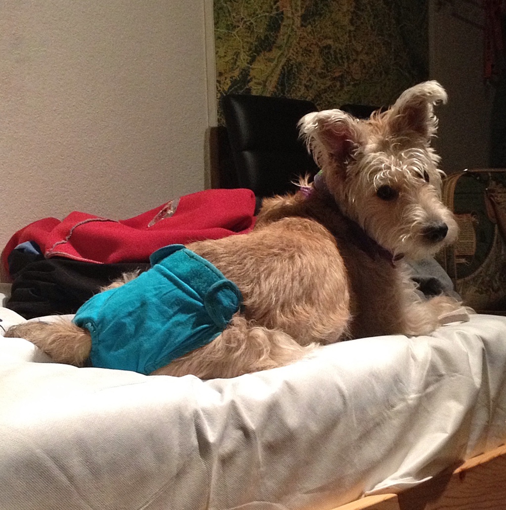 In diese Zeit fiel auch meine erste Läufigkeit. Hach… war das nervig. Ich musste immer so eine doofe Hose anziehen, wenn ich daheim war. Aber wenn Frauli heim kam, dann hab ich …zack… sofort die Hose ausgezogen und war bereit fürs Gassi. Frauli musste immer lachen, wenn ich das gemacht habe.