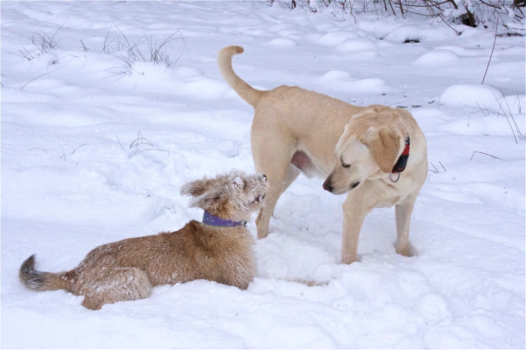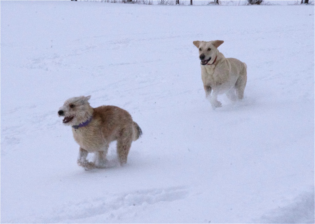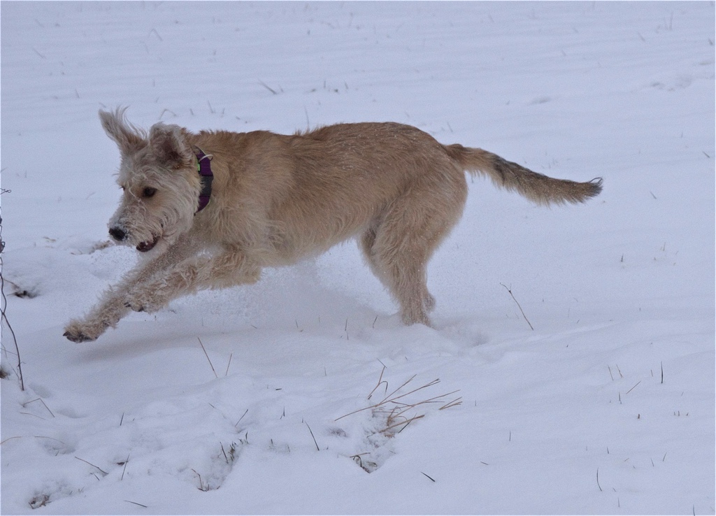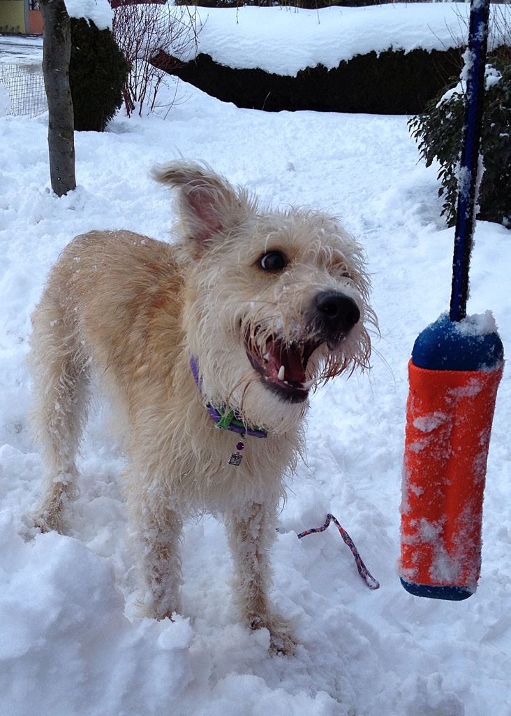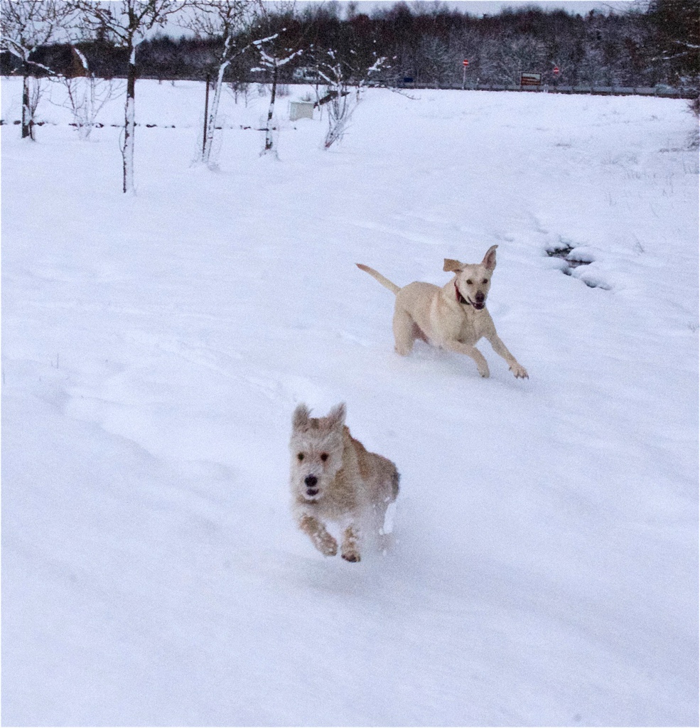 Nach diesem sehr matschigen Dezember folgte ein unglaublich schneereicher Januar. Ich war begeistert! Schnee ist einfach wundervoll. Man kann drin buddeln, reinspringen, fressen, drüber rennen und Schneebälle jagen. Einfach herrlich! Mit meiner Gassigängerin Meli hab ich herrliche Runden gedreht und sie hatte auch einen riesengroßen Spaß sich mit mir zu fotografieren. Für Sabrina änderte sich leider der Dienstplan und sie konnte nicht mehr mit mir Gassi gehen. Dafür ging dann eine andere Freundin von Frauli mit mir. Aber am schönsten war es immer, wenn Frauli nicht mehr zur Arbeit musste oder an den freien Tagen. Herrlich! Wir drehten riesengroße Runden und Frauli spielte mit mir im Schnee. Am 21. Januar feierte ich meinen 1. Geburtstag und wurde von Frauli reich beschenkt, aber am tollsten war, dass sie extra Urlaub genommen hatte. Ganz oft traf ich auch meinen Kumpel Arno und bin mit ihm durch den Schnee gefetzt. Wir sind fast jeden Morgen zusammen gelaufen und nachmittags hat es eigentlich nur am Wochenende oder Freitag gepasst. Aber das war toll!