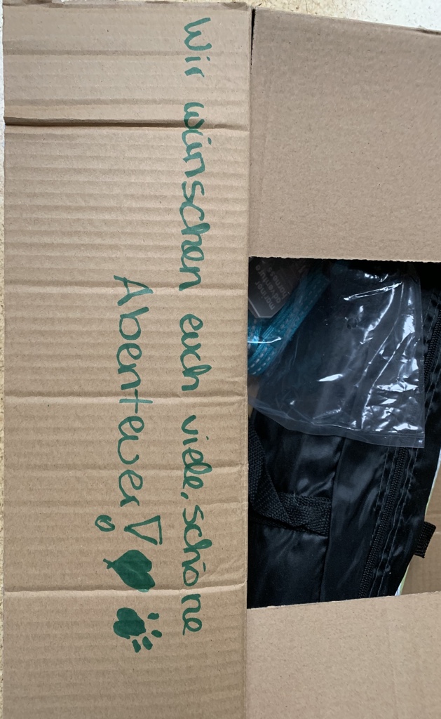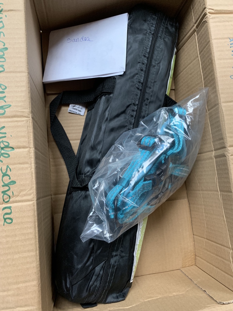 Als das Paket ankam war ich überrascht, wie leicht es doch ist. Hupfig leicht… und recht zierlich. Also gleich mal voller Begeisterung aufgerupft und neugierig reingelinst. Ich hatte ja schon auf Instagram und Twitter kurz den Karton gezeigt und auch Zelt sowie Geschirr der Weltöffentlichkeit vorgestellt. Ein lieber handgeschriebener Begleitbrief vervollständigte das Gesamtpaket. Der erste Eindruck war somit schonmal komplett positiv. Und meine Begeisterung wuchs mit der Vorfreude aufs Ausprobieren. Das Geschirr ist leicht und macht einen stabilen Eindruck. Es lässt sich gut verstellen und hält auch die gemachten Einstellungen. Da habe ich schon ganz anderes erlebt. *augenroll* Aber dieses Geschirr hält wirklich gut. Nun muss es sich noch im Praxistest bewähren.