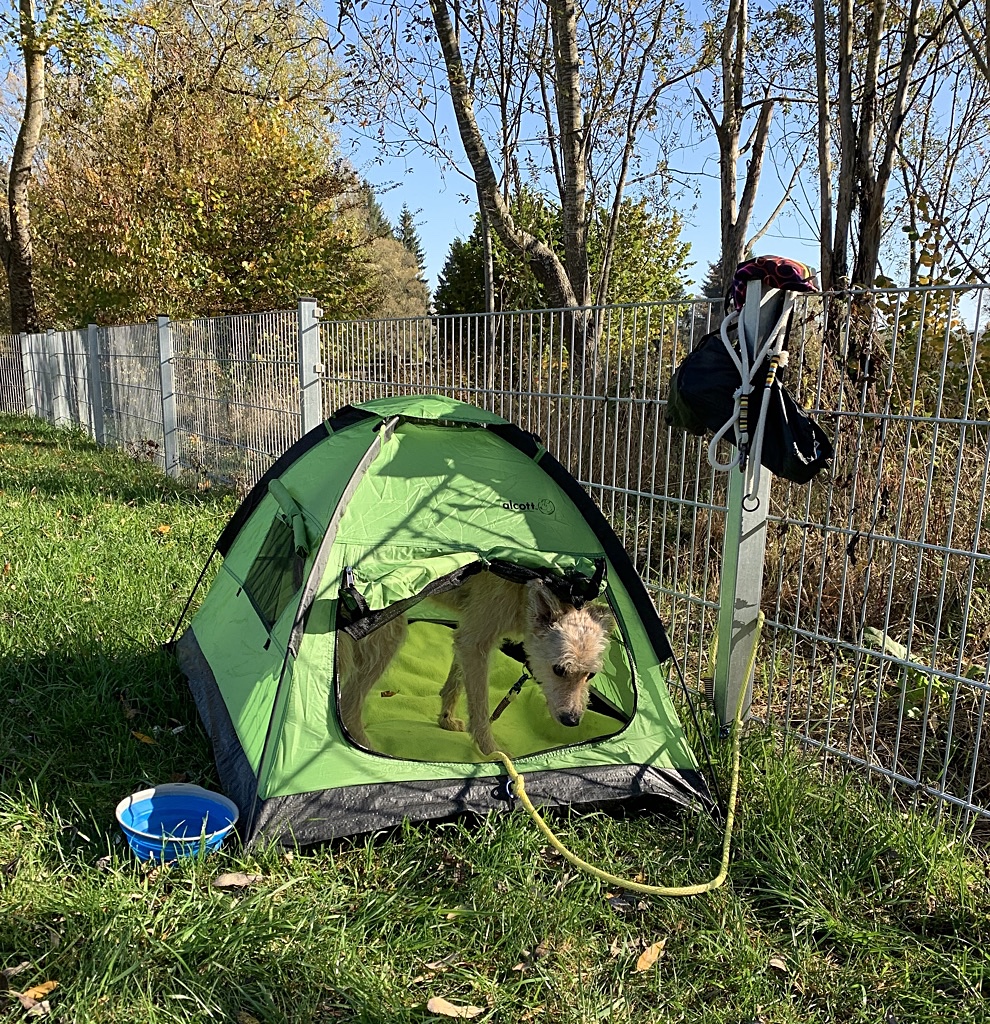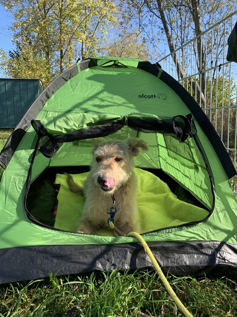 Also wurde gestern das Zelt eingeweiht. Ich finde es großartig! Musste ich mal schnell weg und hatte Shiva für mich außer Sicht wurde sie kurzerhand ins Zelt geschickt und zu gemacht und wenn ich in der Nähe war, habe ich sie einfach selbst entscheiden lassen. Gestern war es natürlich zu schön, um ins Zelt zu liegen, aber ich kann mir gut vorstellen, dass sie bei kälterem Wetter gerne die Behaglichkeit eines Zeltes dem Platz im Freien vorzieht.