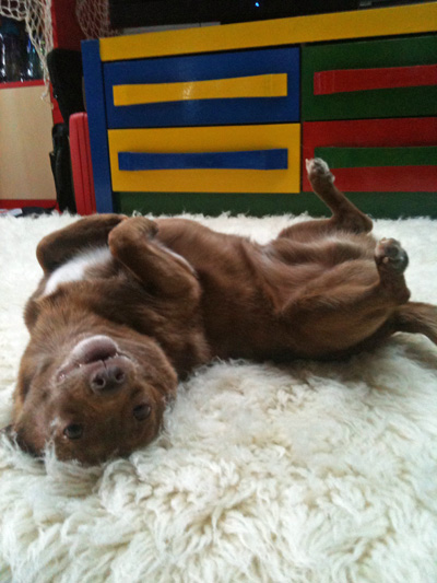 Rocky war zu wild und hat seine kleinen Geschwister geärgert. Also war er mit einem 2jährigen Apricot-Toy-Pudel in einem Zwinger untergebracht. Der kleine Pudel kam gleich an den Zaun und wollte geknuddelt werden. Da tauchte Rocky auf, aus einem Kissenberg erschien plötzlich der Kopf und dann kam er nach vorne gestürmt, rempelte den Pudel auf die Seite und es traf Frauli wie ein Blitz. Sie hatte ihren Seelenhund gefunden. So sehr sie ihre Jenny auch geliebt hatte, Rocky und Frauli waren eine Einheit. Es war klar, dass Rocky sofort mitkam. Der Schutzvertrag wurde fertig gemacht, aber die Frau von der Pflegestelle hat gleich gesehen, dass man Frauli und Rocky niemals voneinander trennen kann.