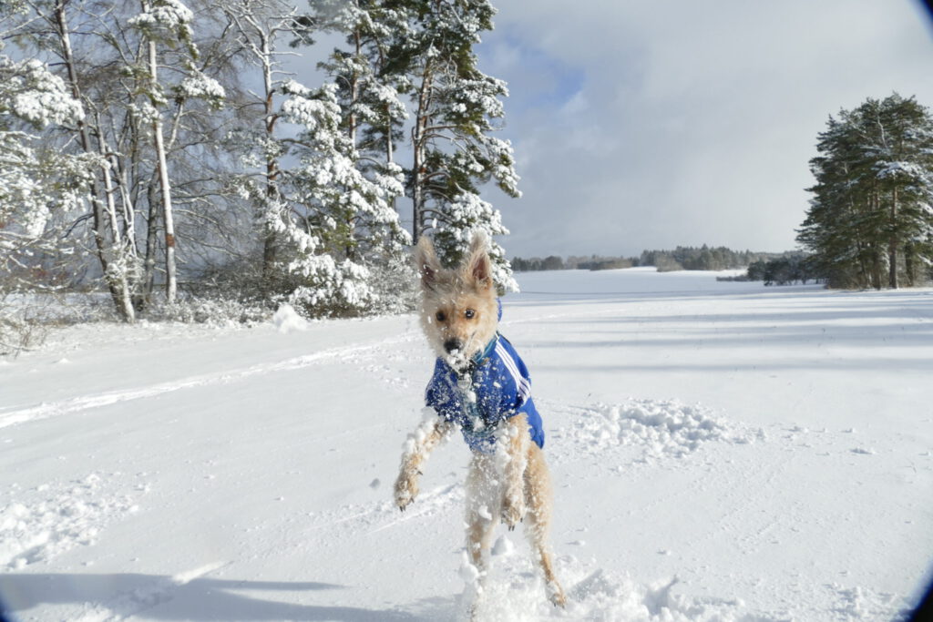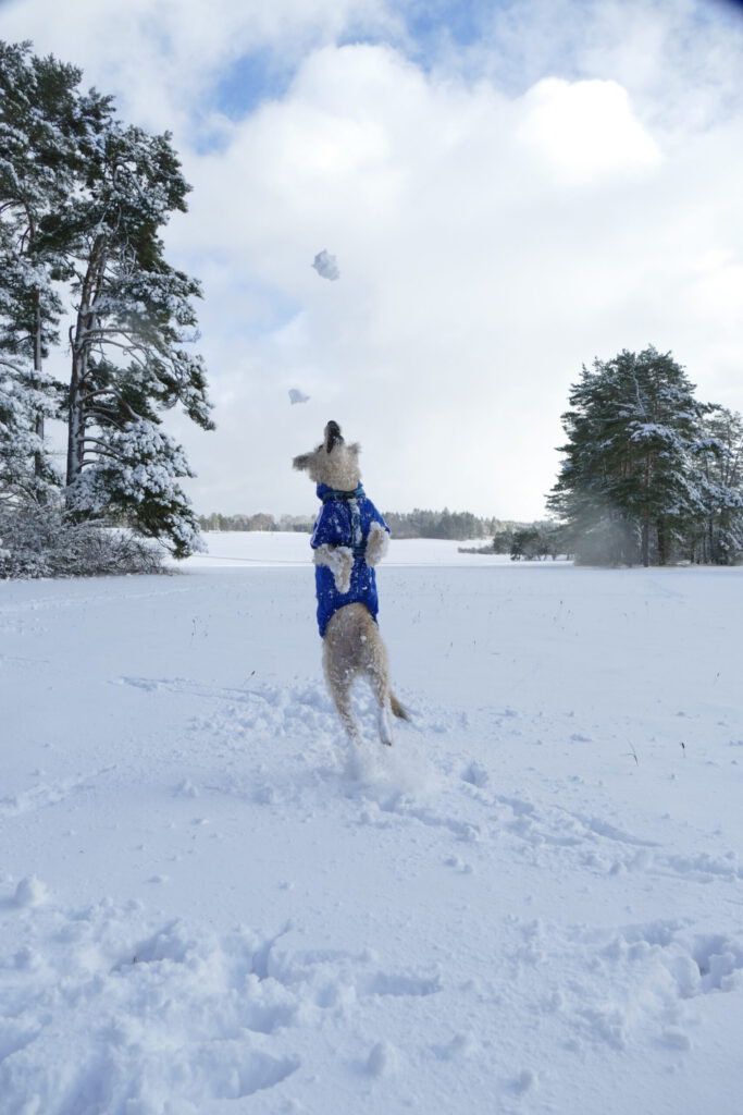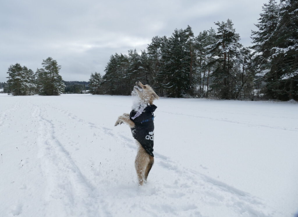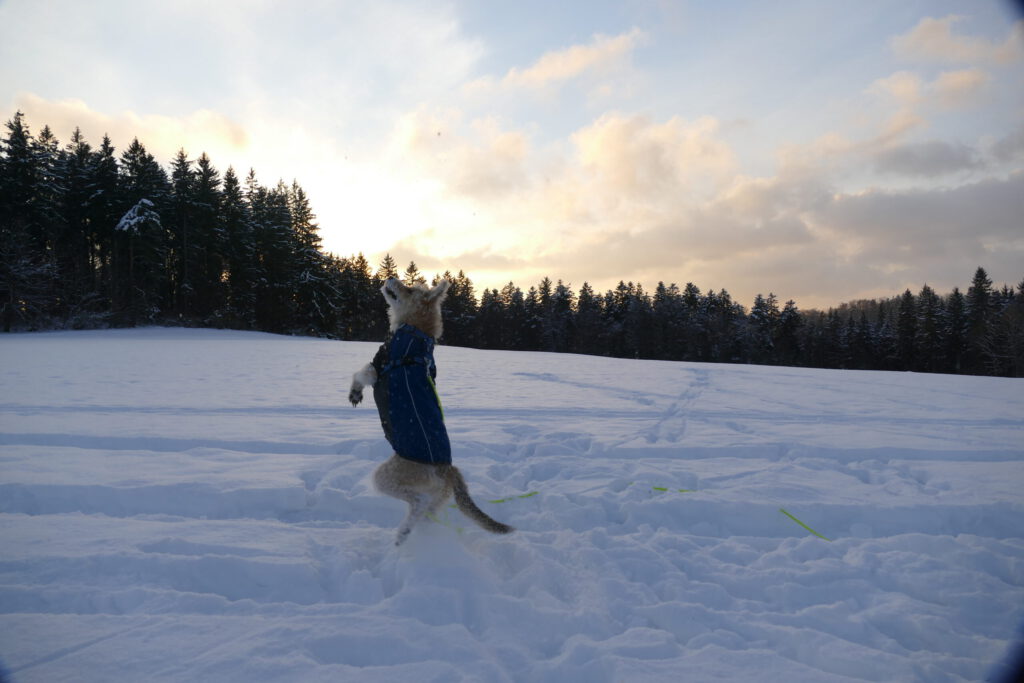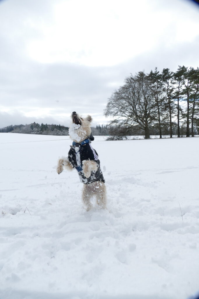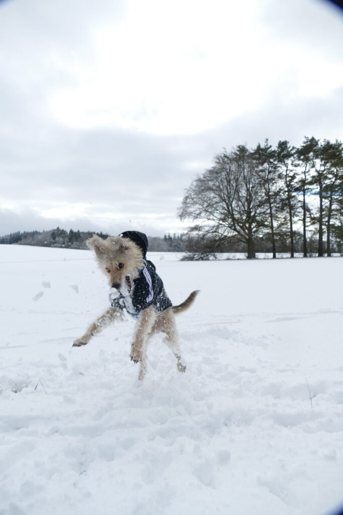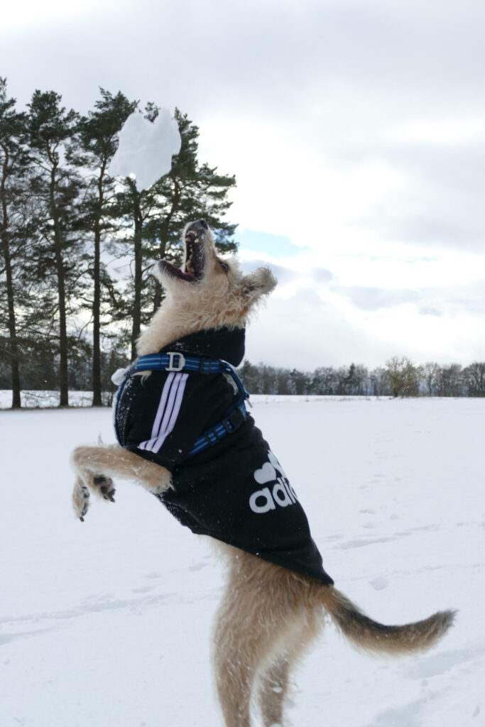 Schneebälle sind ein Wunder. Frauli kann sie einfach so entstehen lassen und werfen. Aber dann… Manche Schneebälle haben einen Kometenschweif und funkeln und glitzern im Flug. Andere Schneebälle sind groß und kugelig und fliegen toll. Sie haben aber alle eins gemeinsam. Sobald ich sie fange, habe ich nur noch Brösel in der Schnauze oder stauben um mich rum. Die Schneebälle, die ich nicht fange, lösen sich sofort auf. Ich suche und buddle, aber gefunden habe ich keine mehr. Frauli macht aber immer neue. Sie bückt sich, fässt in den Schnee und hat einen. Ich kann da gucken, soviel ich will. Ich finde keinen.