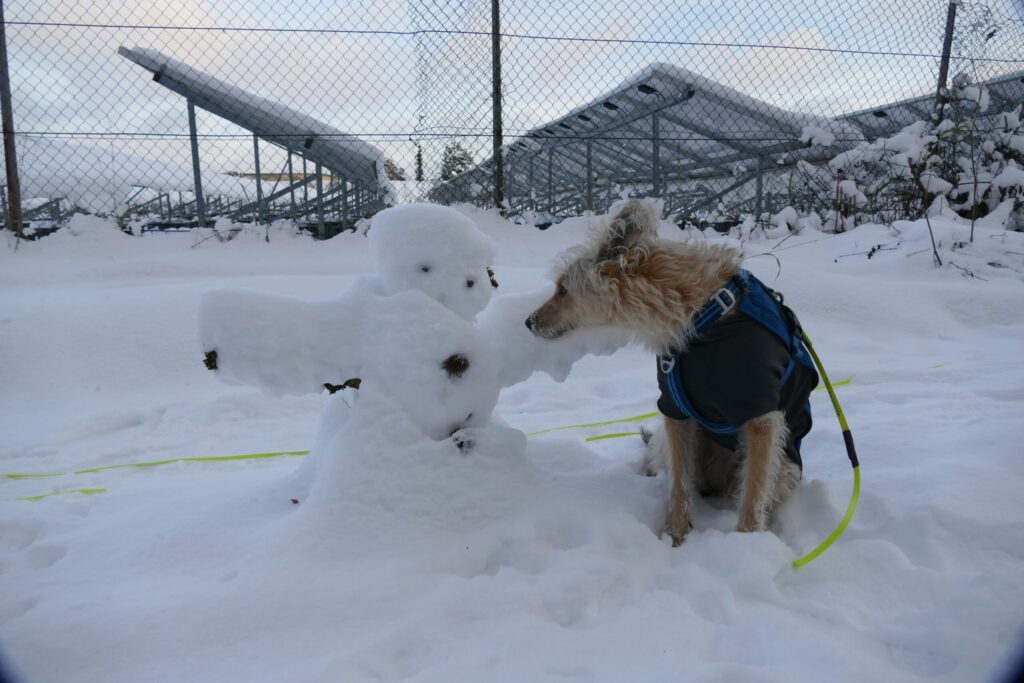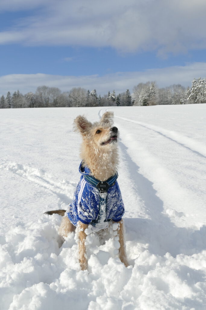 Es schneit! Es schneit! Ich freu mich so! Schnee ist toll, Schnee ist großartig. Hund kann sich drin wälzen. Hund kann durchflitzen. Hund hat Spaß. Aber ich stelle mir auch Fragen…