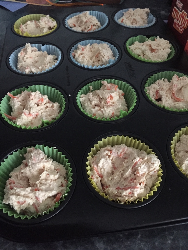 Den fertigen Teig aus der Schüssel bitten (er klebt ziemlich) und in Muffinförmchen verteilen.  Bei mir reicht es für 24 Muffins.