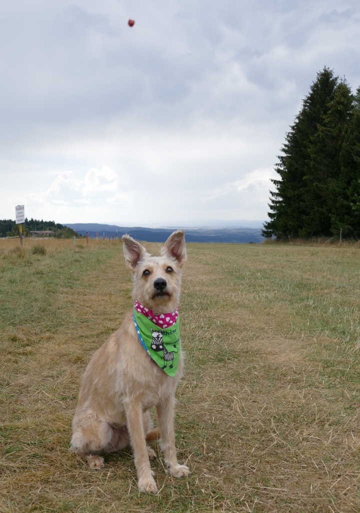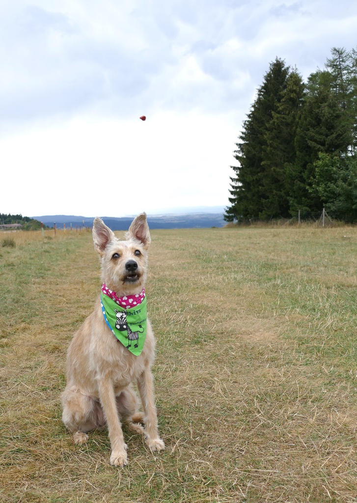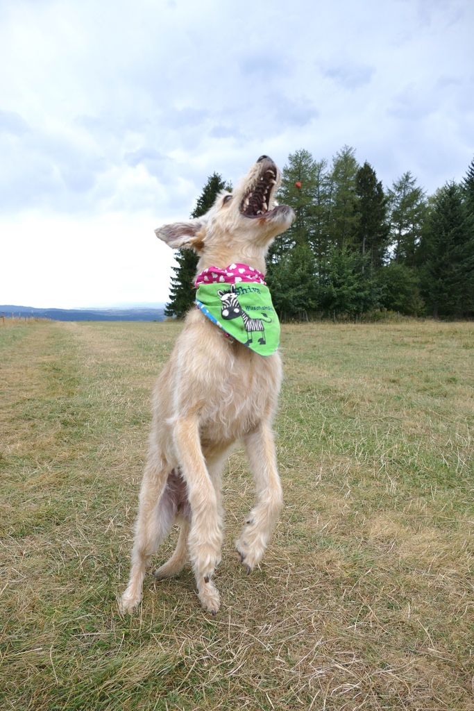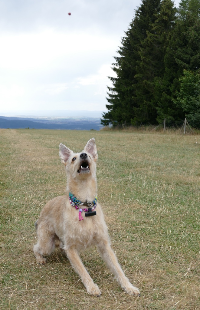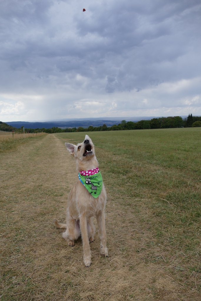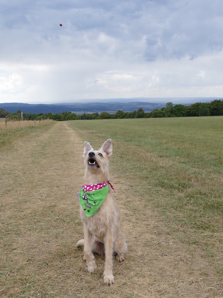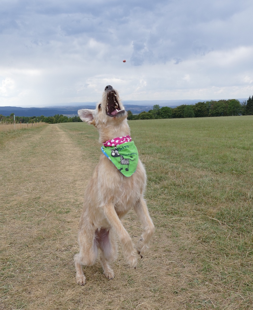 Auf jeden Fall in ganz kleinen Schritten. Der Hund kennt es noch nicht und muss ja erst wissen, was wir von ihm wollen. Als allererstes brauchen wir volle Aufmerksamkeit, dann ein vorbereitendes Kommando oder Zeichen. Zuerst ruf ich Shiva und gebe ihr mit erhobenem Zeigefinger das „Pass aus“ Zeichen, dann kommt das Fang-Kommando. Bei uns ist das „fang“. Das sag ich mit dem Abwurf. Das Objekt sollte einen leichten Bogen beschreiben. Direkt ist viel zu schnell und eine Bogenlampe ist für den Hund zu schlecht anzupeilen.