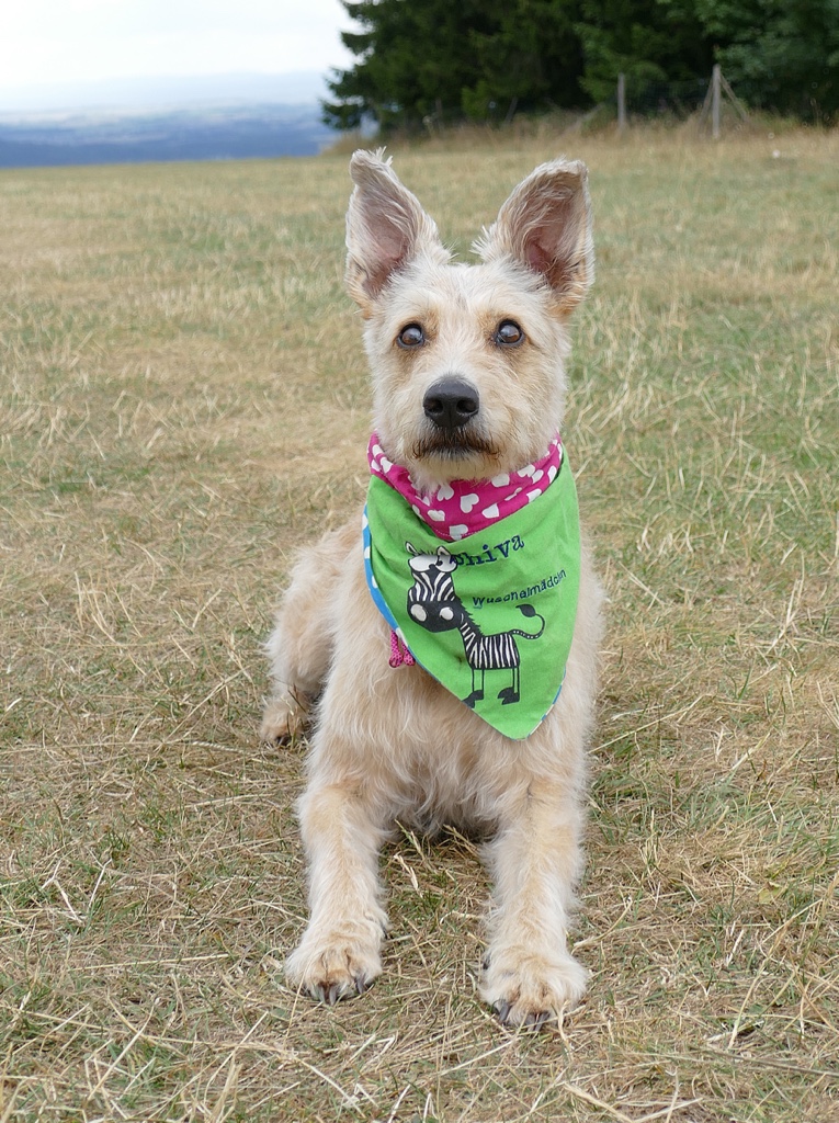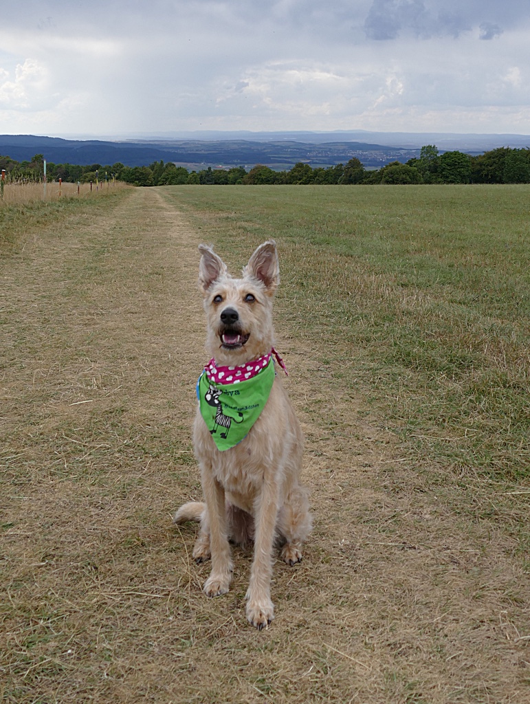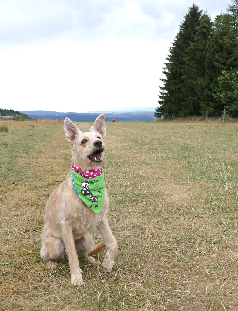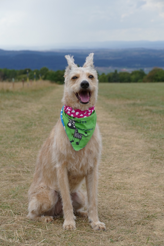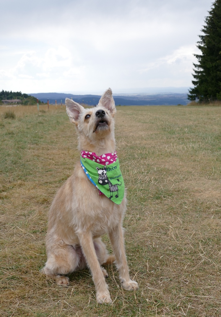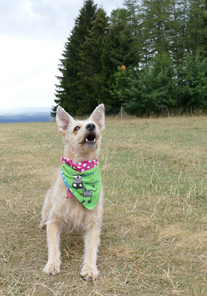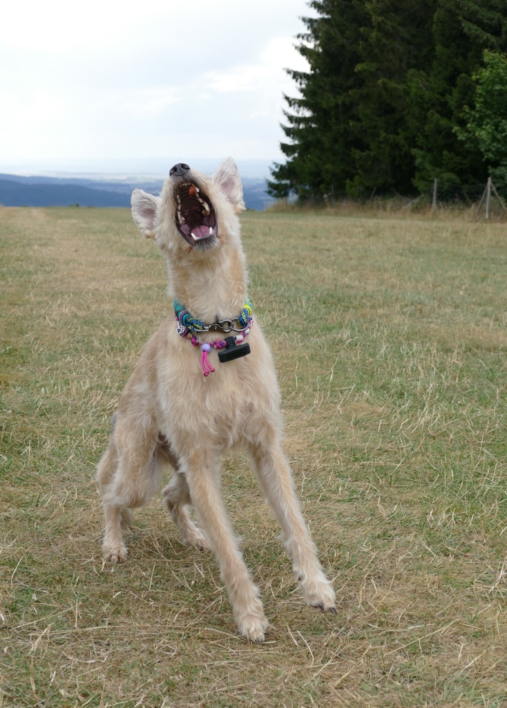 Auf jeden Fall in ganz kleinen Schritten. Der Hund kennt es noch nicht und muss ja erst wissen, was wir von ihm wollen. Als allererstes brauchen wir volle Aufmerksamkeit, dann ein vorbereitendes Kommando oder Zeichen. Zuerst ruf ich Shiva und gebe ihr mit erhobenem Zeigefinger das „Pass aus“ Zeichen, dann kommt das Fang-Kommando. Bei uns ist das „fang“. Das sag ich mit dem Abwurf. Das Objekt sollte einen leichten Bogen beschreiben. Direkt ist viel zu schnell und eine Bogenlampe ist für den Hund zu schlecht anzupeilen.