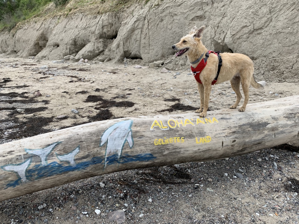 Ich war auch in Sachen Forschung unterwegs. Ich habe Bäume beklettert und Quallen untersucht, außerdem Möwen beschleunigt. Aber die bescheißen… die fliegen einfach weg. Ich habe also keine Möwe erwischt, aber jede Menge Spaß dabei gehabt, sie zum Fliegen zu bewegen. Frauli hatte da weniger Spaß und hat mich an den Strick des Verderbens genommen. Irgendwann waren wir beide müde und haben den Rückweg angetreten. Hach, es war wieder genauso toll, wie auf dem Hinweg und ich habe auch jede Menge Spaß gehabt. Leider hat Frauli dann irgendwann entdeckt, dass ich einen Schnitt in der Pfote hatte und hat mich nicht mehr ins Wasser gelassen. Am Auto hat sie die Pfote dann gewaschen und daheim musste ich sogar duschen und sie hat mir die Pfote verbunden, weil ich immer dran rumgeleckt habe. Menno!