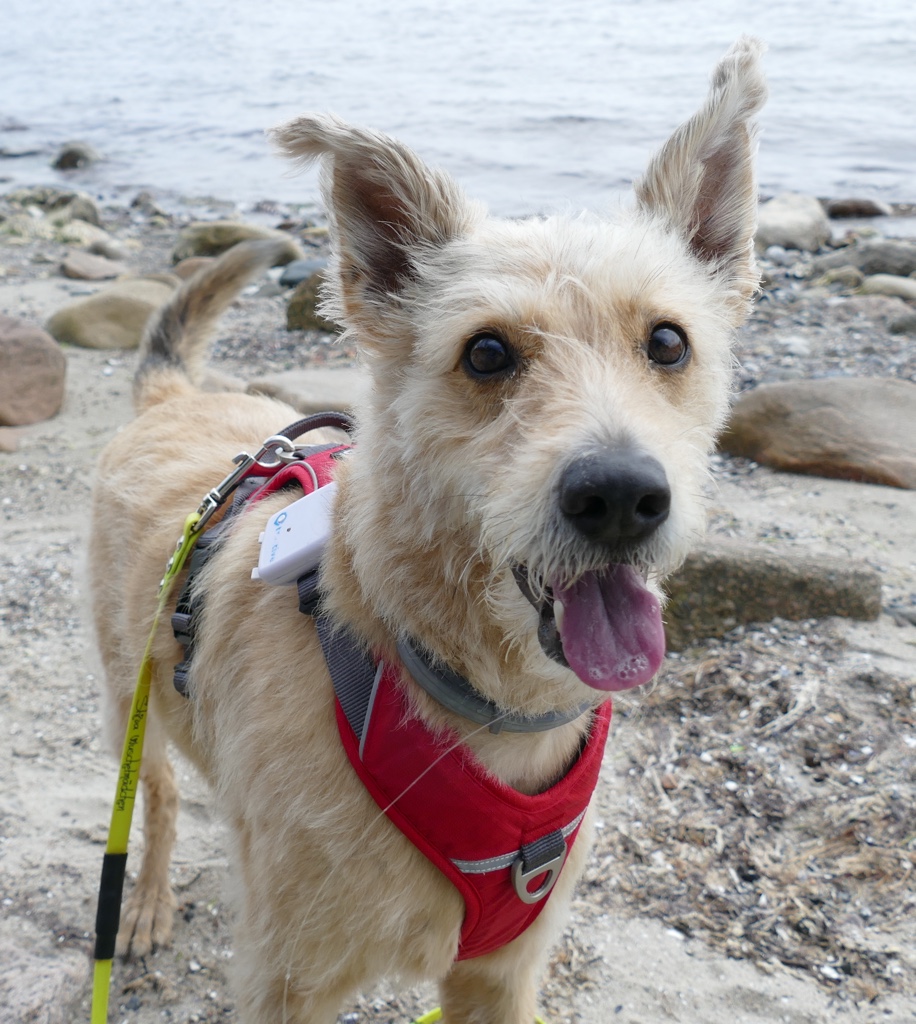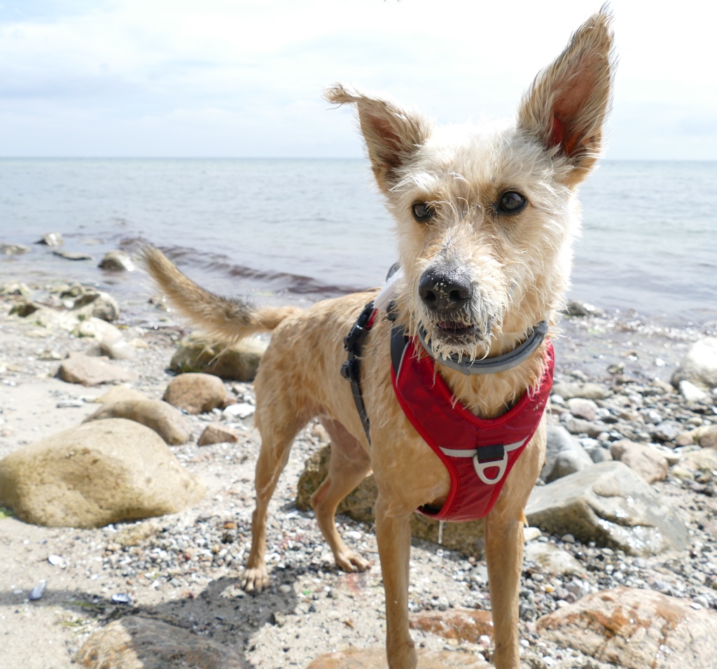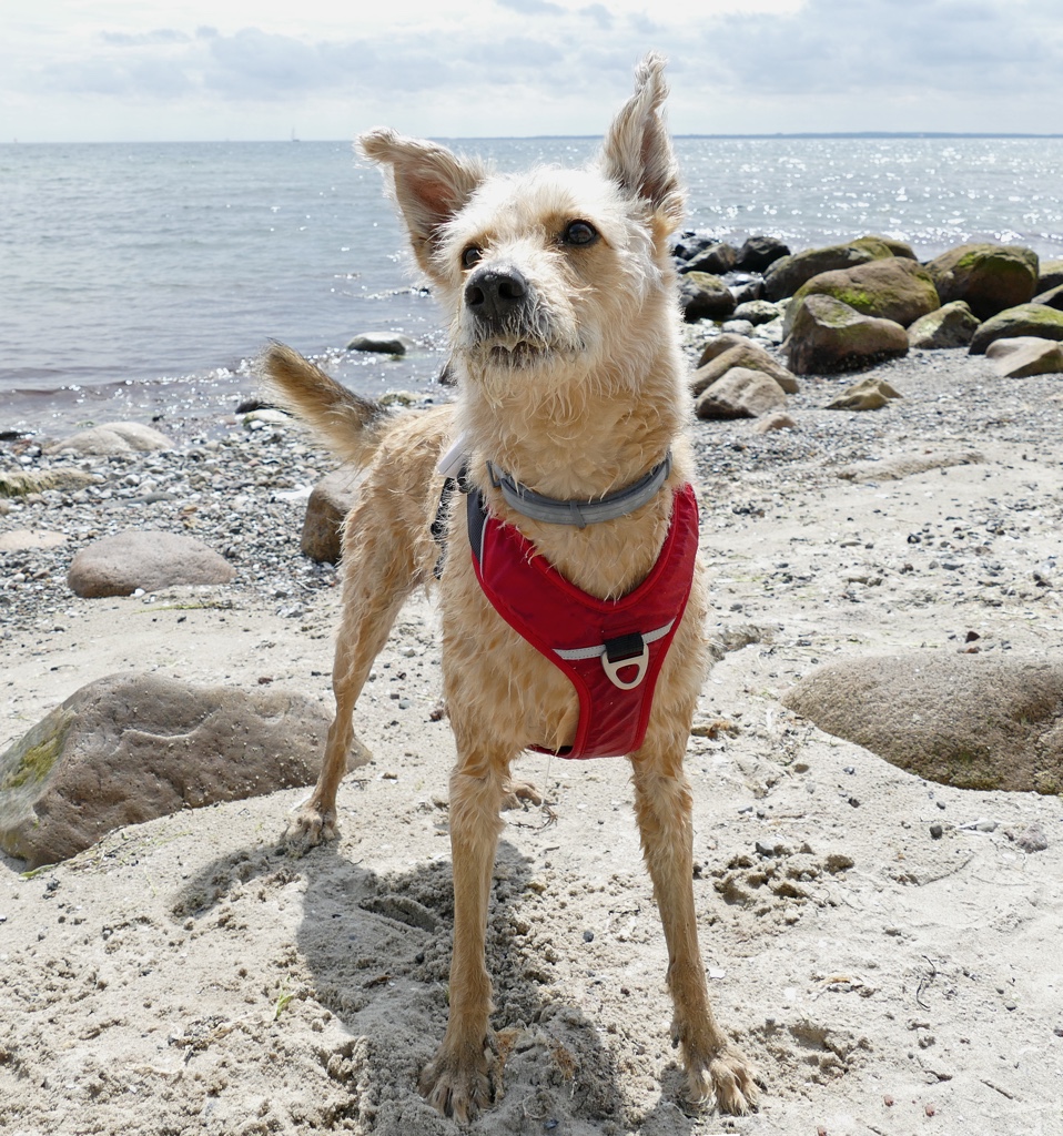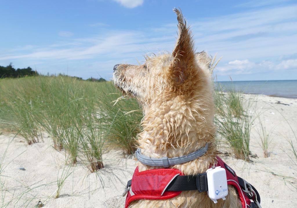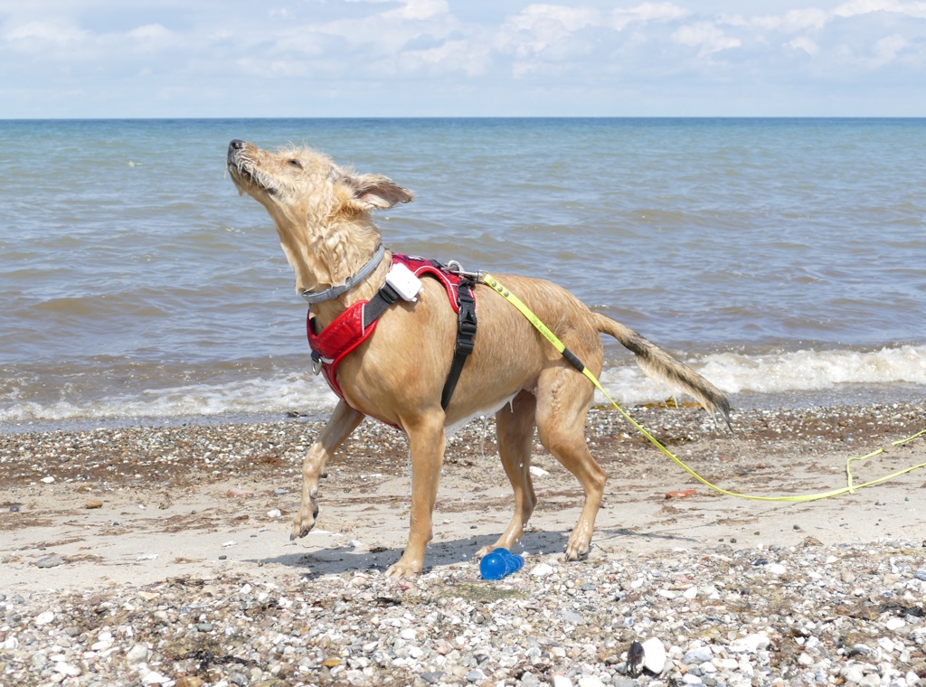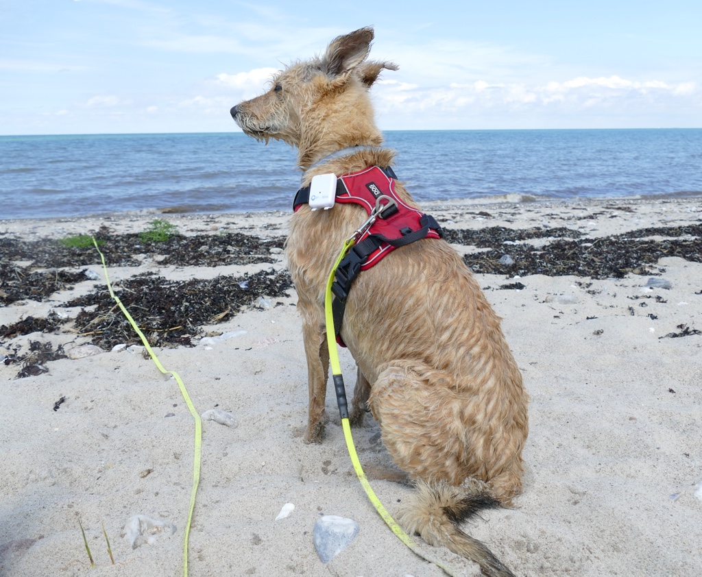 Das rote „Baywatch“-Geschirr ist von DogCopenhagen und ist selbst gekauft. Die Schleppleine ist von Bizuar und selbst gekauft. Mein Kong-Stick ist natürlich von Kong und auch selbst gekauft. Der Tracker ist von Tractive und auch selbst gekauft.