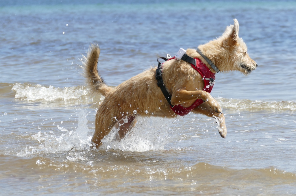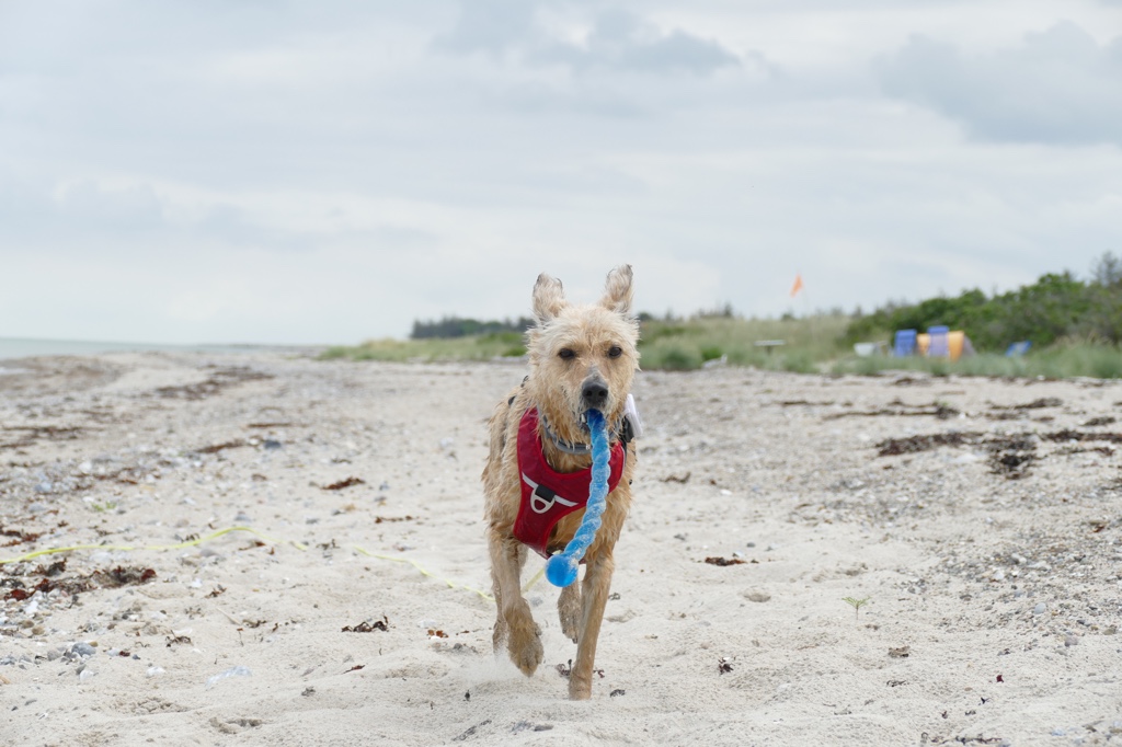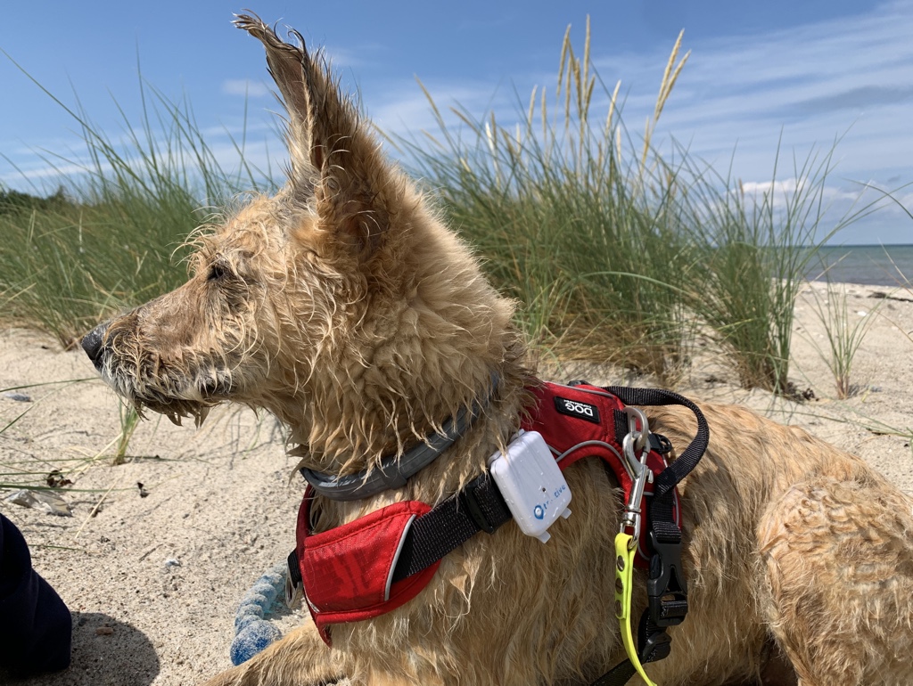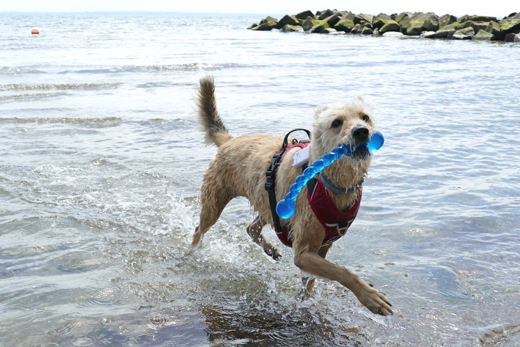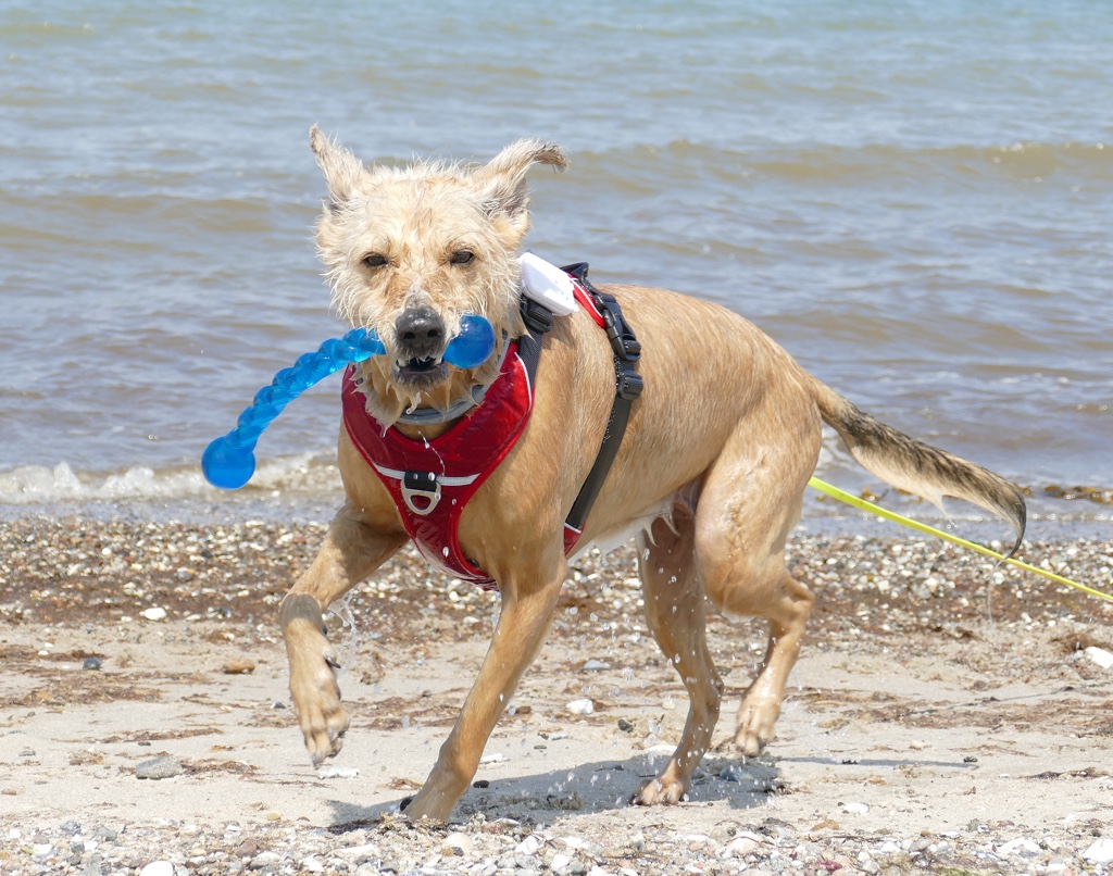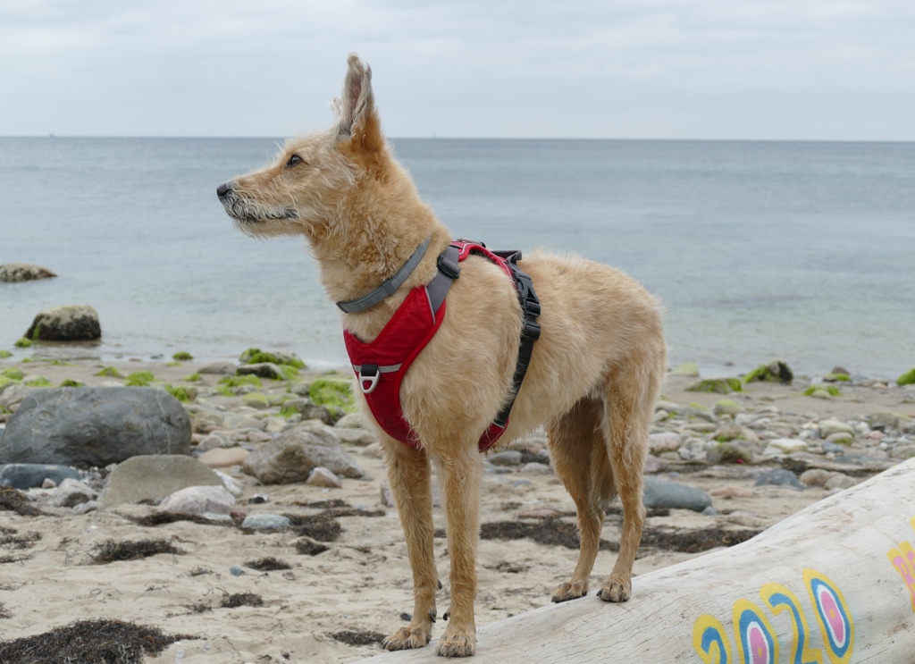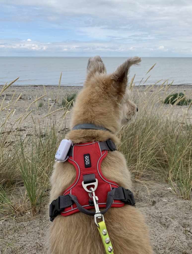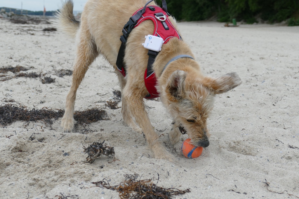 Das rote „Baywatch“-Geschirr ist von DogCopenhagen und ist selbst gekauft. Die Schleppleine ist von Bizuar und selbst gekauft. Mein Kong-Stick ist natürlich von Kong und auch selbst gekauft. Der Tracker ist von Tractive und auch selbst gekauft.