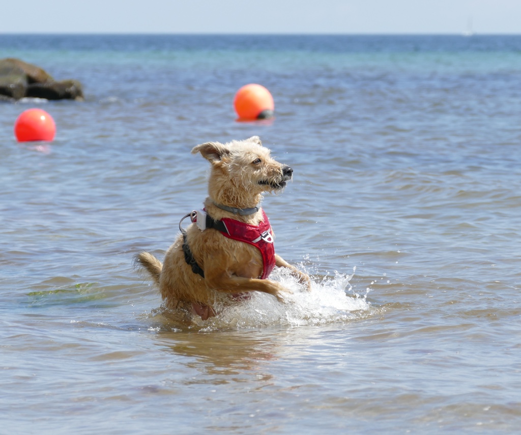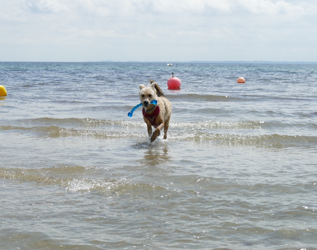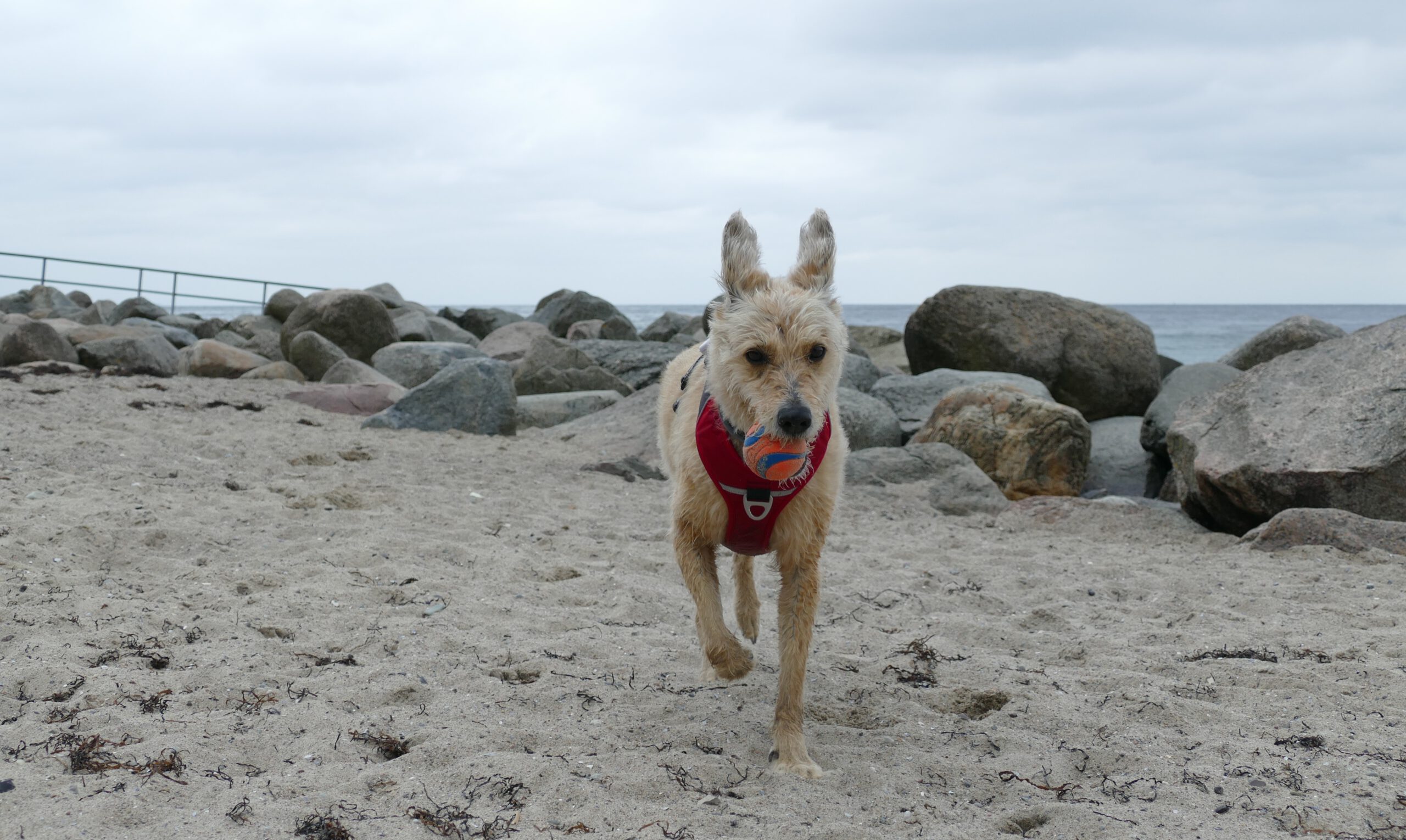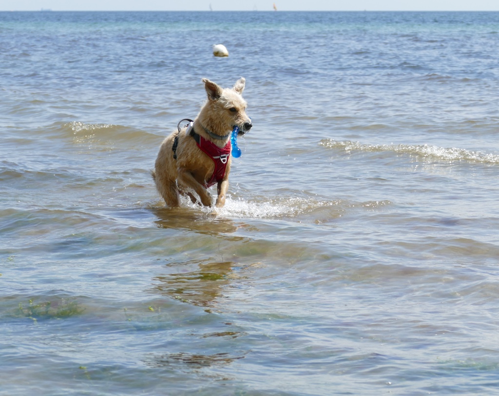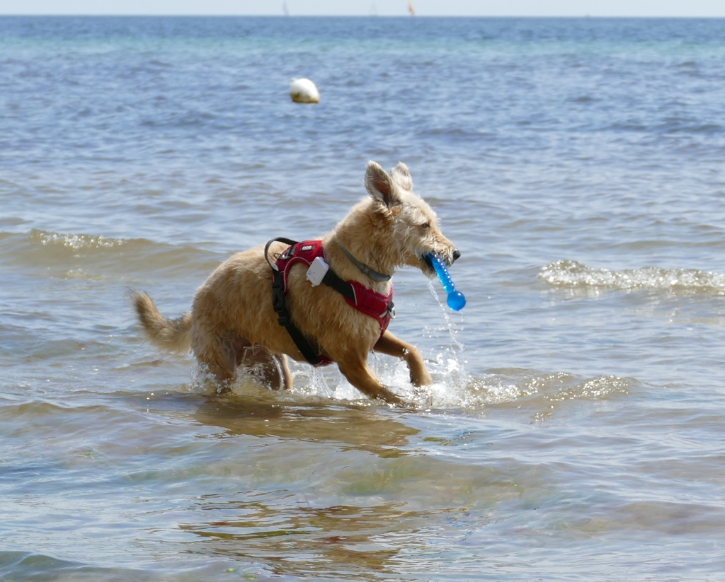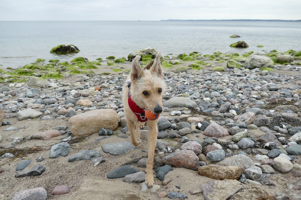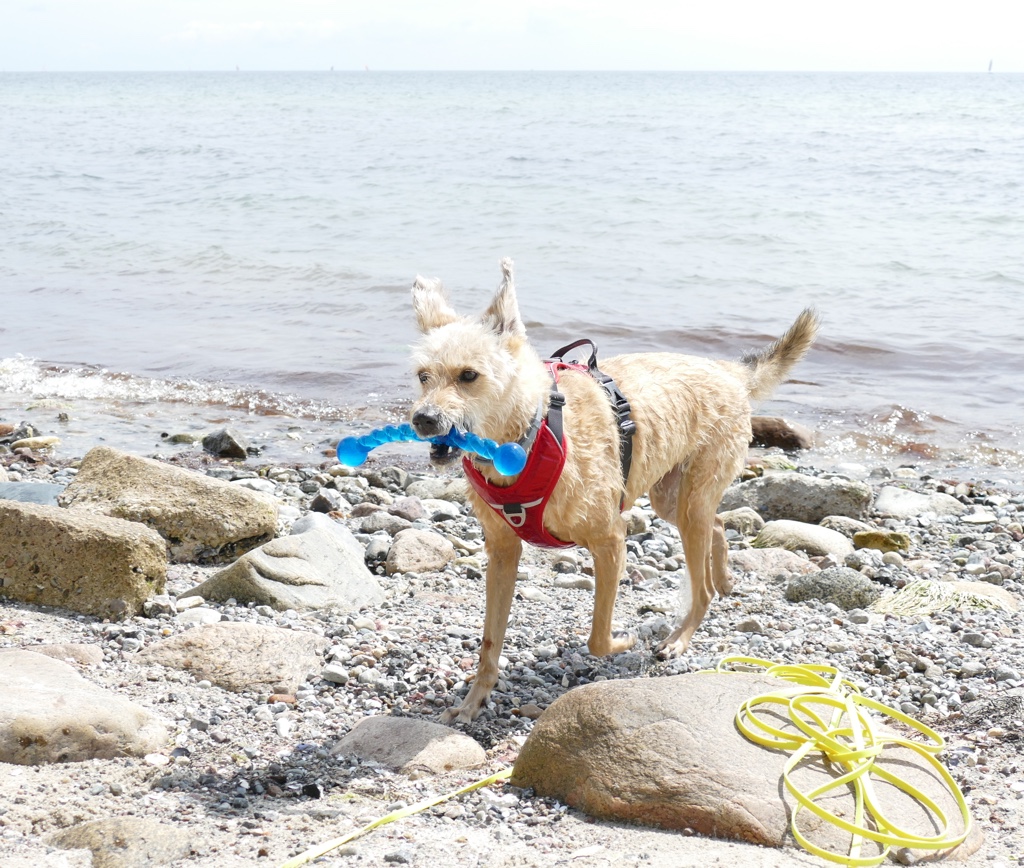 Ich bin natürlich erstmal ins Wasser geflitzt und habe probiert, ob das Meer schmeckt. Nein, es schmeckt immer noch nicht. Aber dann sind Frauli und ich einfach weitergelaufen. Es gab kleine Buchten, steinige Abschnitte, wunderschöne Sandbuchten und es war einfach total toll. Alles frei und nur wir beide und das Meer. Frauli hat an mehreren Stellen einfach Halt gemacht und mit mir gespielt. Ich finde es toll, wenn sie sich so richtig richtig viel Zeit nur für mich nimmt. Kein Handy, keine Kamera, keine Tricks. Einfach nur wir beide, ein Spielzeug und das Meer. Natürlich bin ich ständig ins Wasser gehopst und habe meinen Ball gerettet. Es war sooooo fantastisch großartig toll.