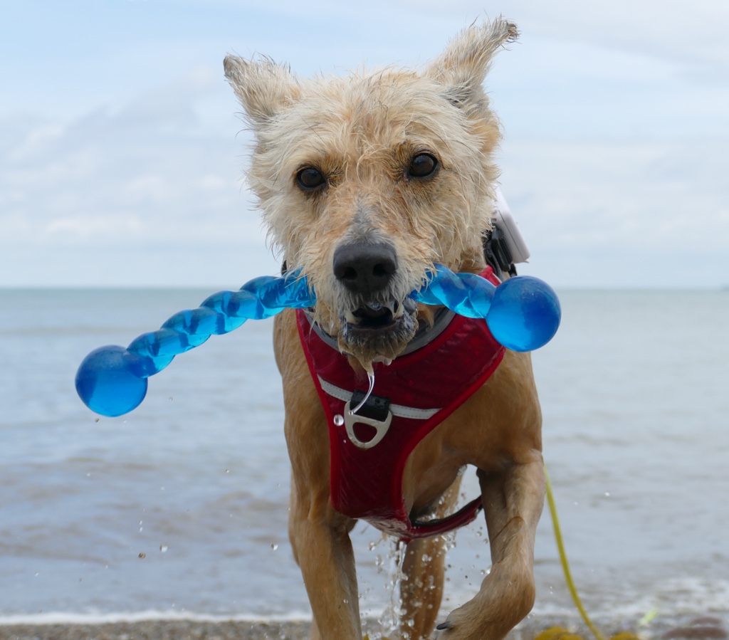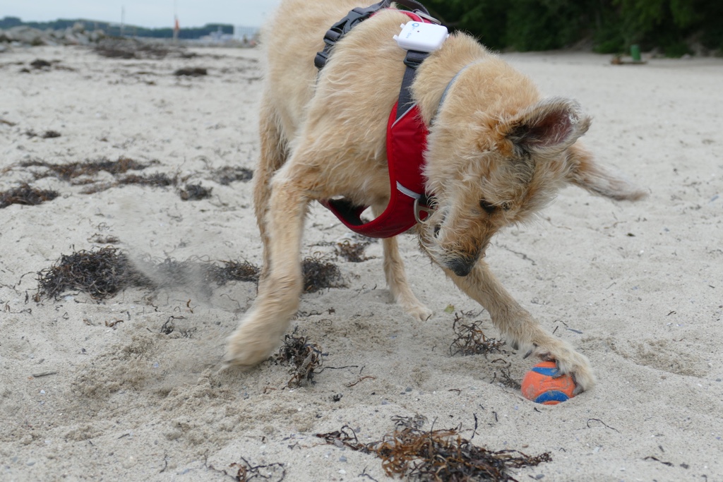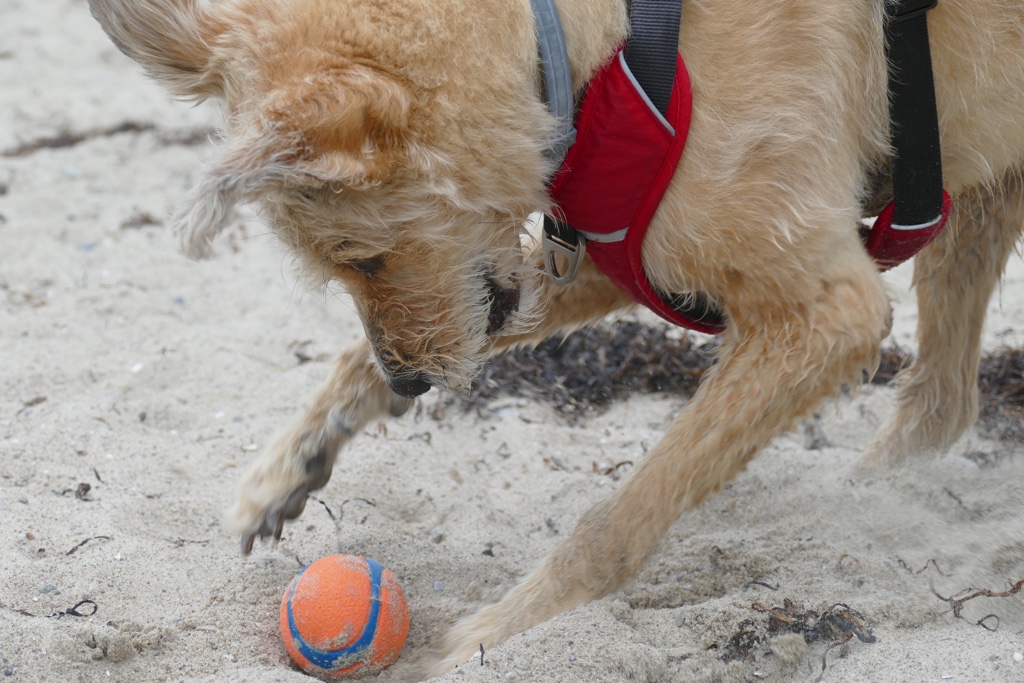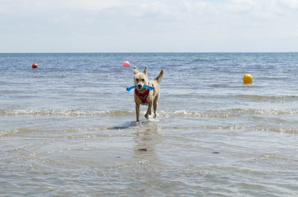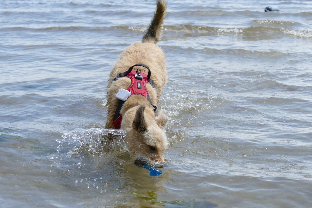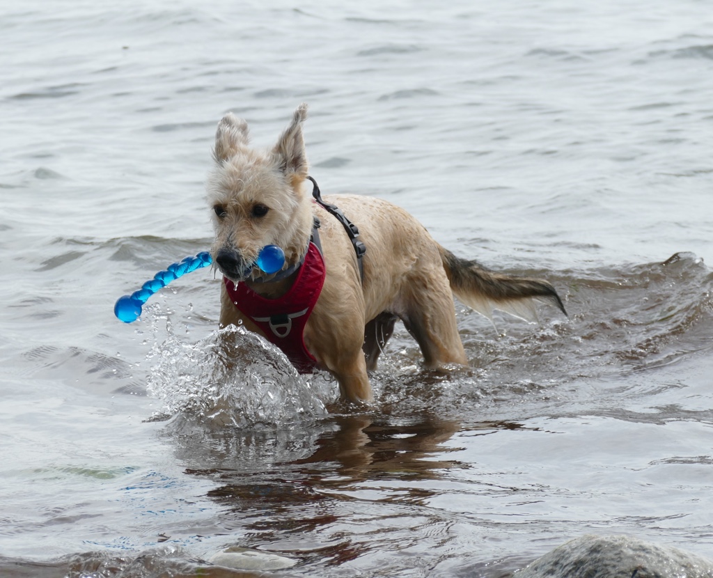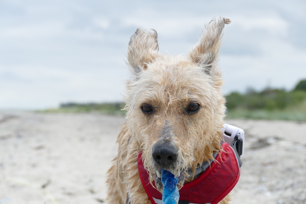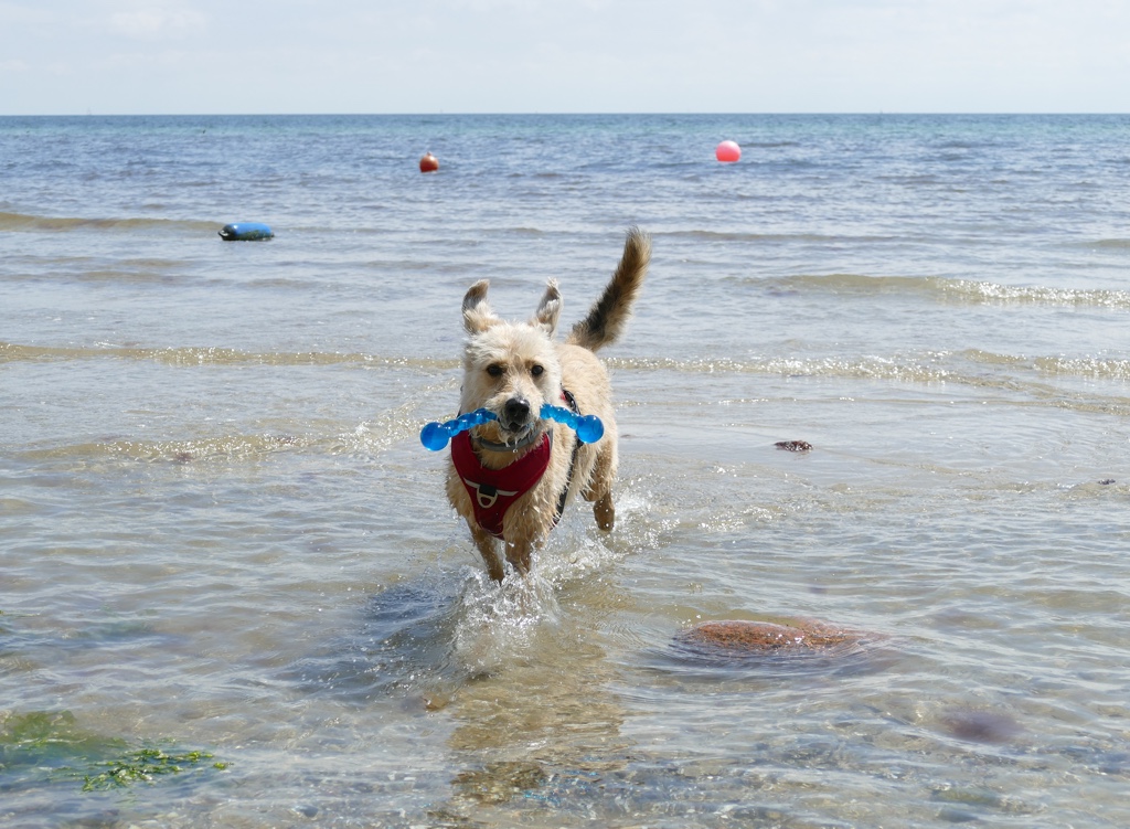 Ich bin natürlich erstmal ins Wasser geflitzt und habe probiert, ob das Meer schmeckt. Nein, es schmeckt immer noch nicht. Aber dann sind Frauli und ich einfach weitergelaufen. Es gab kleine Buchten, steinige Abschnitte, wunderschöne Sandbuchten und es war einfach total toll. Alles frei und nur wir beide und das Meer. Frauli hat an mehreren Stellen einfach Halt gemacht und mit mir gespielt. Ich finde es toll, wenn sie sich so richtig richtig viel Zeit nur für mich nimmt. Kein Handy, keine Kamera, keine Tricks. Einfach nur wir beide, ein Spielzeug und das Meer. Natürlich bin ich ständig ins Wasser gehopst und habe meinen Ball gerettet. Es war sooooo fantastisch großartig toll.