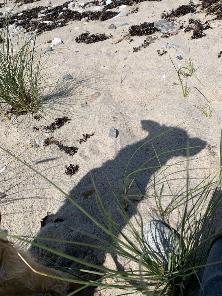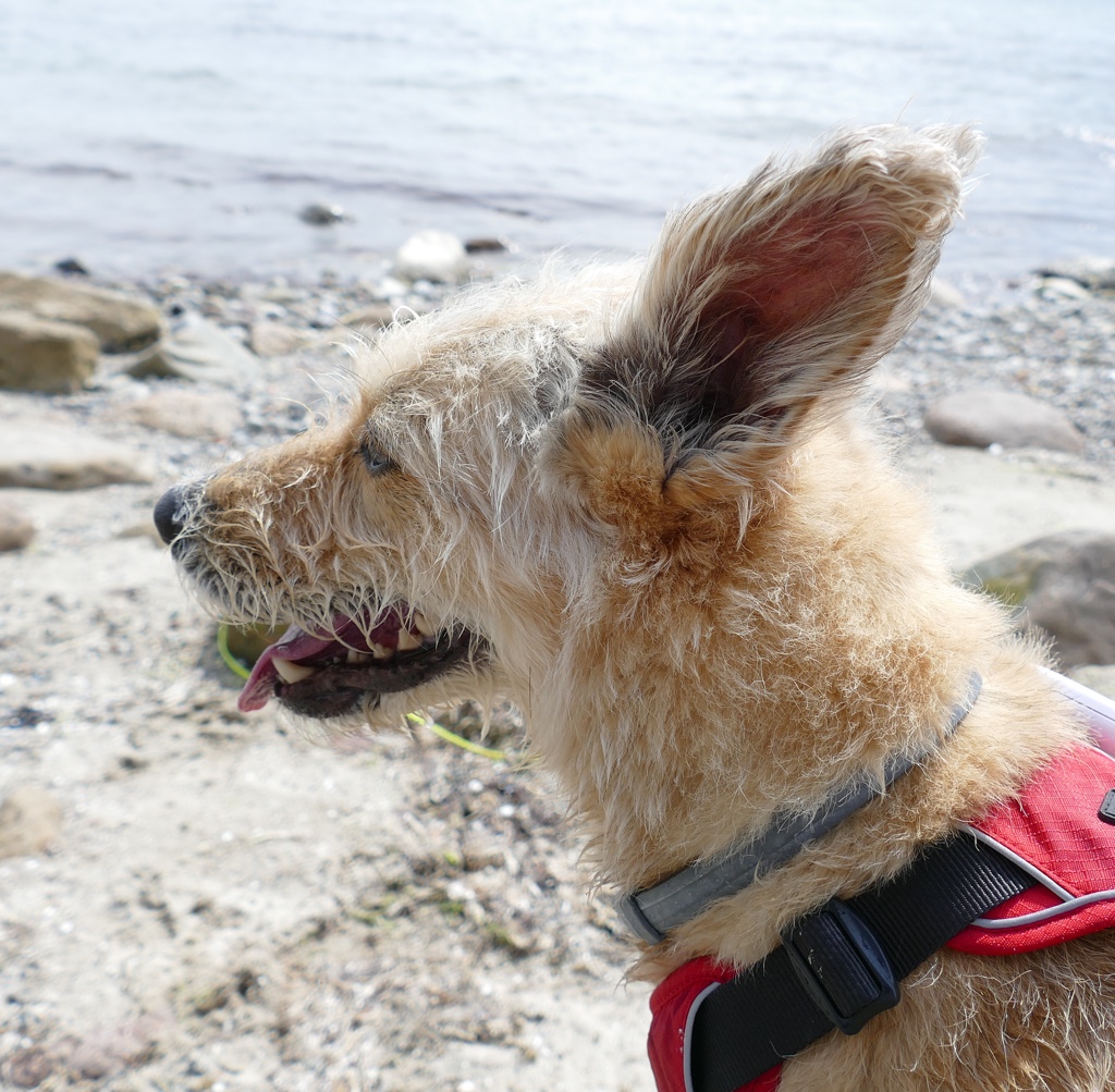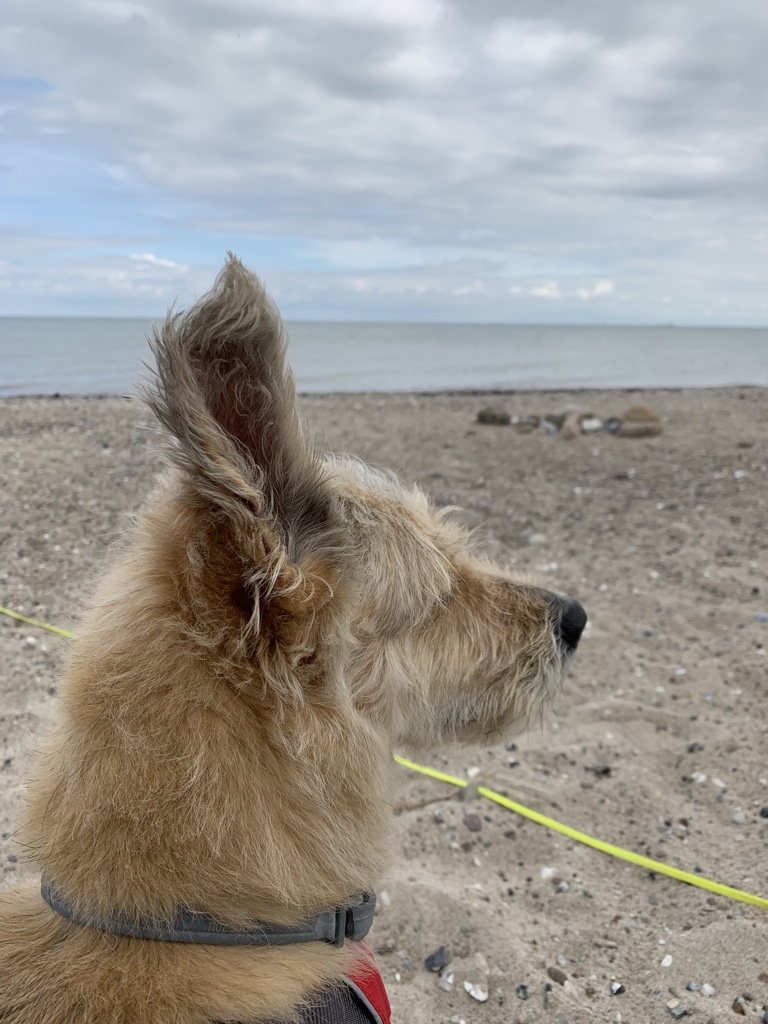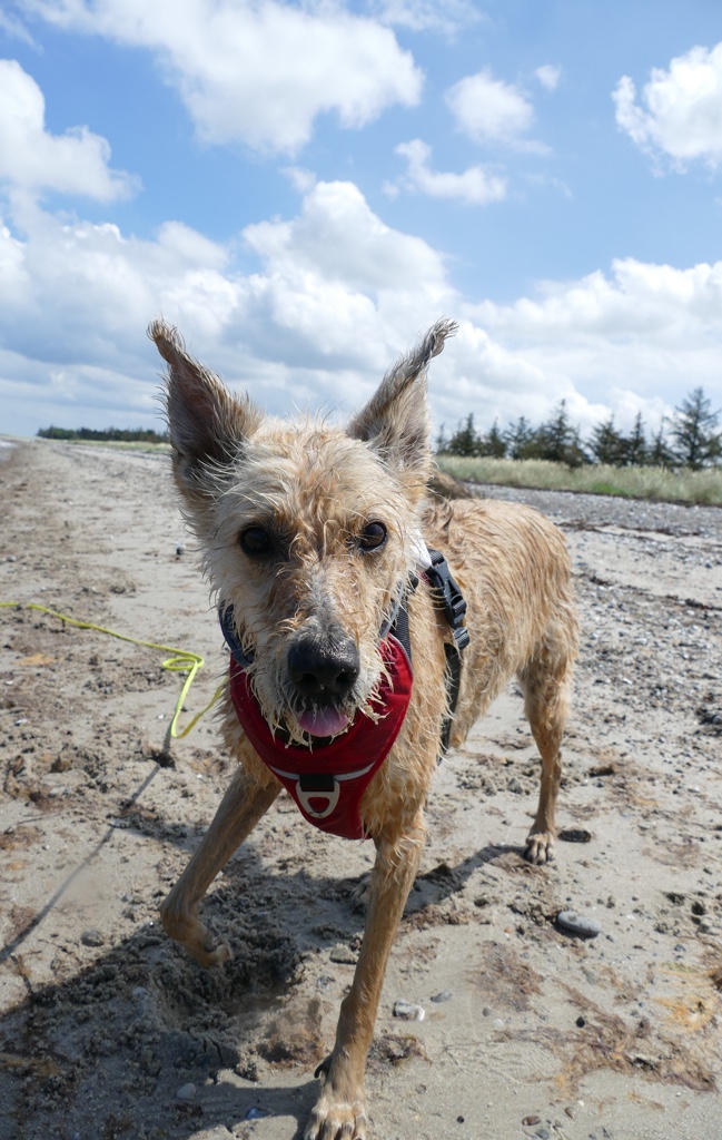 Hier waren wir auch am Längsten, da der Strand so wunderschön war und wir so ungestört waren. Ich hatte keine Steine am Ufer, sondern herrlichen Sand und bin rein und raus gesaust, wie ein Irrwisch. Oberhalb vom Strand war eine weite Grasebene auf der wir auch toll hätten laufen können, aber Grasebenen kenn ich schon und ich liebe den Sand unter den Pfoten. Leider konnten wir das Meer und den Strand nicht einpacken, also haben wir uns einfach so lang wie möglich dort aufgehalten und die Welt um uns total genossen. Der Wind, die salzige Luft, das Rauschen des Meers und den warmen Sand unter den Füßen. Ich bin einfach fürs Meer gemacht.