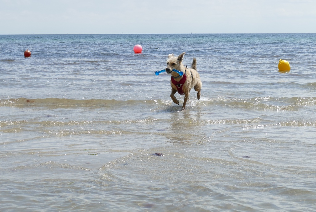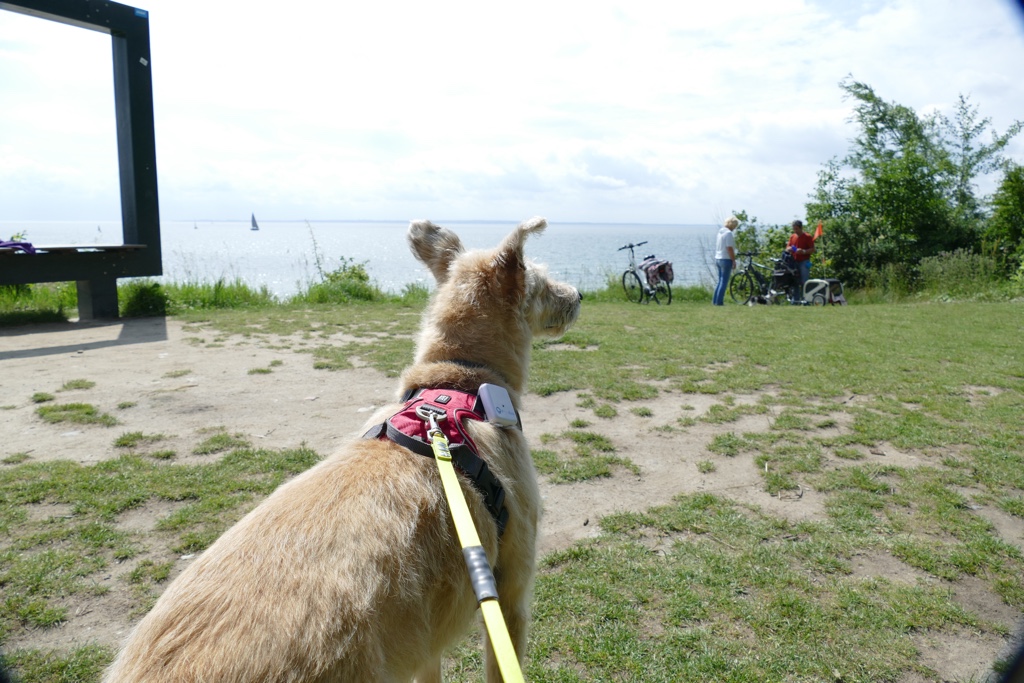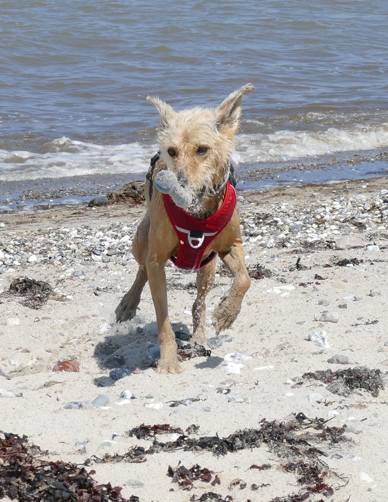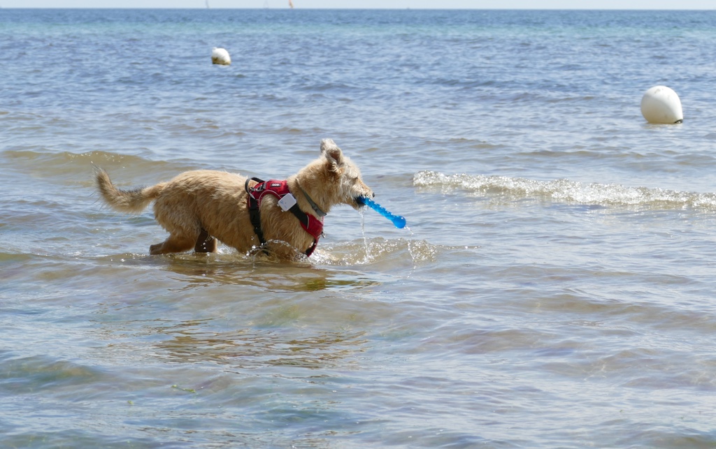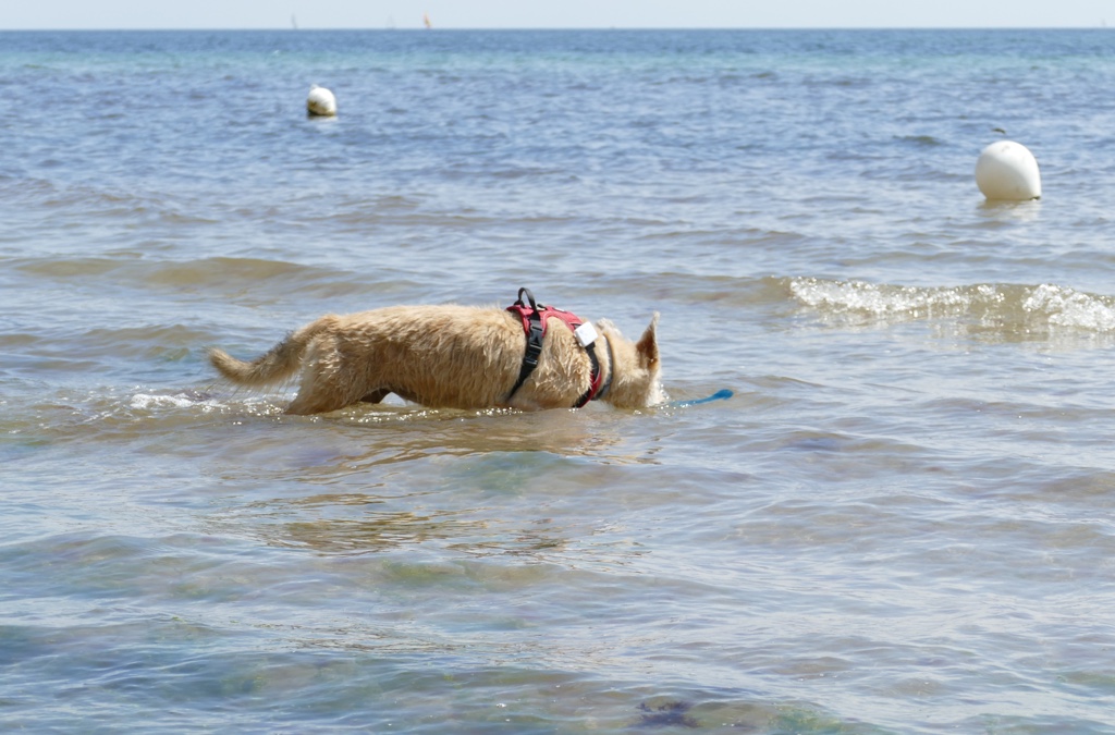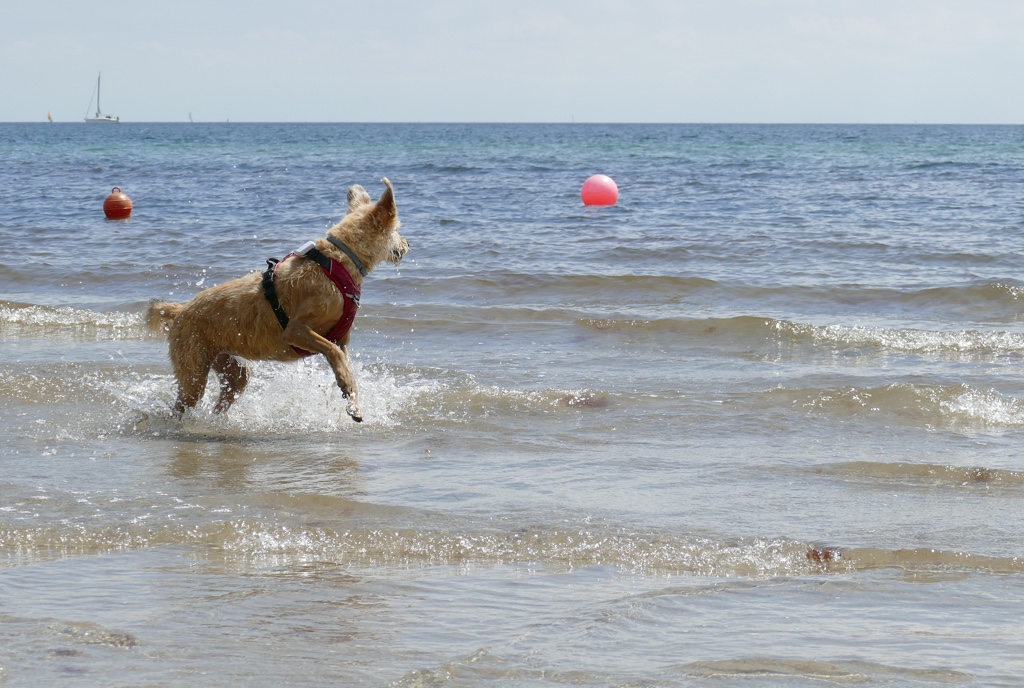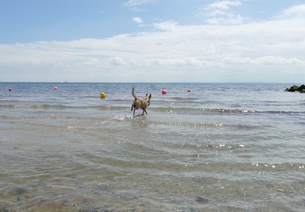 Nach einer Weile haben Frauli und ich eine ganz ruhige Sandbucht mit ganz flachem Wasser entdeckt. Da konnte ich wunderbar weit ins Wasser rennen und mein Spieli retten. Aber da waren so komische große Kugeln im Wasser. Erst wollte ich da nicht hin, weil die sich bewegt haben, aber alles anbellen und drumrumhopsen hat nix geholfen. Die blieben da, wo sie waren und irgendwann hab ich mich mal hingetraut und sie angesaust. Frauli hat mich ausgelacht und gemeint, dass die Teile Boje heißen. Ja und?? Die hätten mich ja trotzdem angreifen können! Tssss… Menschen und ihr „Wissen“. Pfff… Trotzdem, ich hab die Boje bezwungen und Frauli hat mir zwischendurch sogar eine Zwangspause verordnet, bis wir uns nach einer herrlich langen Zeit auf den Rückweg zum Franzl gemacht haben.