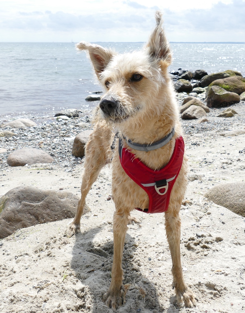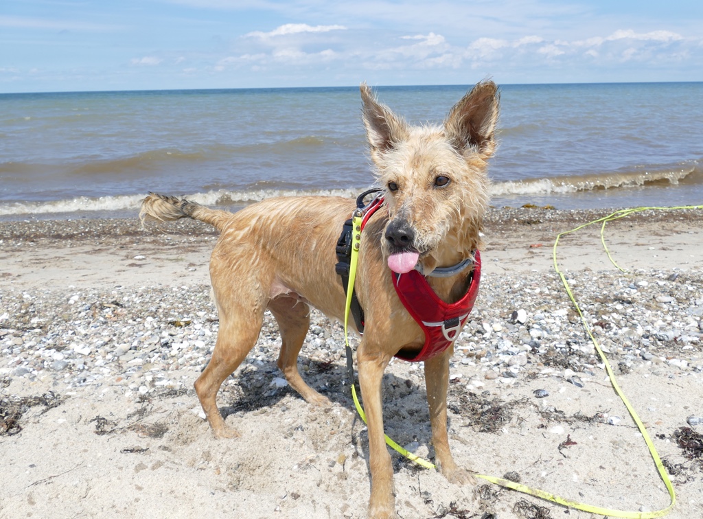 Frauli hatte erst den groben Plan mit mir nach Hohwacht zu fahren, wo wir vor mehreren Jahren schon einmal waren. Sie wusste, dass der Hundestrand dort toll und auch sehr groß ist. Also haben wir uns auf den Weg gemacht, aber schon auf der Autobahn haben wir gesehen, dass dort viele hinwollen. Kurzentschlossen ist Frauli weiter nach Fehmarn gefahren und hat ihr Glück ganz im Norden versucht. Eine Offenbarung! Wir waren so ziemlich die einzigen, die sich dort bis ganz in den Norden getraut haben. Nee, im Ernst. Es war wahnsinnig schön, 25 Grad, Sonne pur und wir hatten den Strand fast für uns alleine. Auf einem 5 km langen Strandabschnitt begegneten uns pro Kilometer 2-3 Leute und noch weniger Hunde. Ich war also so fast die Alleinherrscherin über den Strand.