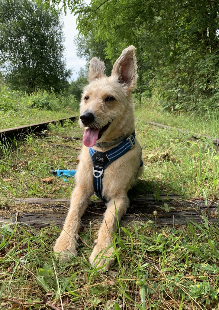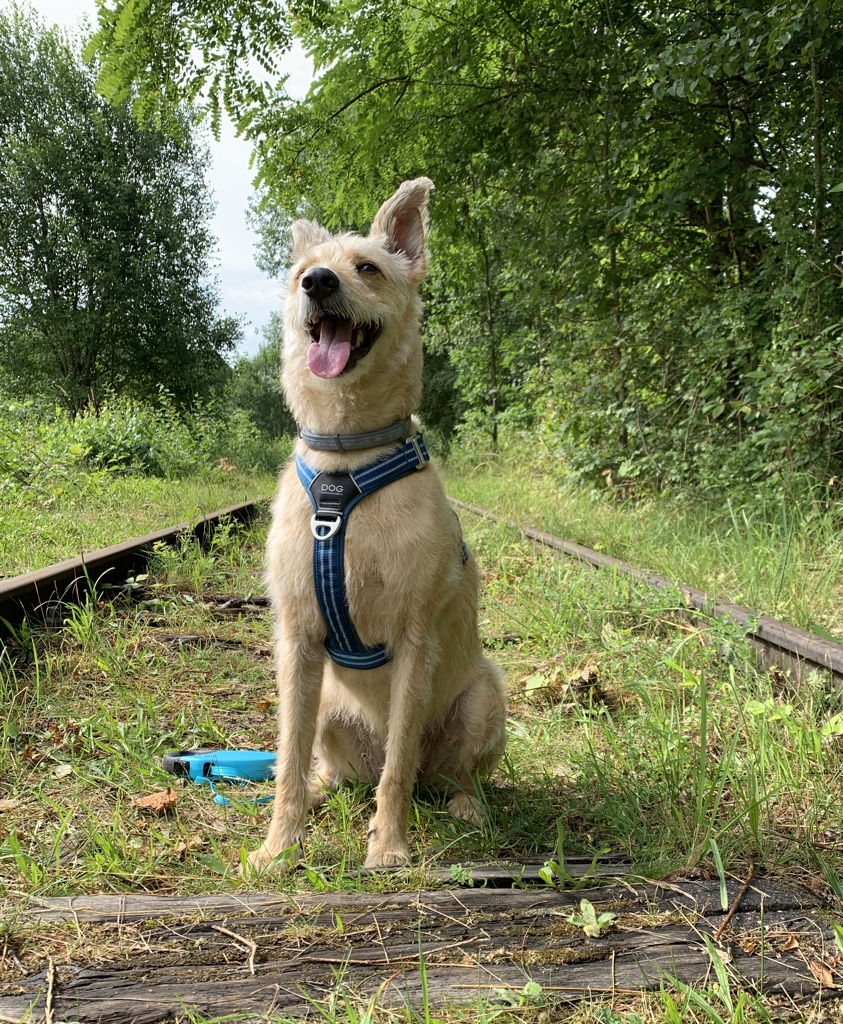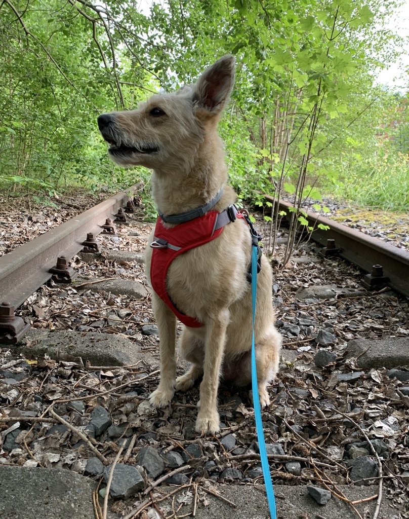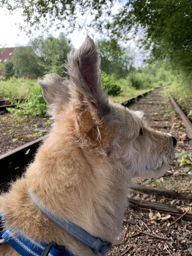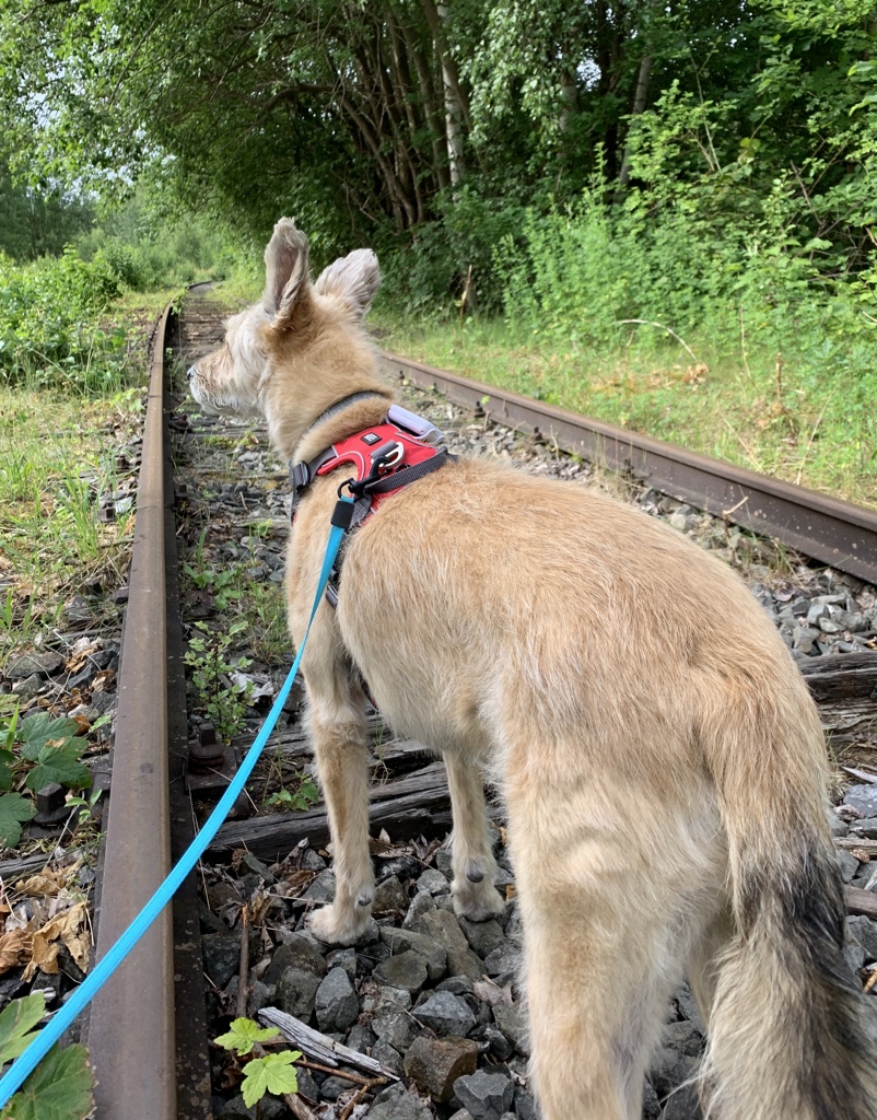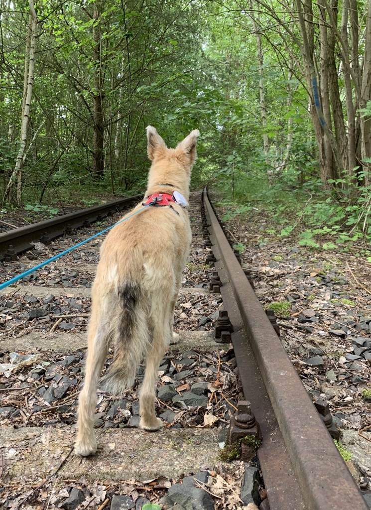 Am nächsten Tag ging es erst auf eine kleine Gassirunde und wir haben ein kleines Wegle ausprobiert und standen prompt am Übungsgleis. Das war ja toll! Da konnte ich jede Menge schnüffeln und Einhütetraining machen. Das ist nämlich nicht so einfach, wie es bei Malaika immer aussieht.  Aber ich war schon sehr beruhigt, weil ein Baum mitten auf dem Gleis lag, dass da kein Zug kommt. Frauli und ich hatten jedenfalls jede Menge Spaß in dem kleinen Wäldchen, durch das die Gleise führten.