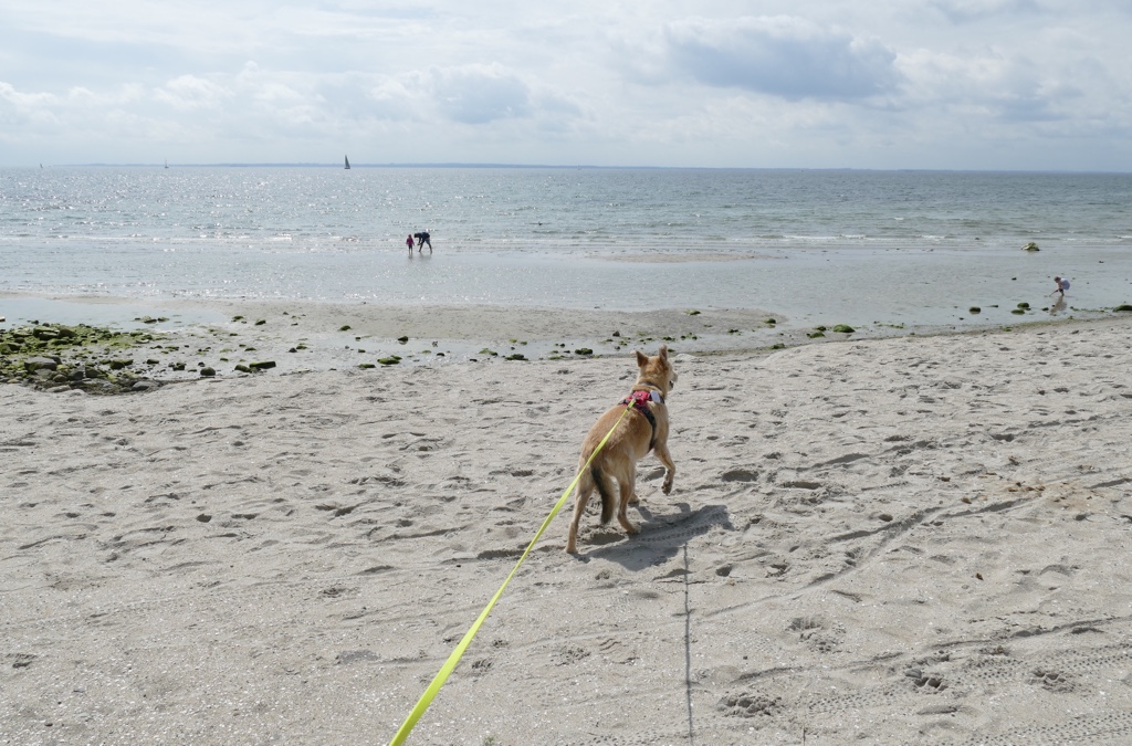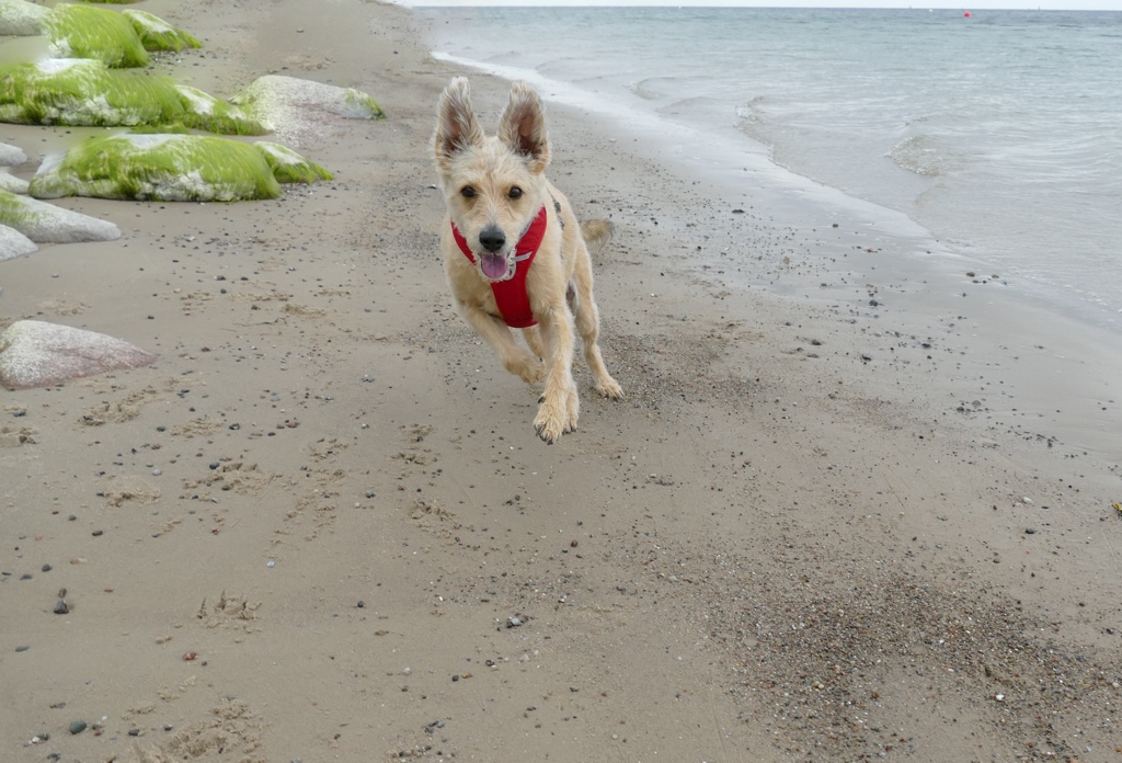 Und alle sind frei gelaufen! Ich wusste gar nicht, was ich machen soll. Frauli hat mich dann auch abgeleint, damit ich Bewegungsfreiheit habe. Da kam doch glatt so ein schwarzer Hund zu mir her und hat mich angebaggert. Dem hab ich dann aber gezeigt, wie schnell ich bin. Das war dann richtig toll. Ja, ich gebe zu, das hat auch Spaß gemacht. Ein bisschen… Er musste dann nach Hause und wir sind weitergelaufen. Immer am Strand entlang. Das war echt toll. Ich bin ins Meer gezischt (schmeckt immer noch nicht) und wieder raus und habe mich paniert und habe gespielt, gebuddelt, erkundet und einfach den Tag genossen. Wir waren auch fast alleine. Ab und zu kam mal jemand angestiefelt, aber die konnten wir ignorieren, weil sie uns weit umrundet haben.