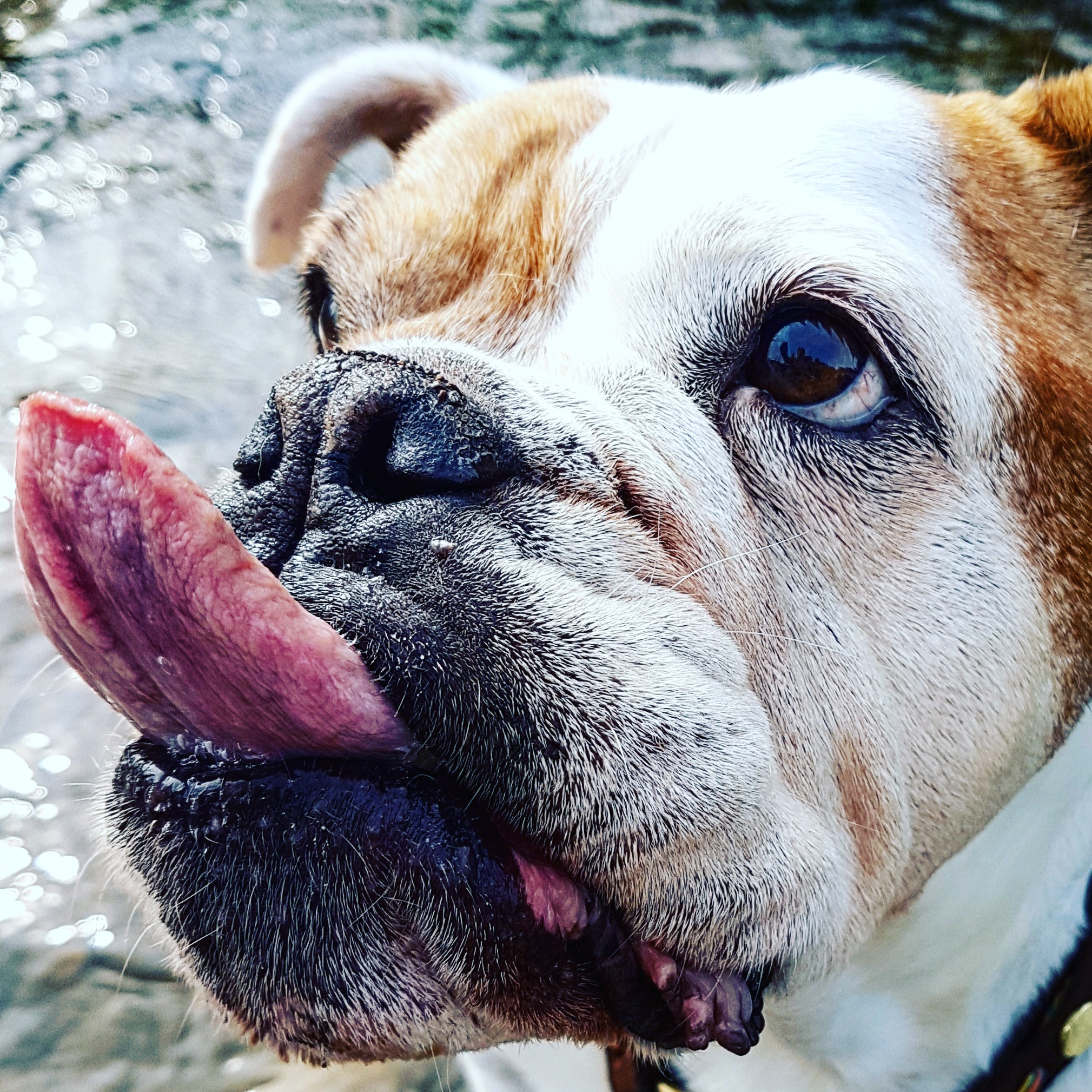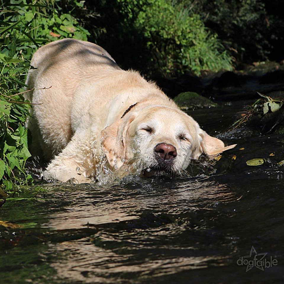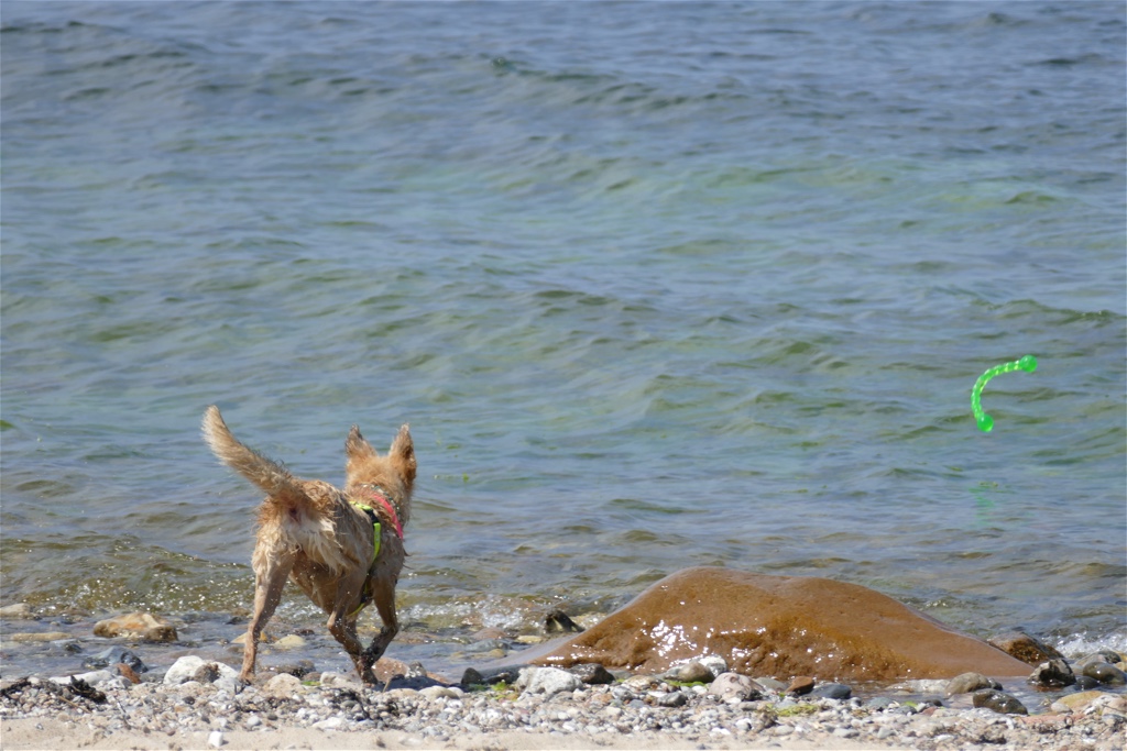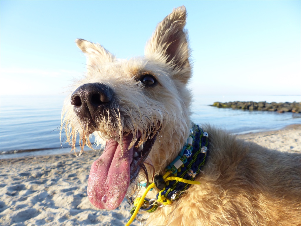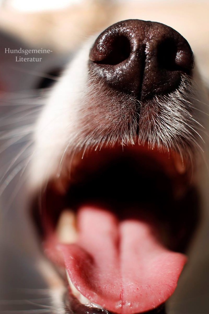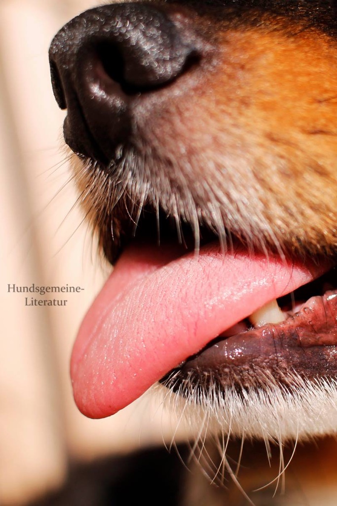 Die hündische Zunge ist ein wahrer Künstler. Sie kann sich in sämtliche Richtungen ewig lang um die Schnauze schlängeln. Sie kann auch die pure Liebe bekunden und geradewegs ins Gesicht seines Menschen tragen. Habt ihr schon mal einen Hund trinken sehen? Die pure Ästhetik. Und saumäßig raffiniert. Es ist nicht so, dass unsereins eine Schaufel mit der Zunge formt und so das Wasser in die Schnauze hebelt, nein nein, das wäre ja total lahm. Wir stecken die Zunge ins erfrischende Nass und ziehen sie dann ganz schnell zurück, das Wasser kommt mit und wird in der Schnauze freudig in Empfang genommen. Außerdem ist die Zunge noch eine Klimaanlage. Beim Hecheln können wir den Körper wunderbar abkühlen. Nur wenn es ganz ganz heiß ist, kommt die Klimaanlage nicht mehr ganz mit und wir brauchen Unterstützung, aber da hilft ein erfrischendes Bad in einem See, Fluss oder dem Meer wunderbar. Ich sag doch: Wunderwerk.