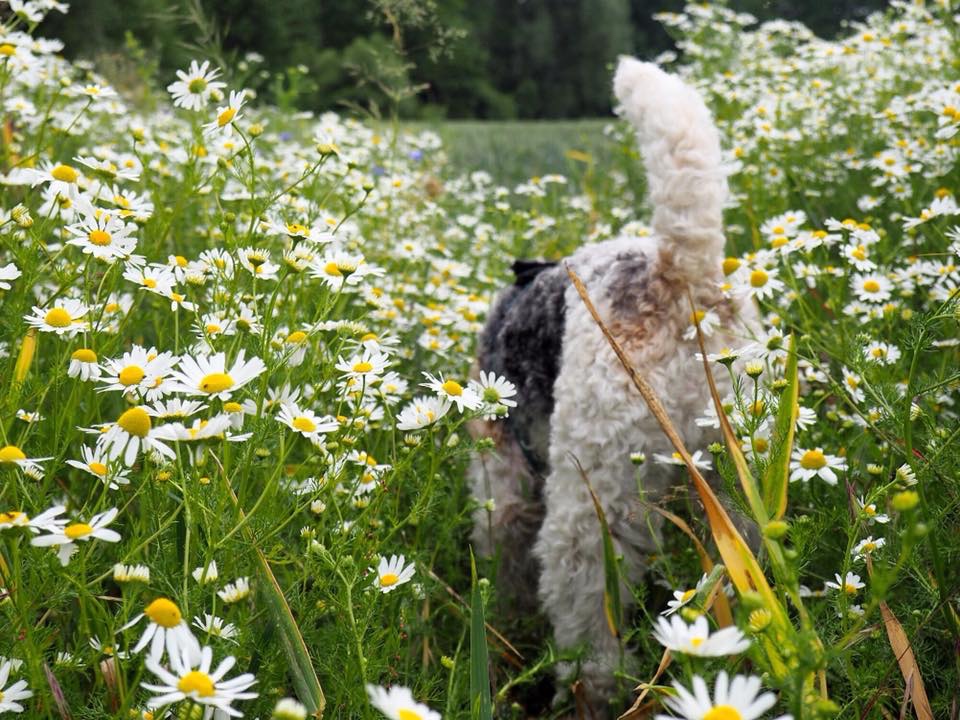 Mein Stimmungsbarometer. Bin ich aufgeregt, wedelt das Teil hinten. Das kann hoch erhoben fast kreiselnd sein, dann freu ich mich. Wedelt der halbe Hund mit, freu ich mich sehr. Wedle ich nur verhalten und sehr flach, bin ich zwar aufgeregt, aber auch gestresst. Muss nicht positiv, aber auch nicht zwingend negativ sein. Einfach vorsichtig. Bin ich unsicher dann zieh ich meine Rute ein, mal nur ein bisschen, so dass sie knapp zwischen den Hinterpfoten hängt, habe ich Angst oder Panik, dann trage ich meine Rute als Krawatte. Bin ich fröhlich, dann hebe ich meine Rute an. Sie muss nicht zwingend nach oben stehen wie beim Beagle, der sie ja immer wie eine Antenne hochhält. Aber sie ist erhoben und zeigt, dass ich gut gelaunt bin. Im Ruhemodus, wenn ich die Landschaft scanne oder grade vor mich hin träume, dann hängt sie entspannt runter und oft bewegt sich die Spitze leicht. Beim Rennen brauche ich sie auch und zwar als Gleichgewichtssensor, wenn ich nämlich so um die Kurven fetze, dann muss sie die Kurvenlage ausgleichen und wird entsprechend unter Anspannung gestreckt und gedreht. Ich sag doch: Wunderwerk.