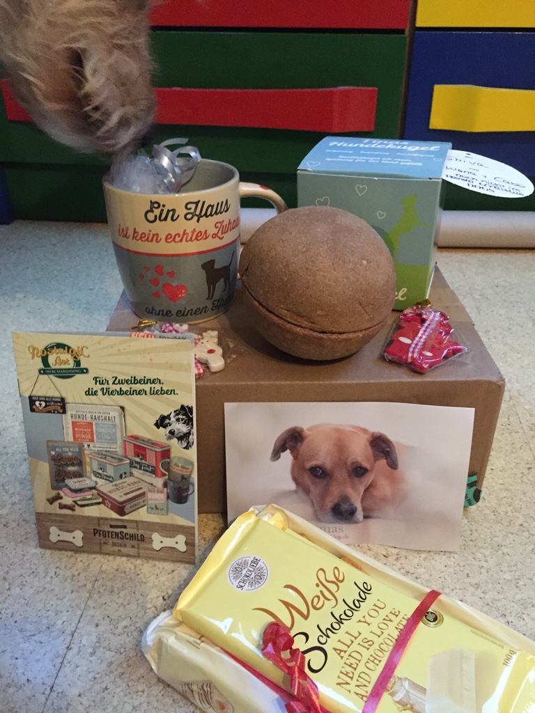 Natürlich hab ich beim DogBlogger Wichteln mitgemacht. Wie jedes Jahr wurde es organisiert von Steffi mit ihren beiden Cockern Ren und Stimpy. Wen ich bewichtelt habe, verrate ich hier natürlich nicht. Ich hoffe nur mein Wichtel freut sich und hat viel Spaß damit. Ich selber wurde von Silvana und Cabo bewichtelt. Und ich muss sagen. Die beiden haben aber exakt das richtige ins Paket gepackt. Ich war hin und weg und habe alles gebraucht, dass meine Motte ihre Schnute aus dem Karton nimmt. Übrigens… Die Tasse ist der totale Knaller. Ich bin schon länger scharf drauf gewesen und jetzt darf ich sie doch glatt mein Eigen nennen. Das ist so großartig.