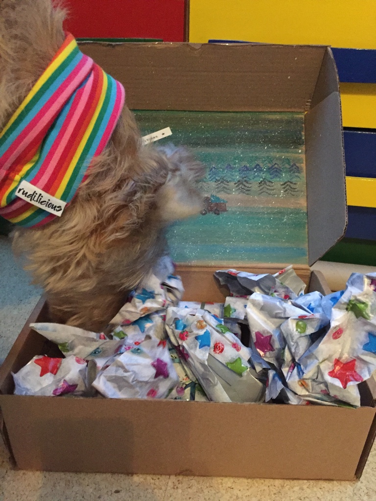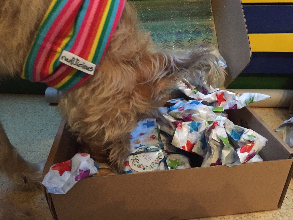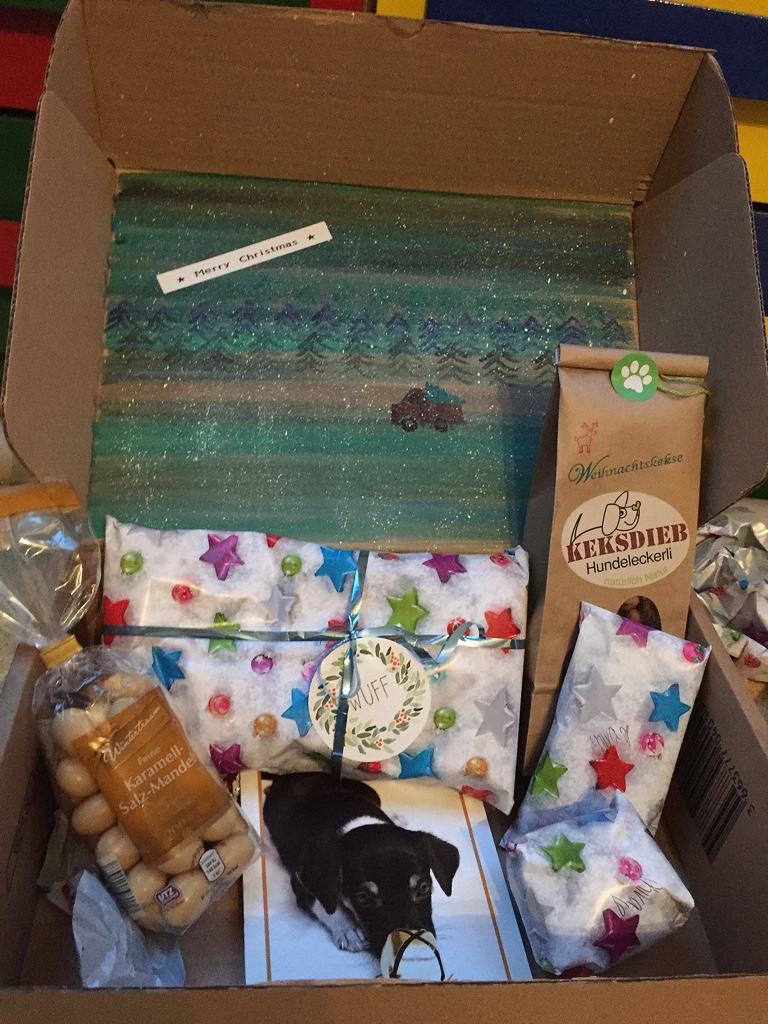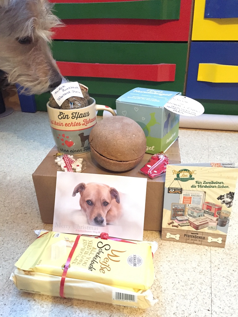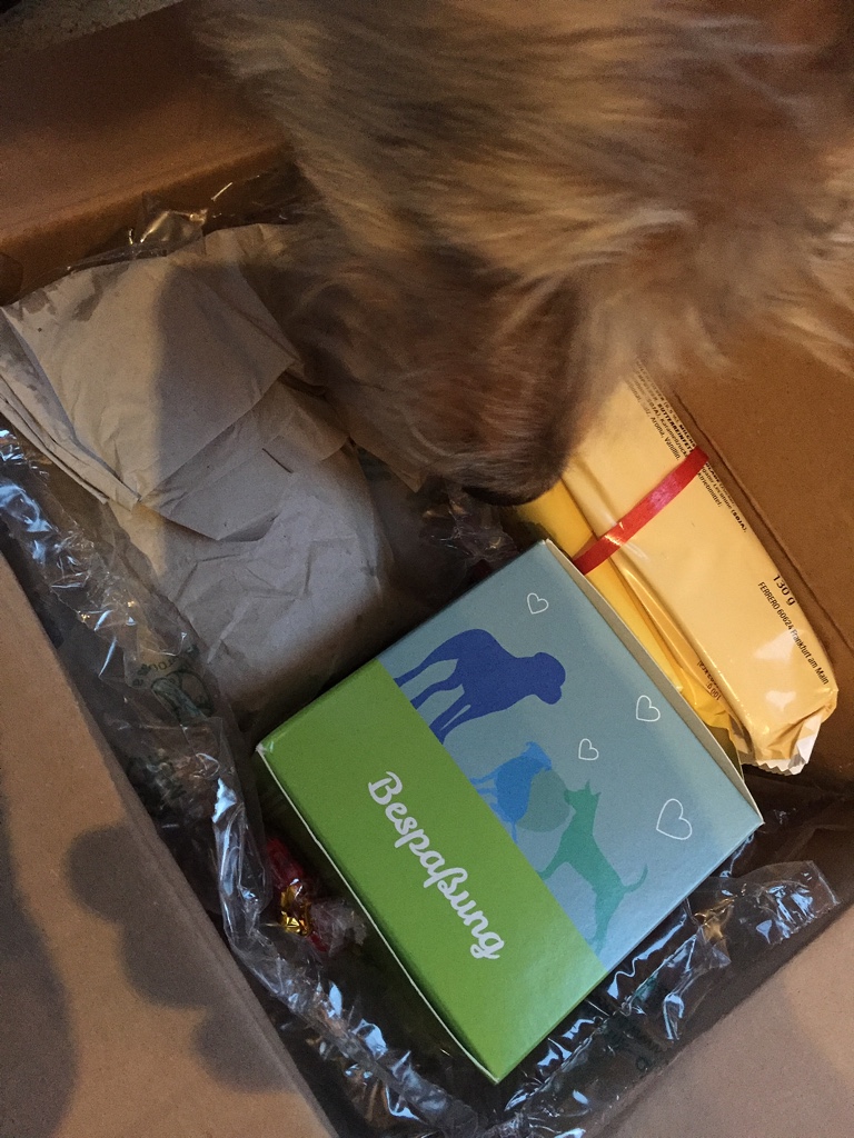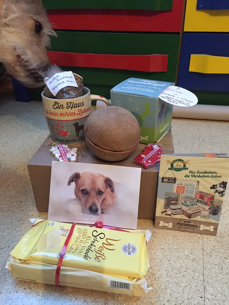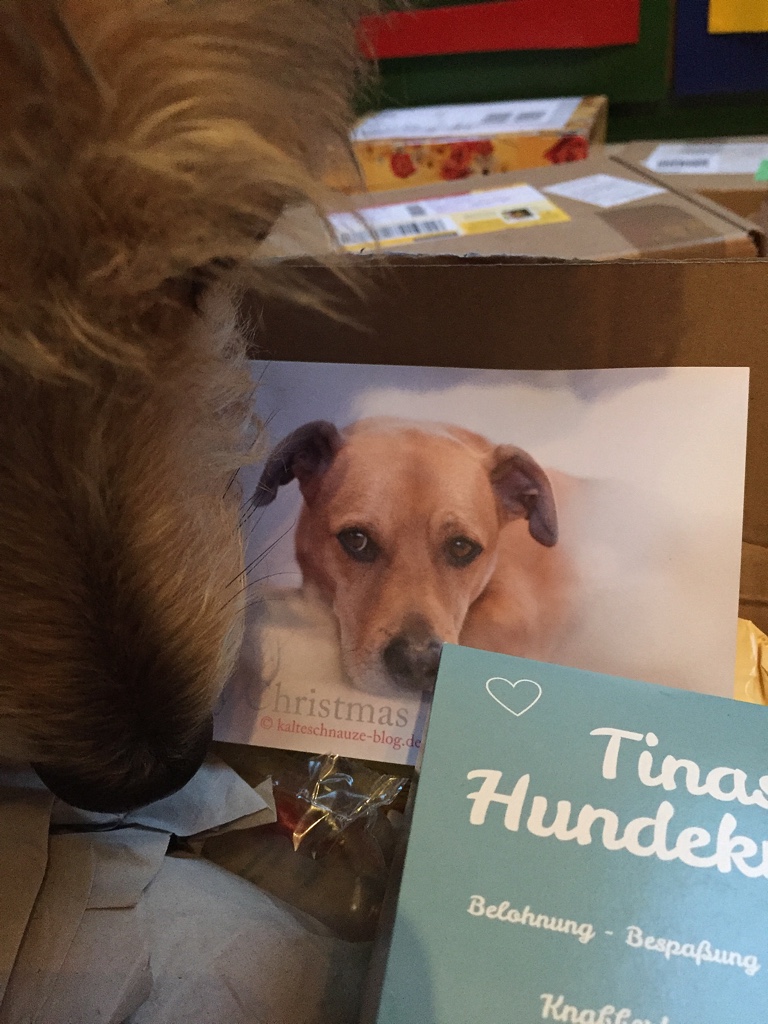 Natürlich reicht uns ein Wichtel nicht aus. Wir haben doch prompt bei noch weiteren Wichteln mitgemacht. Zum Beispiel das Wichteln der Pfotografie-Gruppe, wunderbar organisiert von der Gründerin der Gruppe Stephie von The Pell-Mell-Pack aka Enkies und Lunas Frauchen. Ja, ihr lest richtig. Die Frau ist ein Phänomen. Sie organisiert alles mögliche und staubt nebenher noch den Gewinn beim Adventsgewinnspiel ab. Klasse, oder? Aber zurück zum Wichtel. Uns erreichte ein Päckchen, das Shiva nicht mehr aus den Augen lies. Es musste also besonders gut duften. Was kann da nur drin sein? Nachdem der Karton an einer Ecke angefressen wurde, habe ich das Päckchen geöffnet.