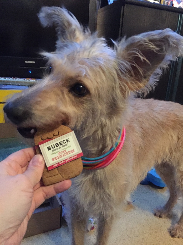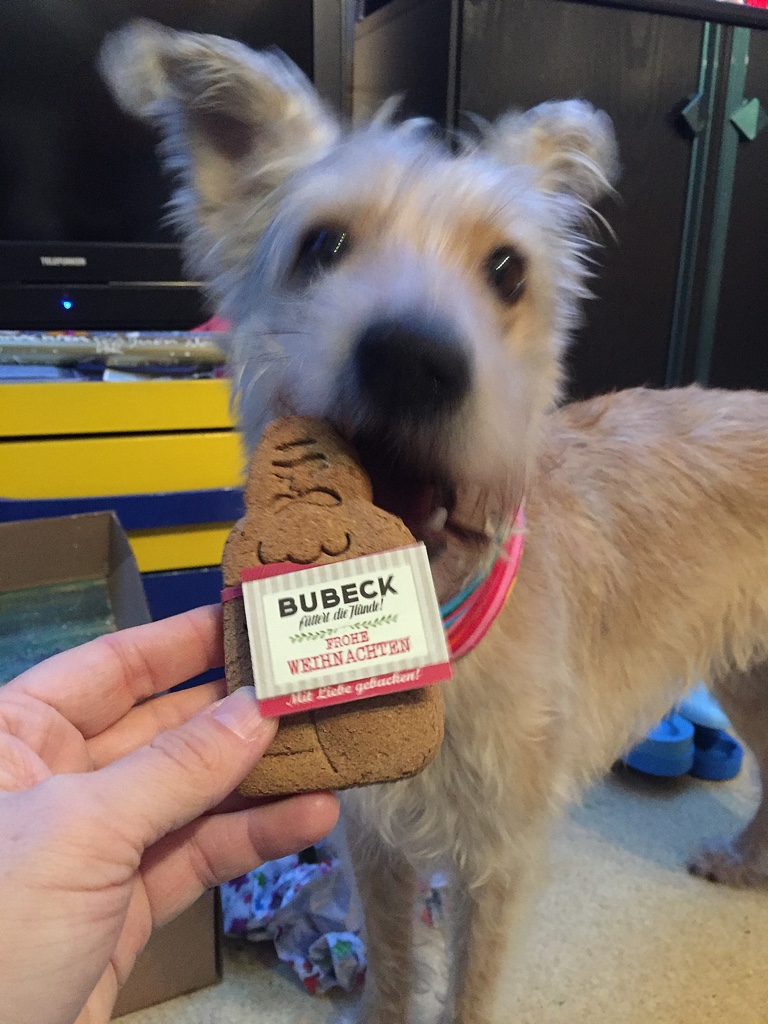 Okay, es war für uns beide und Shiva ist ziemlich begeistert mit ihren Geschenken abgezogen. Vor allem hatte ich den ganzen Abend noch was von der Kekskugel, deren eine Hälfte sie mir im Minutentakt woanders verbuddelt hat (unter anderem im frisch bezogenen Bett).